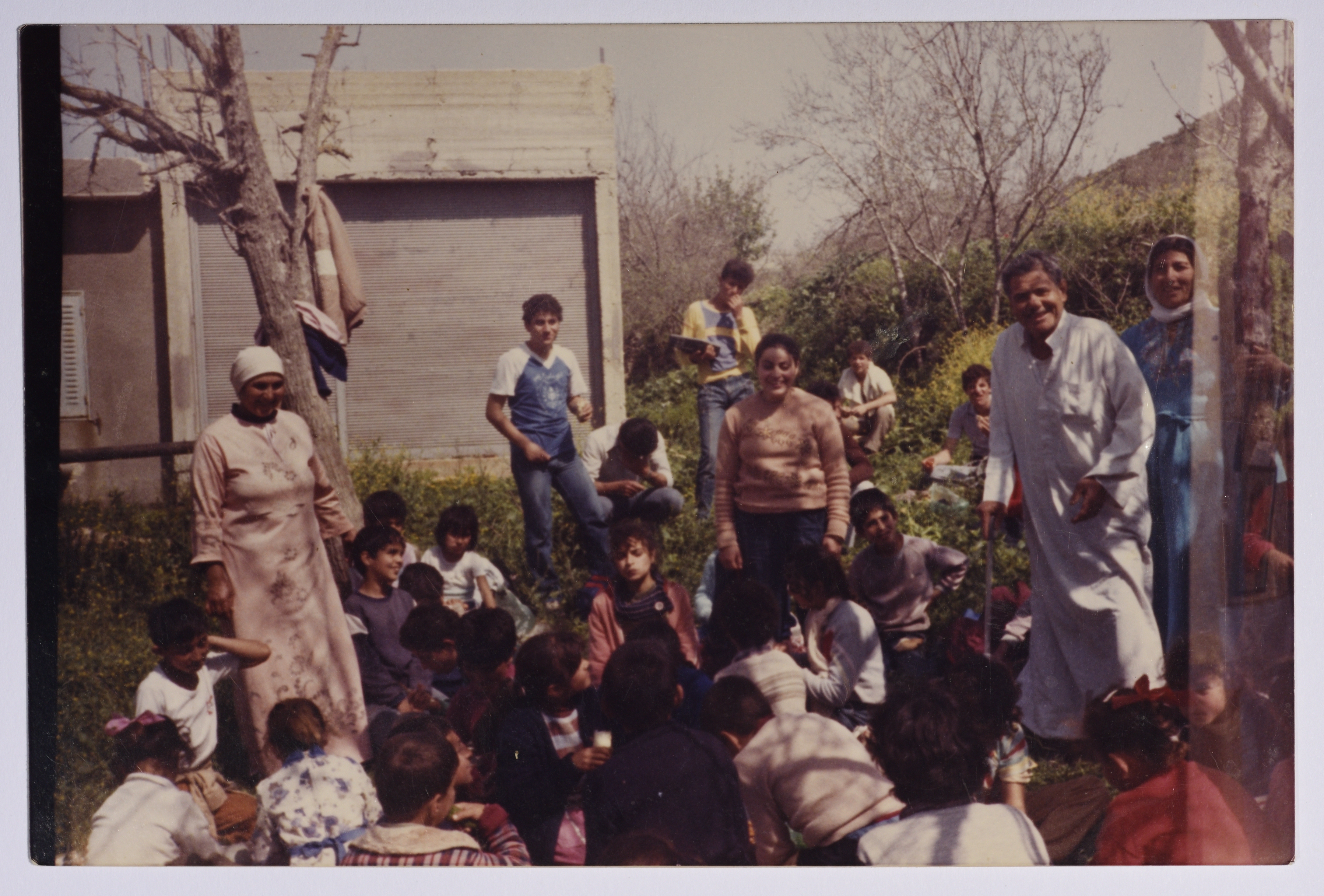 Taken in the early 1980s, this colour photograph features Rajih al Salfeety in ‘ein al-Matwi with children participating in a summer camp held by Salfit Workers' Union. Surrounded by pieces of land that are planted yearly by those living nearby, ‘ein al-Matwi spring is located to the west of Salfit.