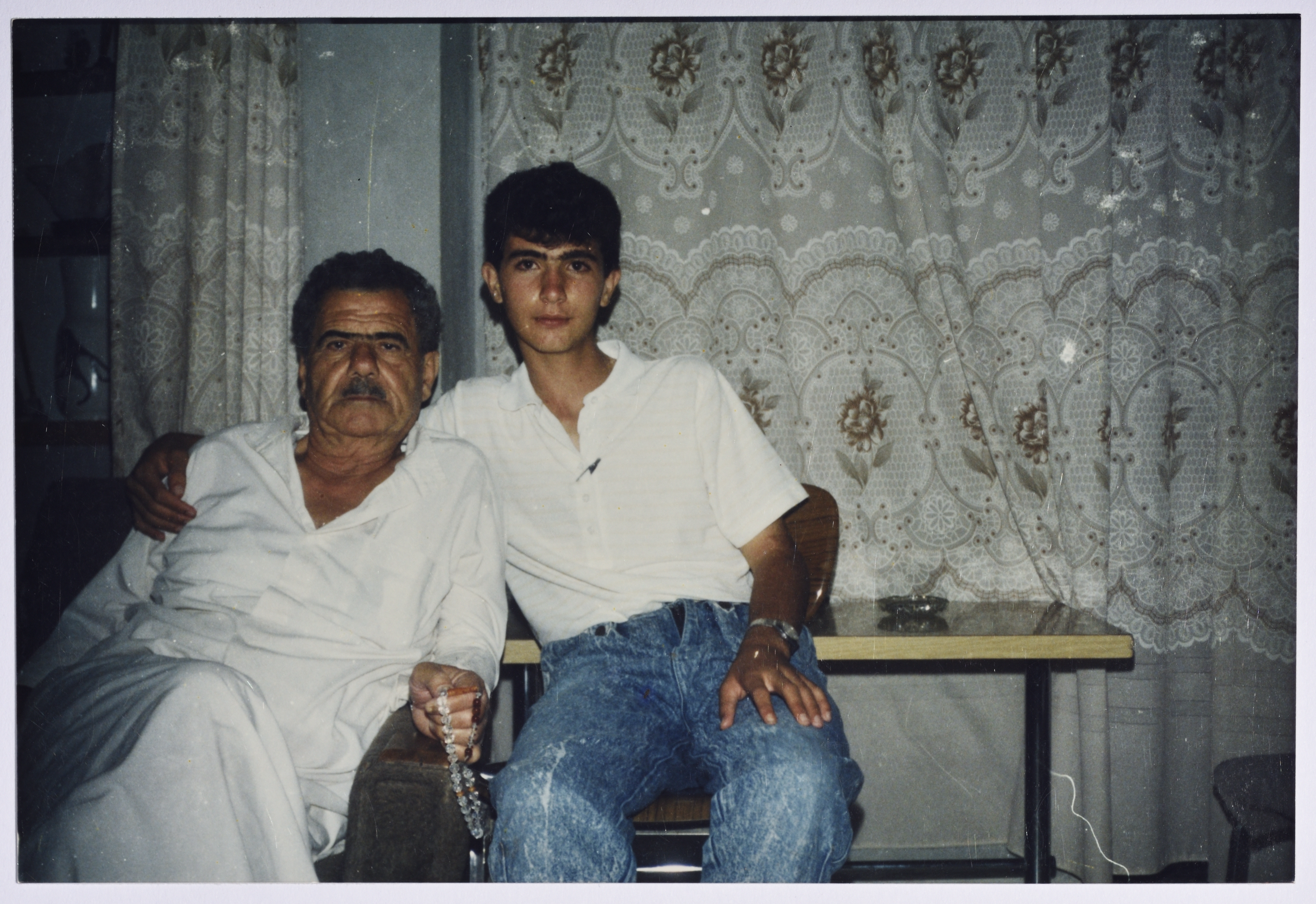 A colour photograph of Rajih al Salfeety and his son. His son "Ahmad" is leaning his shoulder on his father's; this photo was taken in the poet's house in Salfit on the engagement of his youngest daughter "Duha".