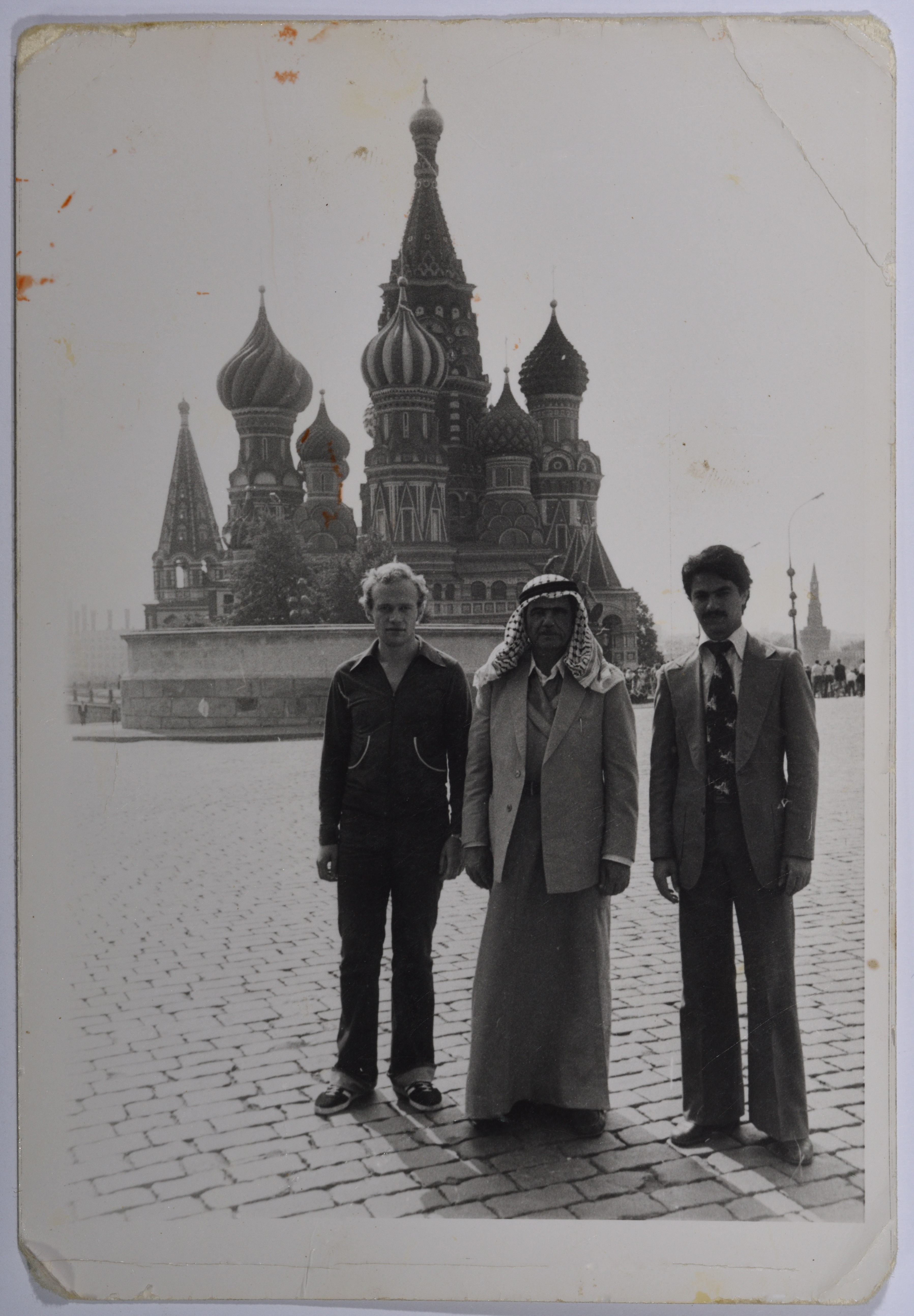 Taken in 1982, this black-and-white photograph features Rajih al Salfeety in Moscow the Capital of the Soviet Union at the time, where he went for treatment of Asthma. In front of St. Basil's Cathedral, al Salfeety is seen, in the middle, with his friends.
