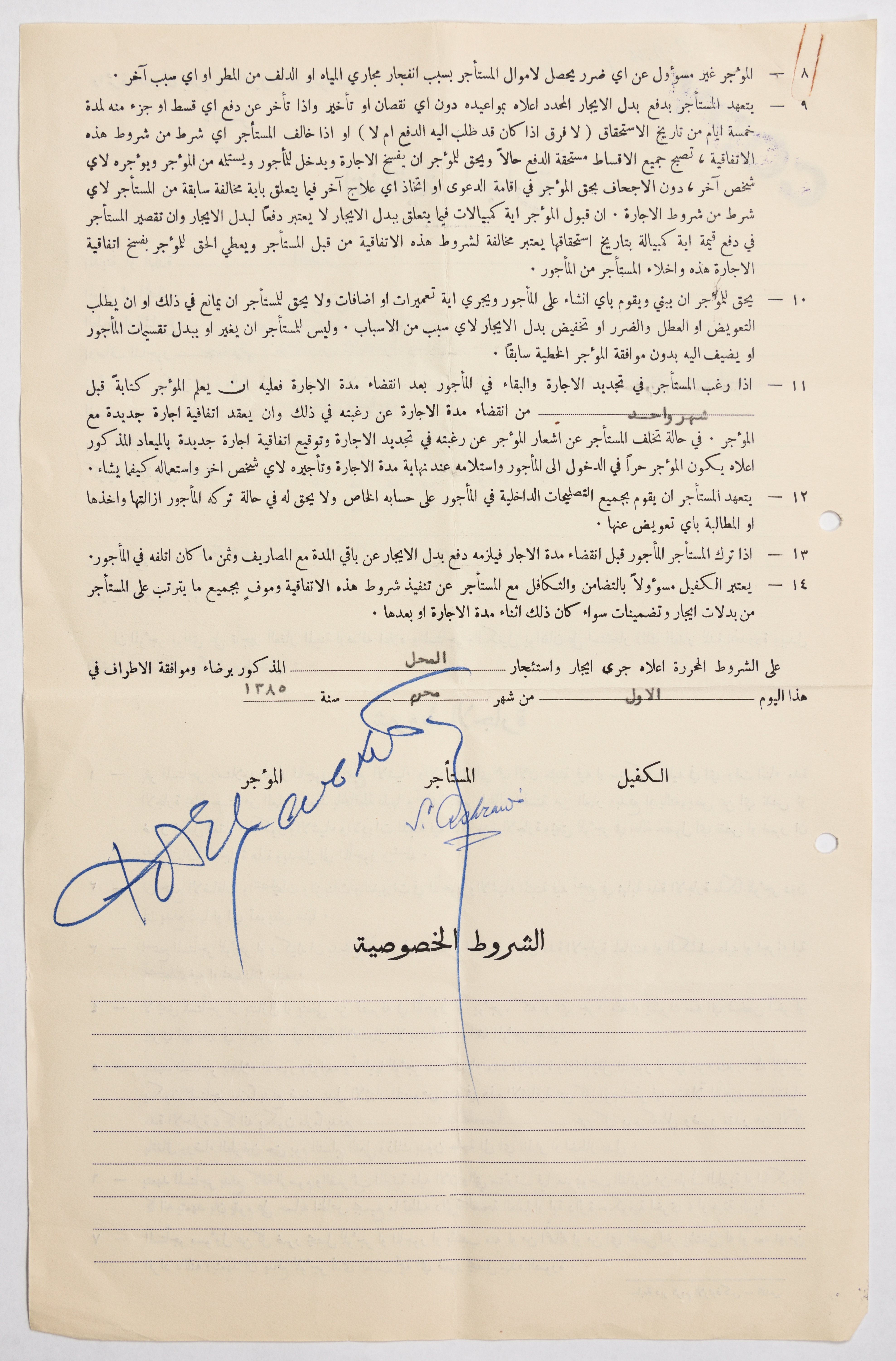صورة من عقد إيجار منزل بين بطريركية الروم الأرثوذكس و السيد سمعان عشراوي، وقد تم العقد بين المطران خريسانثوس والمستأجِر نيابةً عن بطريركية الروم الأرثوذكس. هذا ويتضمن العقد: عنوان السكن، وصفاً له، اسم المؤجِّر والمستأجِر، بدل الإيجار السنوي، وكيفية تأدية بدل الإيجار.