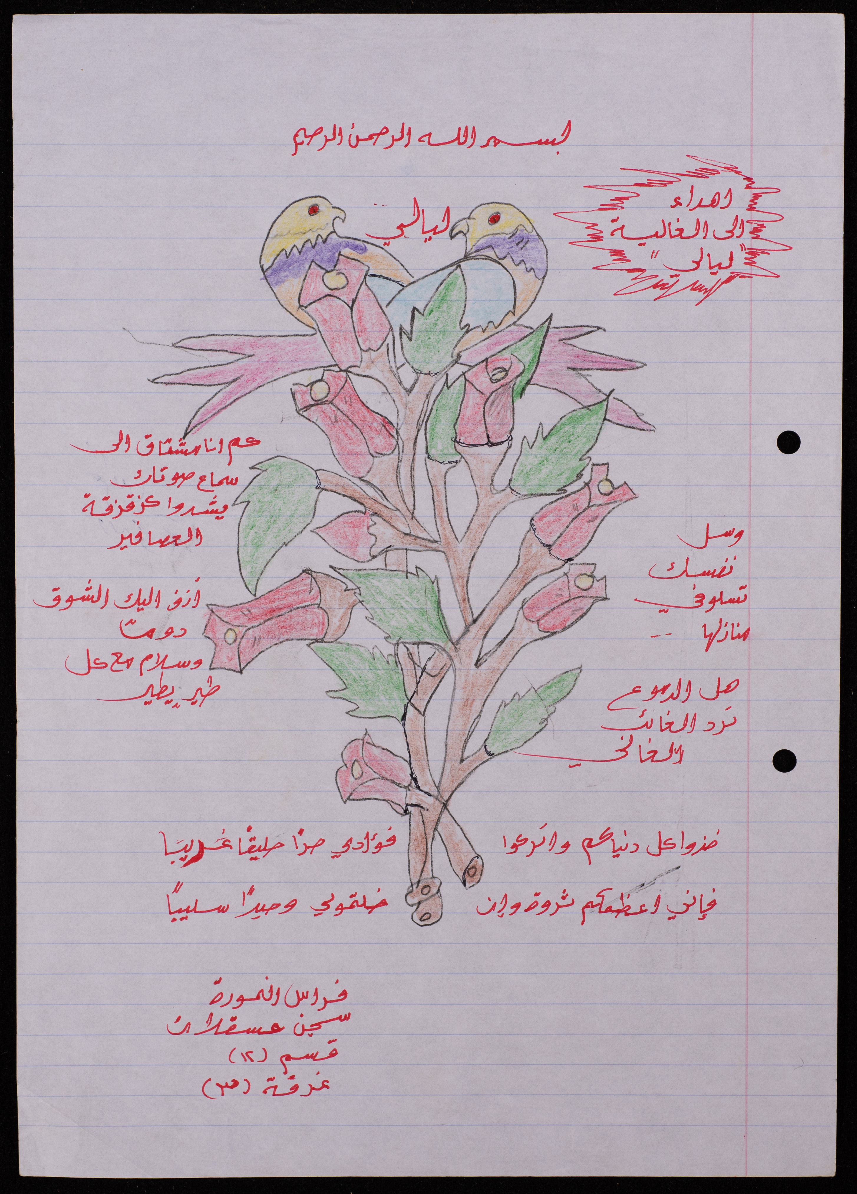 بطاقة إهداء من فراس النمورة المعتقل في عسقلان قسم (12) إلى أخته ليالي، تحمل لوحة فنية مرسومة باليد إضافة لكتابته شِعر باللغة العربية.