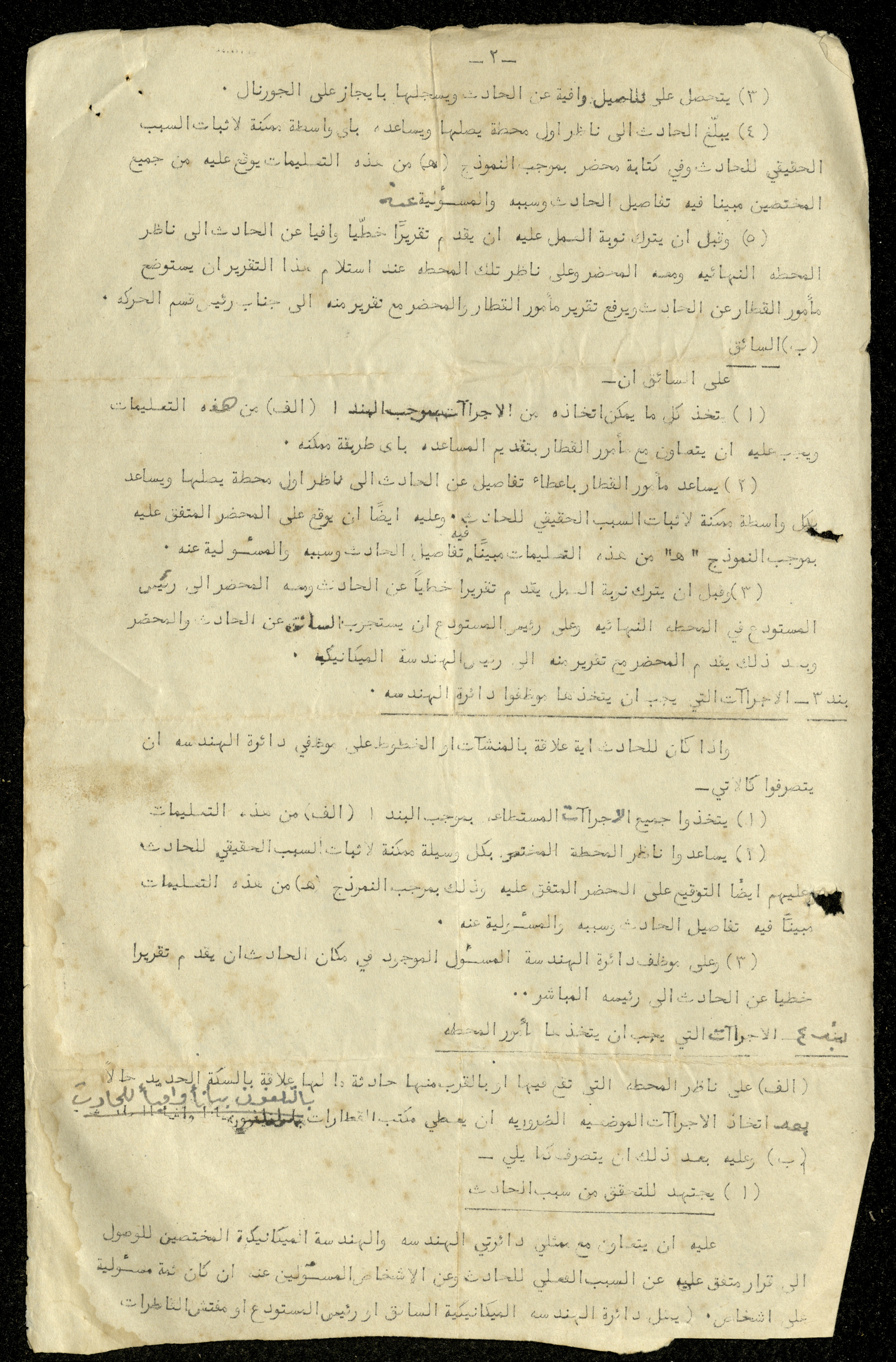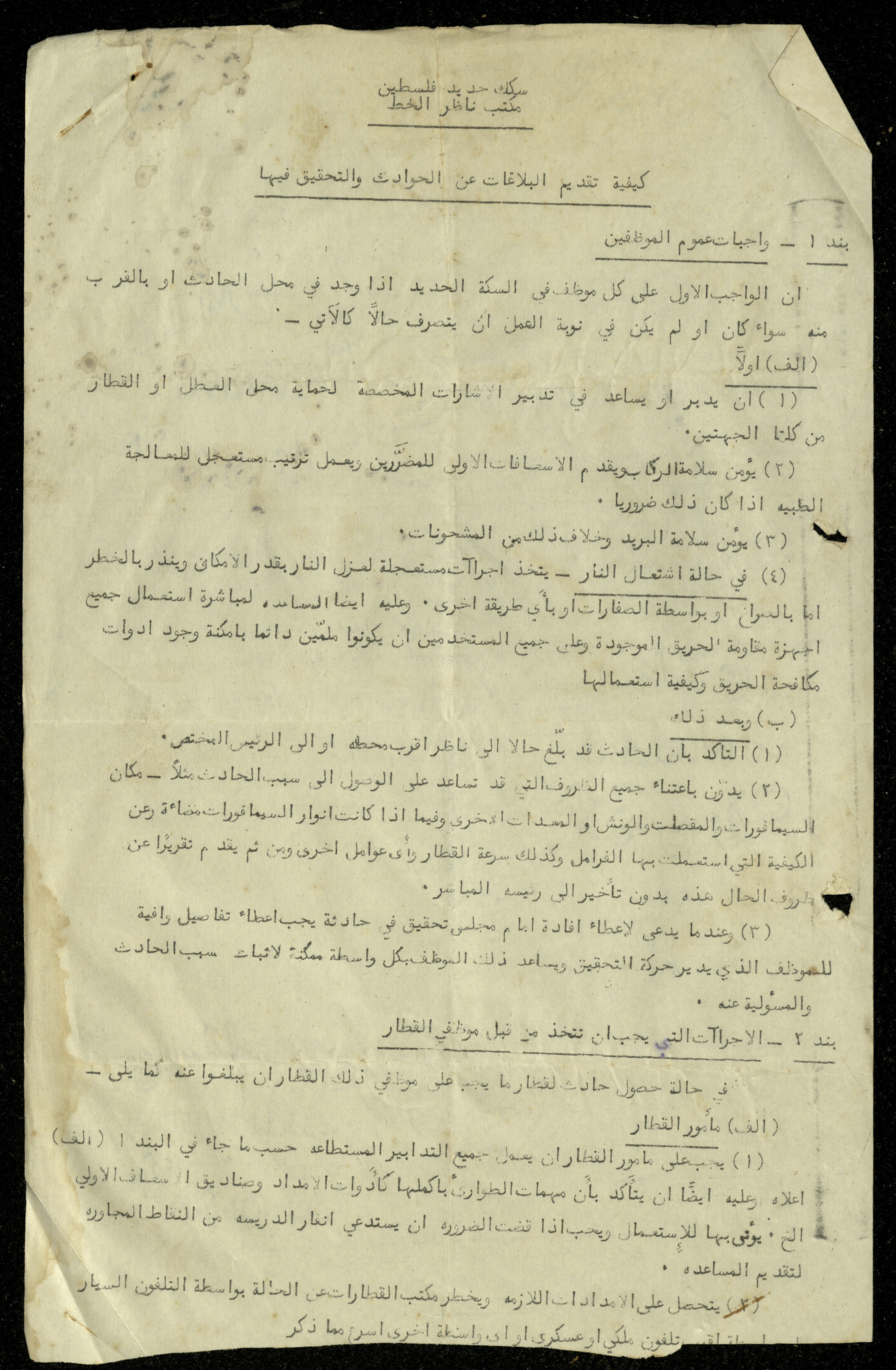 Issued by the Office of the Superintendent of the Line of the Palestine Railways, this document shows instructions on how to report and investigate accidents, as every railway employee found at or near the scene of the accident, whether or not he is on duty, must assist in managing the signals designated to protect the site of the accident or the train, ensures the safety o the passengers and provide first aid to those affected, make urgent arrangements for medical treatment, and secure the mail and other shipments. In the event of a fire, he takes urgent measures to isolate the fire, and ensure that the accident is immediately reported to the nearest station superintendent or the competent chief, and to carefully write down all the circumstances that may help to reach the cause of the accident, it also includes instructions in the event of a train accident, the train staff must inform the train official, and the train official must take all possible measures.