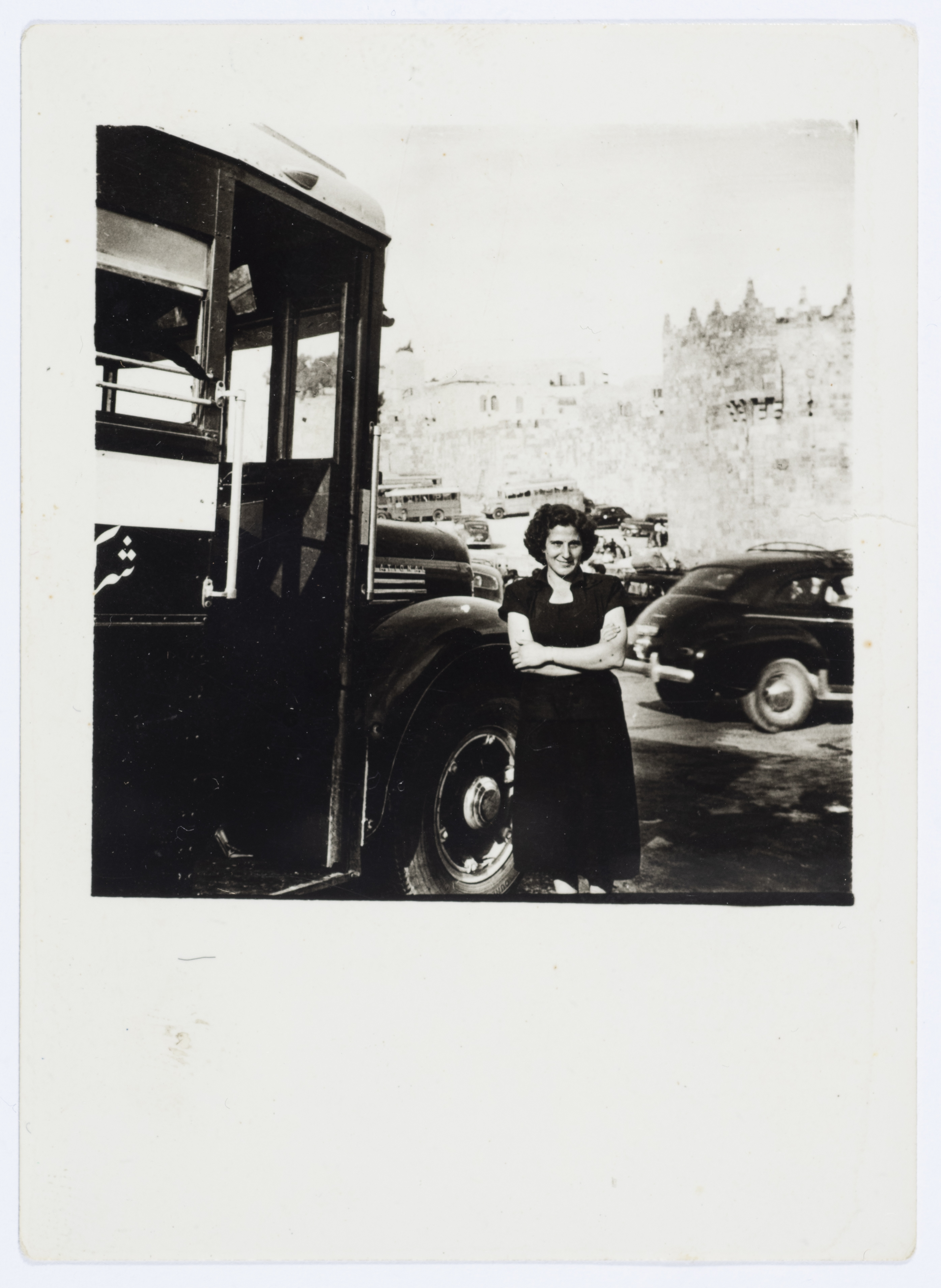 صورة لميلادة حنا خميس تقف بجانب حافلة أمام باب الساهرة في القدس عام 1953.
