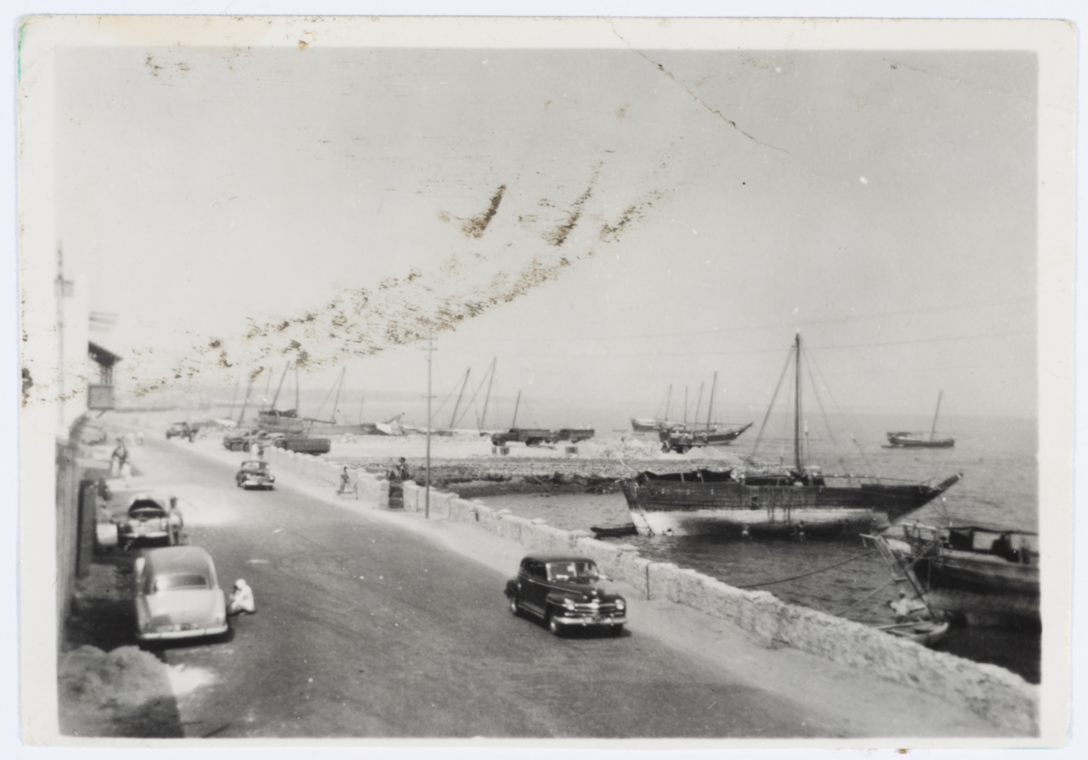 صورة لميناء مدينة يافا التُقطت في ثلاثينيات القرن العشرين، ويظهر فيها مجموعة من السفن والسيارات.