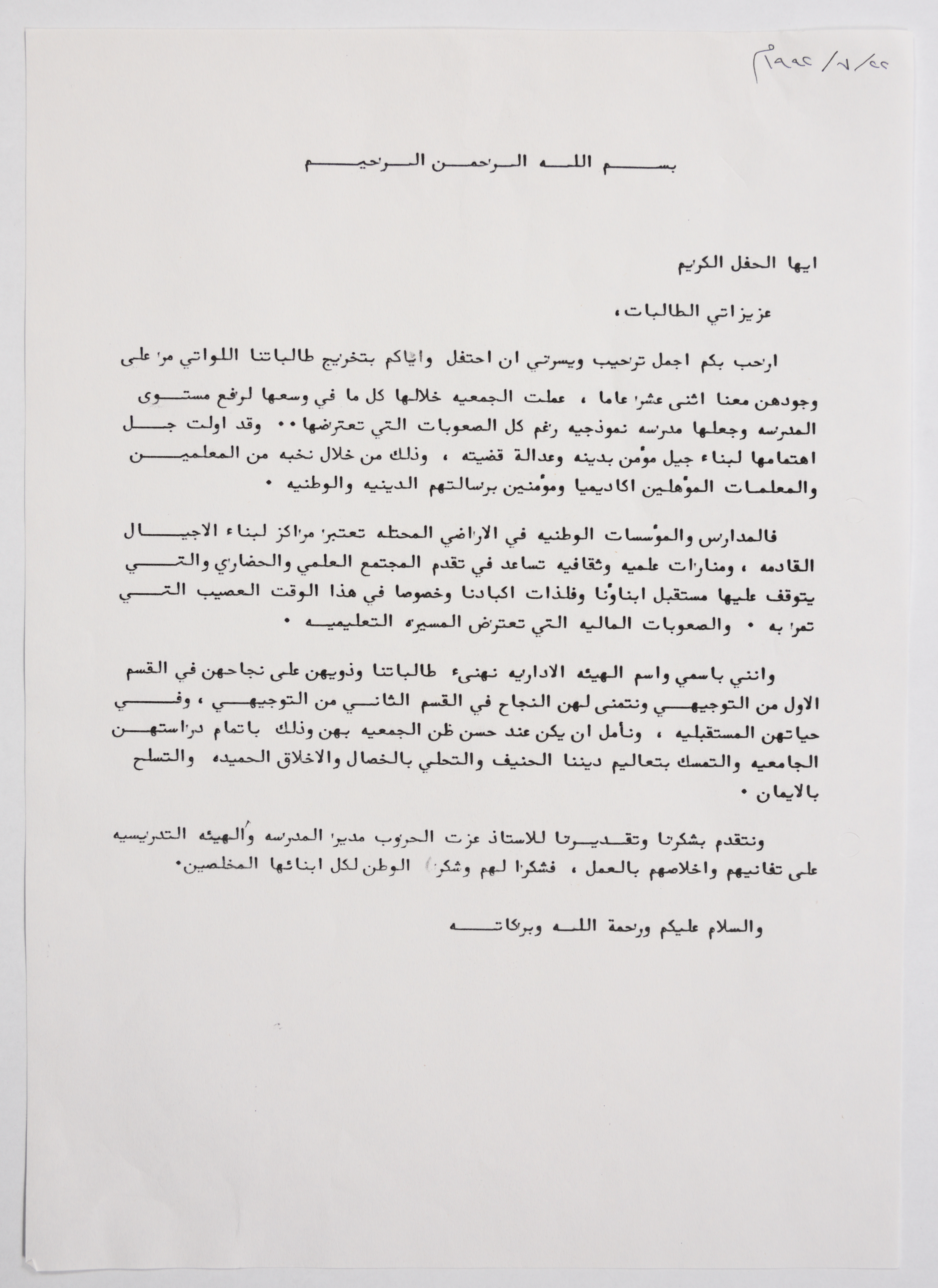A speech delivered in the graduation ceremony of the students of the Young Muslim Women Association School in Jerusalem.