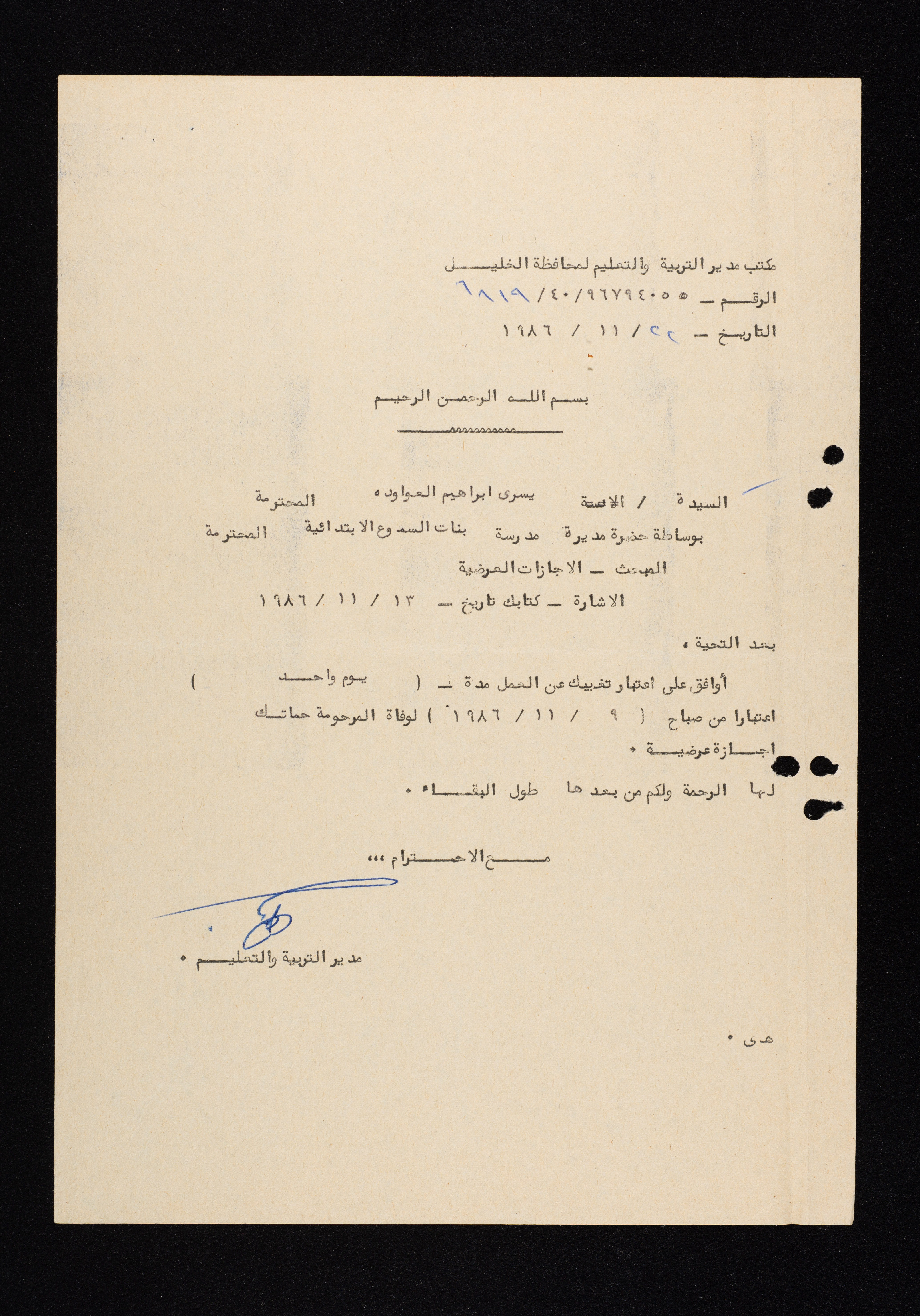 تتضمن هذه الوثيقة كتاب موافقة على إجازة عرضية مقدم وموقع من مدير التربية والتعليم في جنوب الخليل ليسرى إبراهيم خليل العواودة، بواسطة مديرة مدرسة بنات السموع الابتدائية بتاريخ 22 تشرين الثاني 1986 لمدة يوم واحد اعتباراً من صباح 9 تشرين الثاني 1986 بسبب وفاة والدة زوجها.