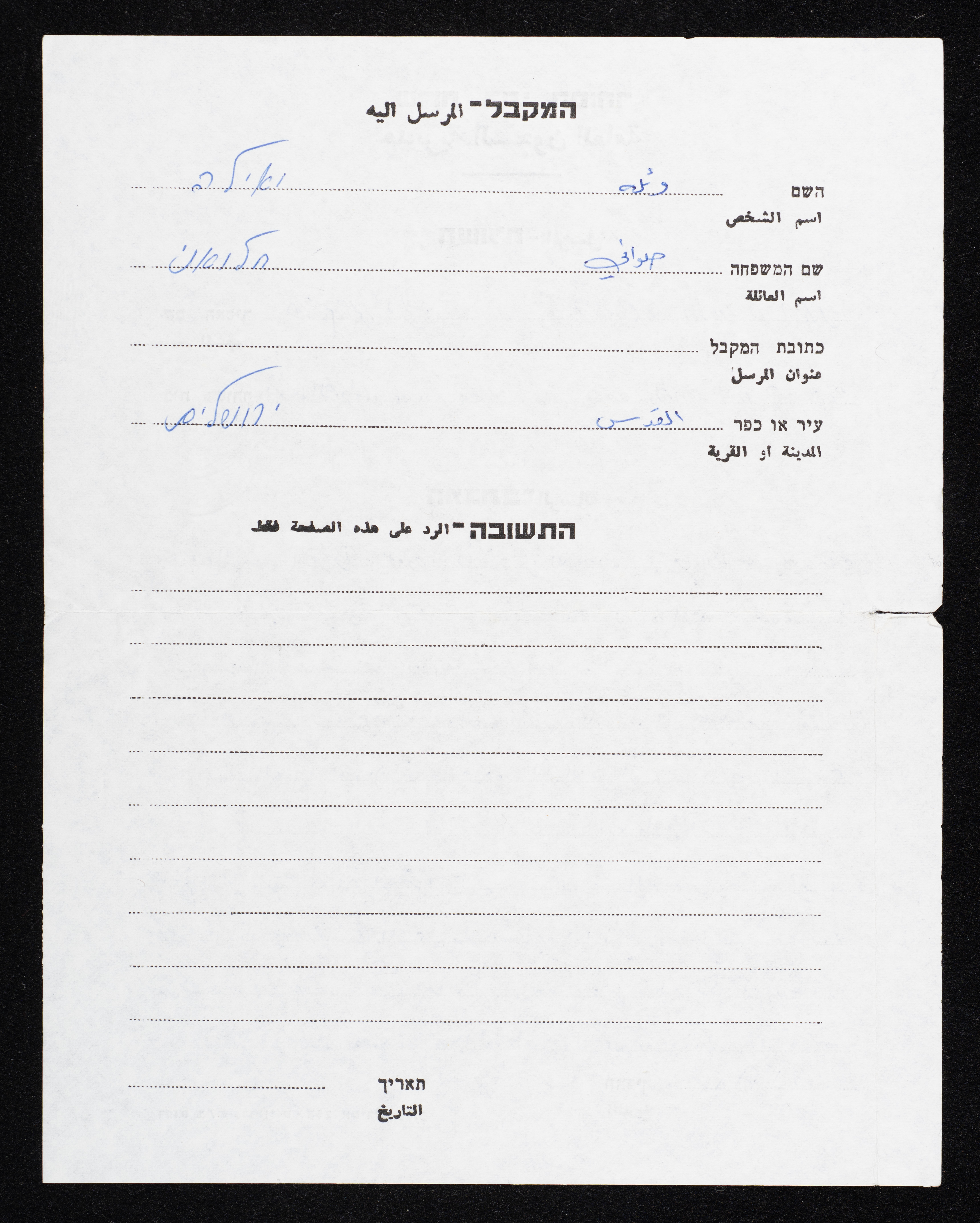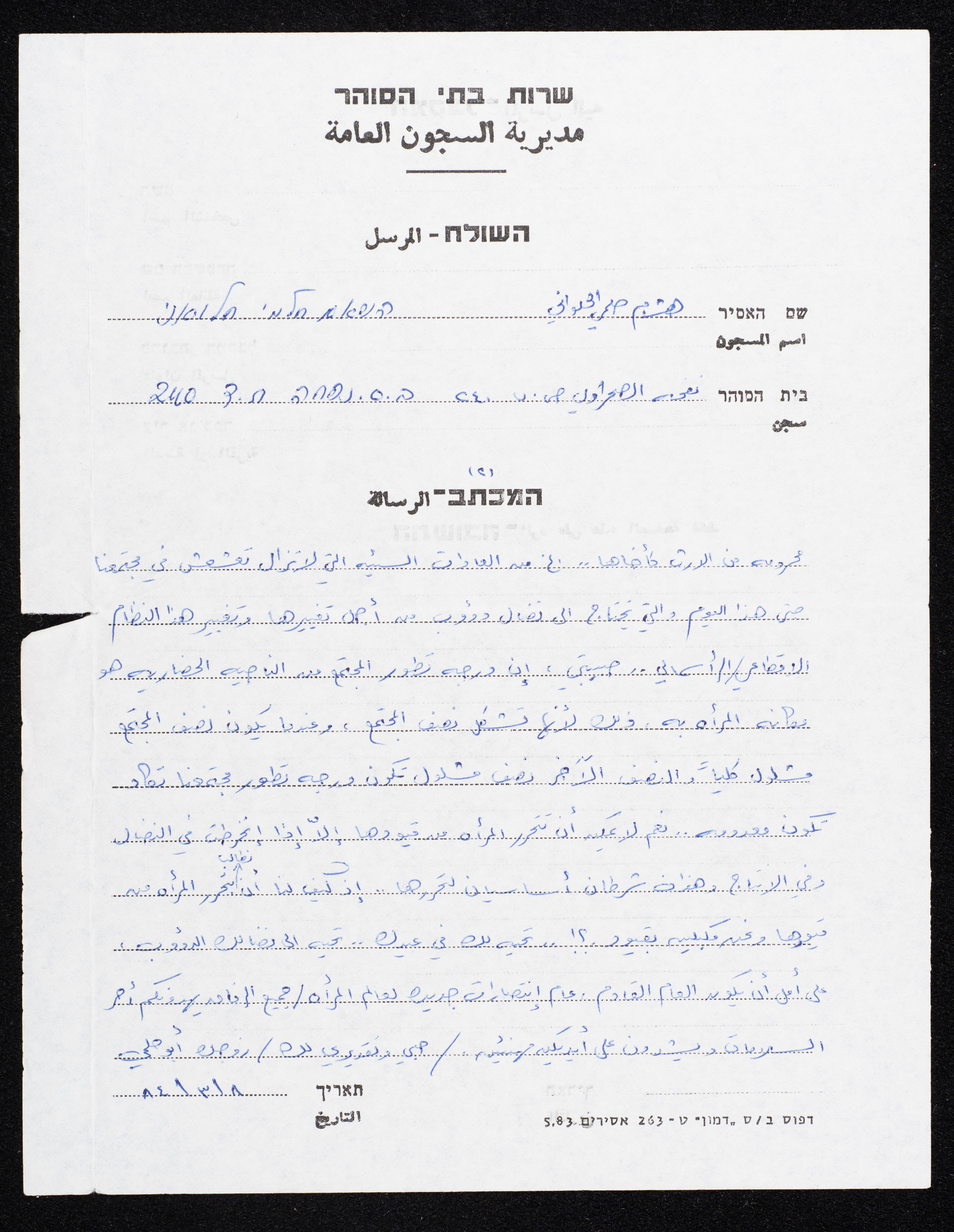 Handwritten, this letter is by Hisham Halawani at Bir al-Sabi Prison to his wife Waela and son Helmi at as-Sowana Neighbourhood in Jerusalem on 8 March 1984, where he wrote congratulating his wife on International Women's Day, which expresses all the oppressed women of the world. He also wrote about the injustice that women are usually subjected to, due to customs and traditions that limit their development and restrict them. He believed that women should struggle to change this feudal capitalist system, and wrote about the importance of women to society and that their development is the development of society, and in order to achieve this, women must engage in struggle and production, to break these restrictions.