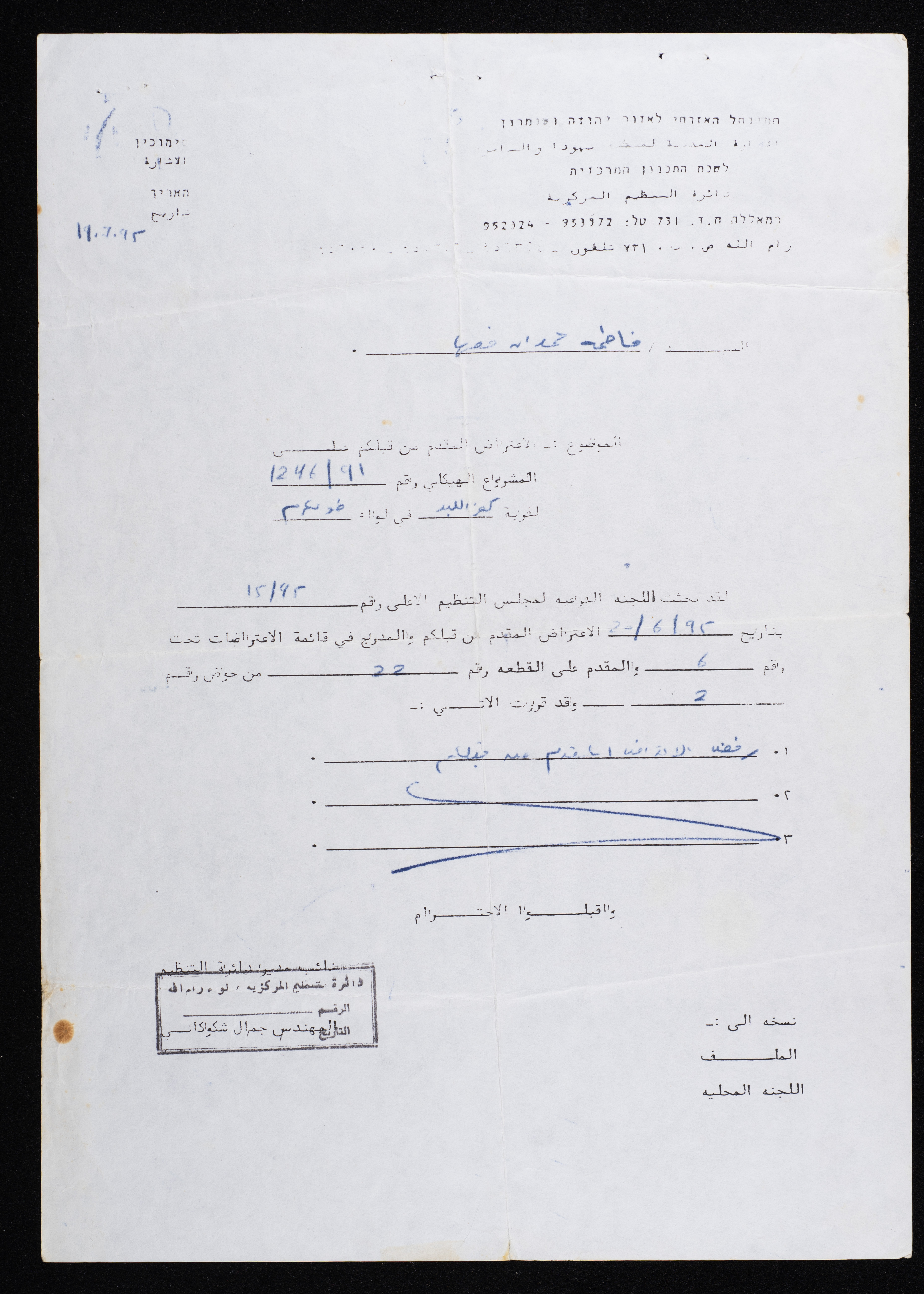 اعتراض مقدم باسم فاطمة حمدان، كفر اللبد، 19 تموز 1992