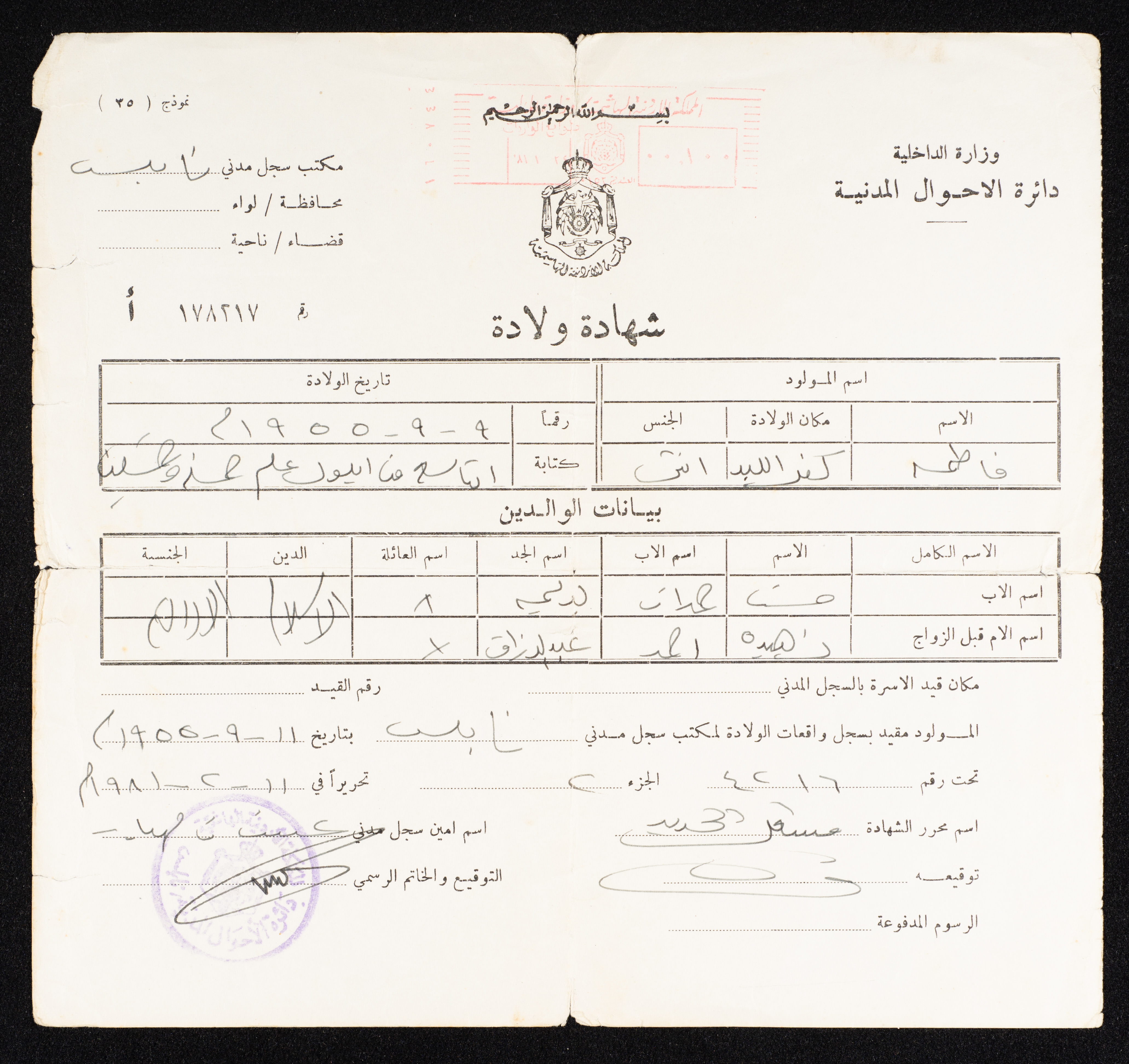 شهادة ميلاد باسم فاطمة حمدان، طولكرم، 9 أيلول 1955