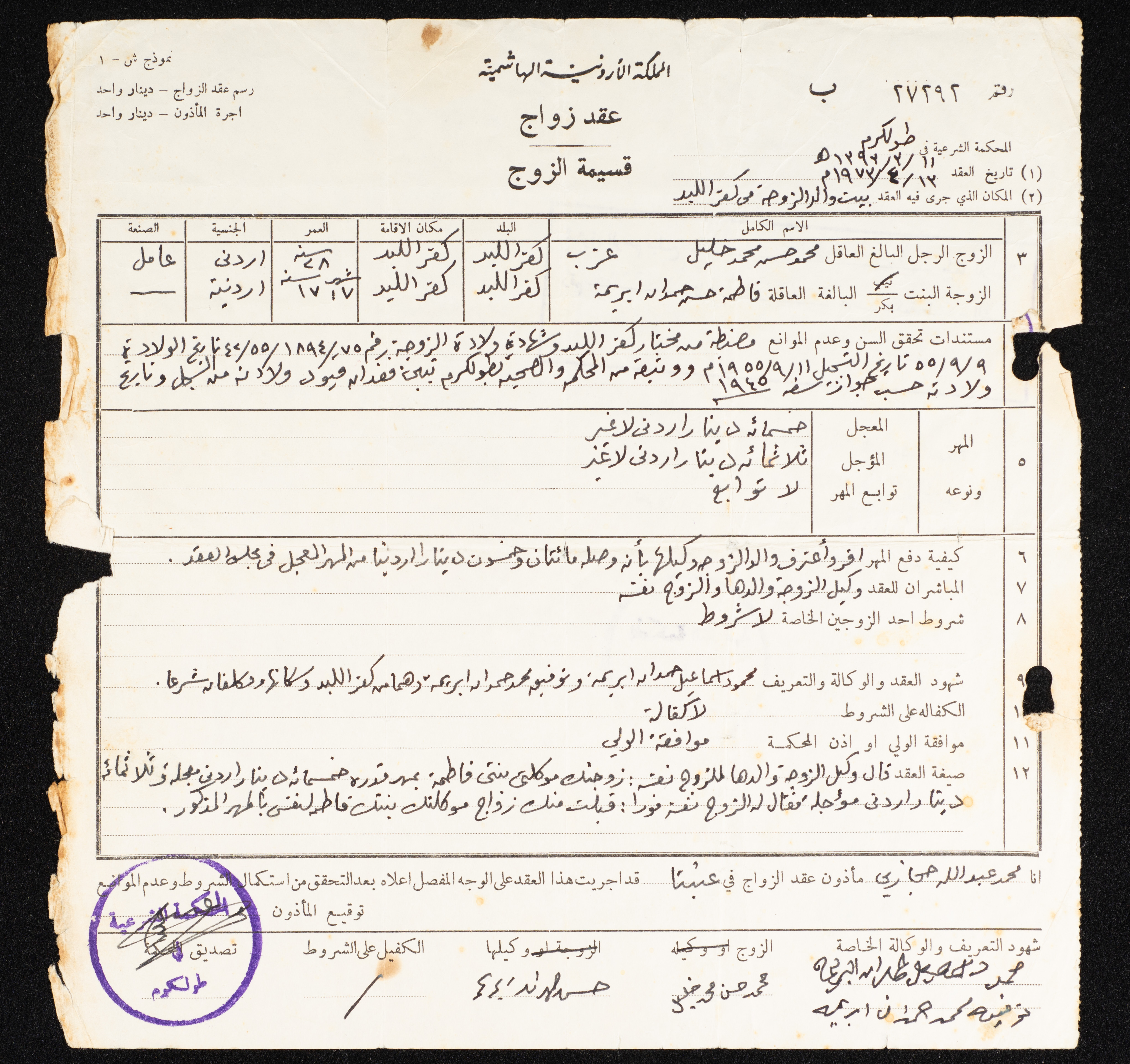 عقد زواج لمحمد حسن محمد خليل وفاطمة حسن حمدان من كفر اللبد قضاء طولكرم صادر بتاريخ 12 نيسان 1972، ويتضمن قيمة المهر المعجل والمؤجل وتوقيع ثلاثة شهود.