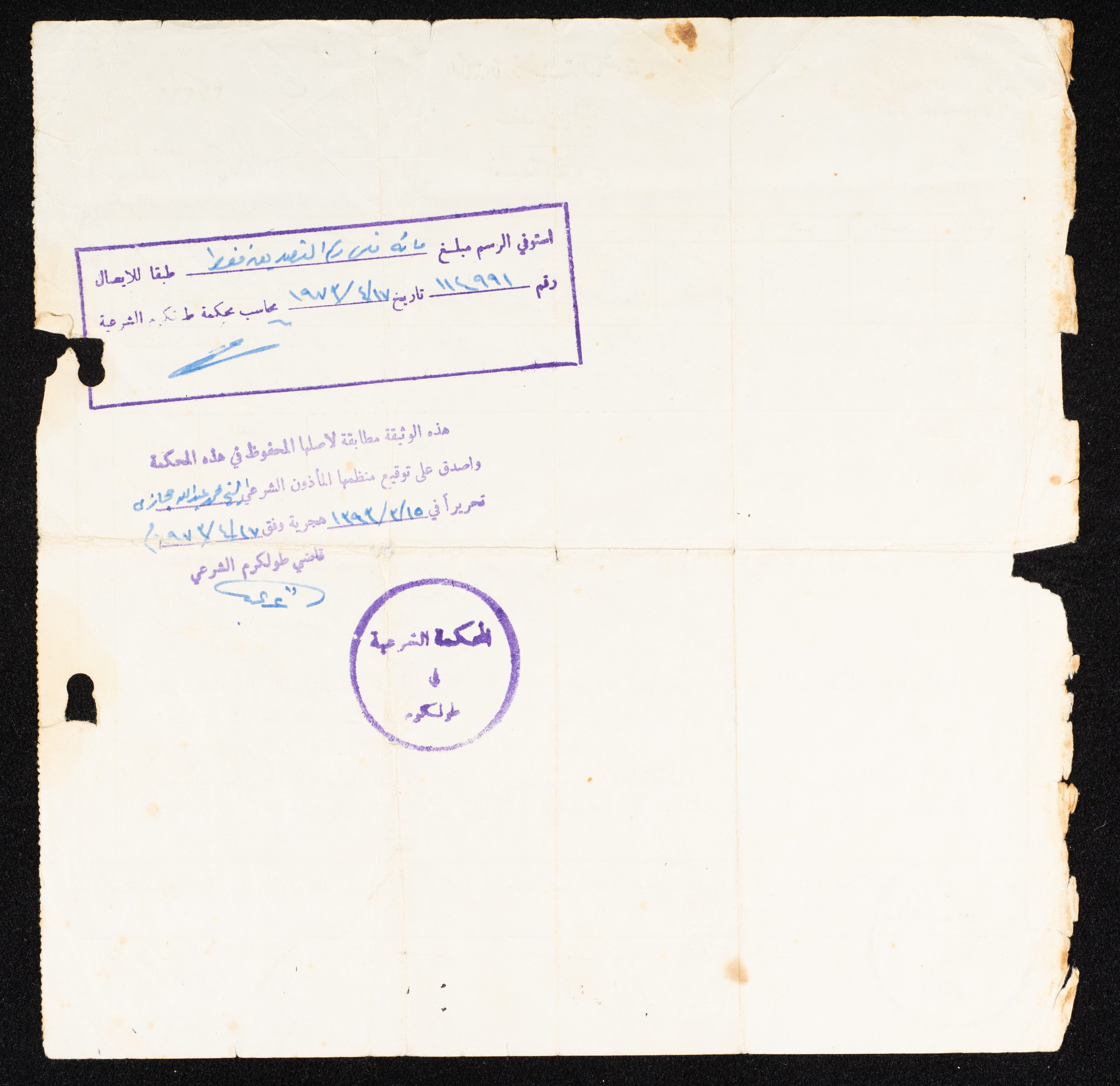 عقد زواج صادر عن المحكمة الشرعية في طولكرم، 12 نيسان 1972