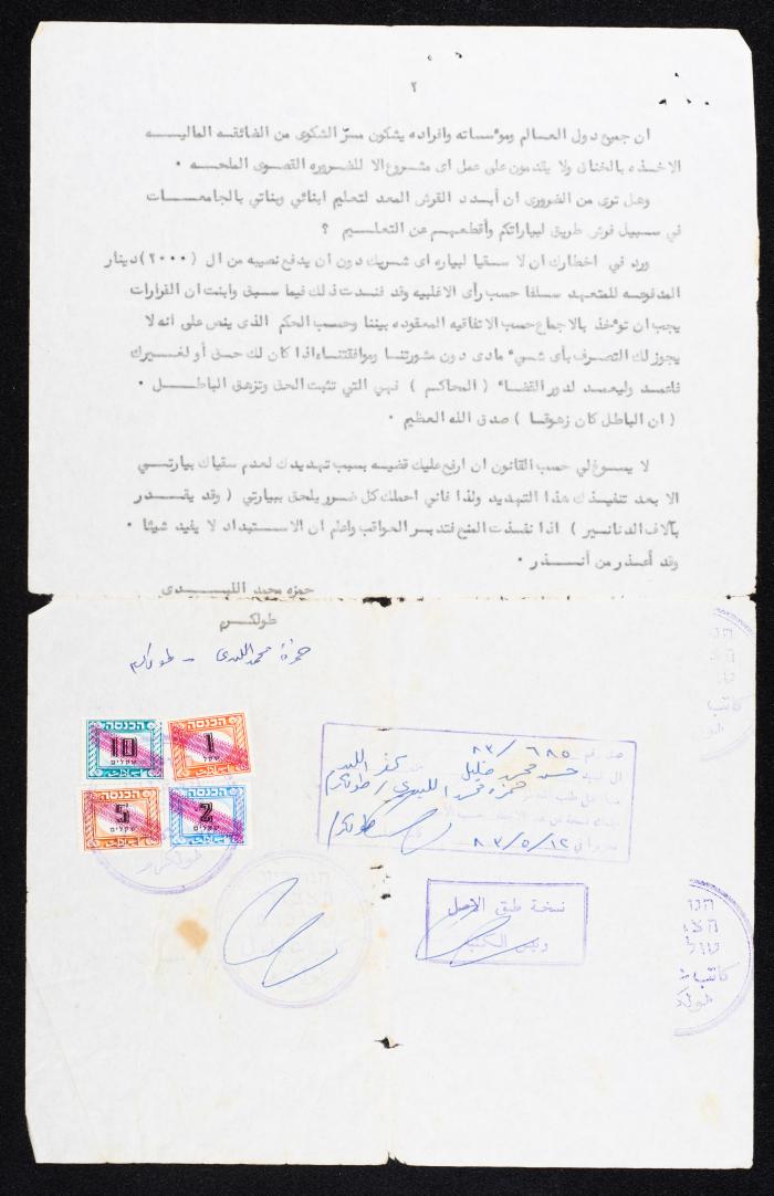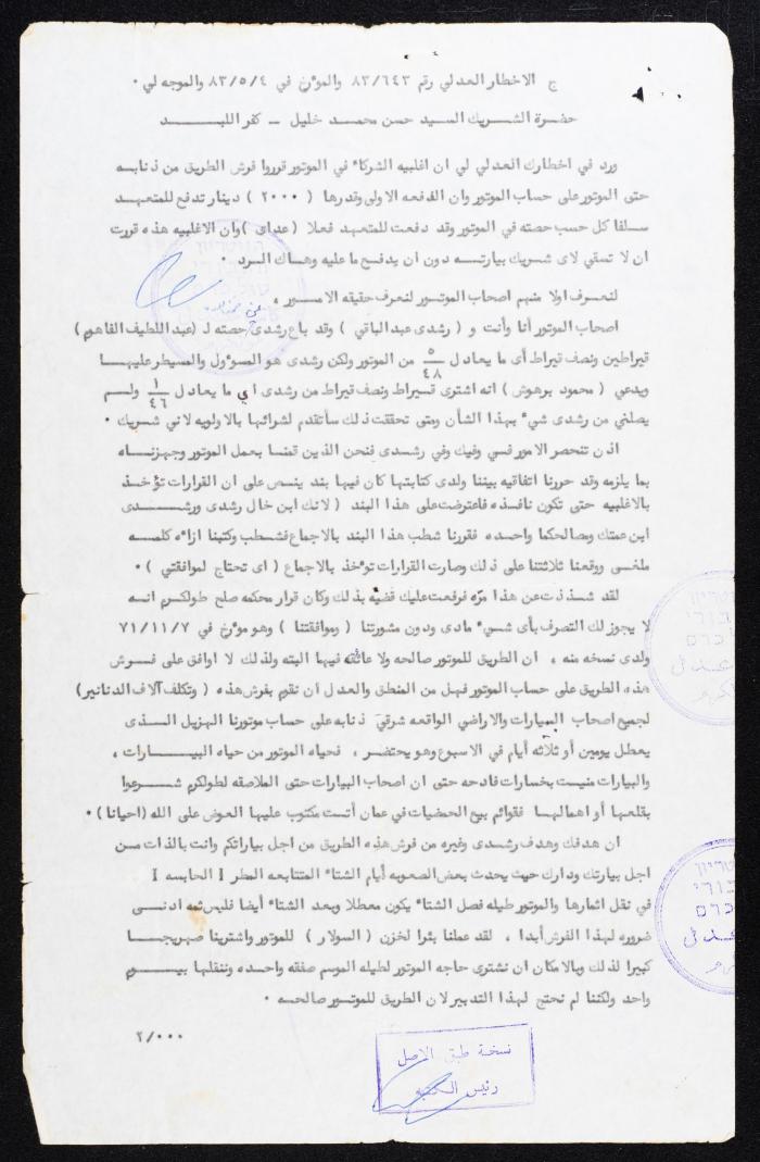 إخطار عدلي مطبوع باللغة العربية وصادر عن حمزة اللبدي موجه إلى حسن محمد خليل من كفر اللبد قضاء طولكرم بتاريخ 12 أيار 1983، وذلك بخصوص فرش الطريق من ذنابة حتى الموتور على حساب الموتور بدفعة أولى تصل إلى 2000 تدفع للمتعهد، وعليه تم رفع قضية في محكمة صلح طولكرم بسبب عدم استشارة الأطراف الأخرى، حيث أن الأرض صالحة ولا تحتاج لفرش قد تصل كلفتها إلى الاف الدنانير وأن الهدف من فرش الموتور هو هدف شخصي يخدم بيارة واحدة فقط.