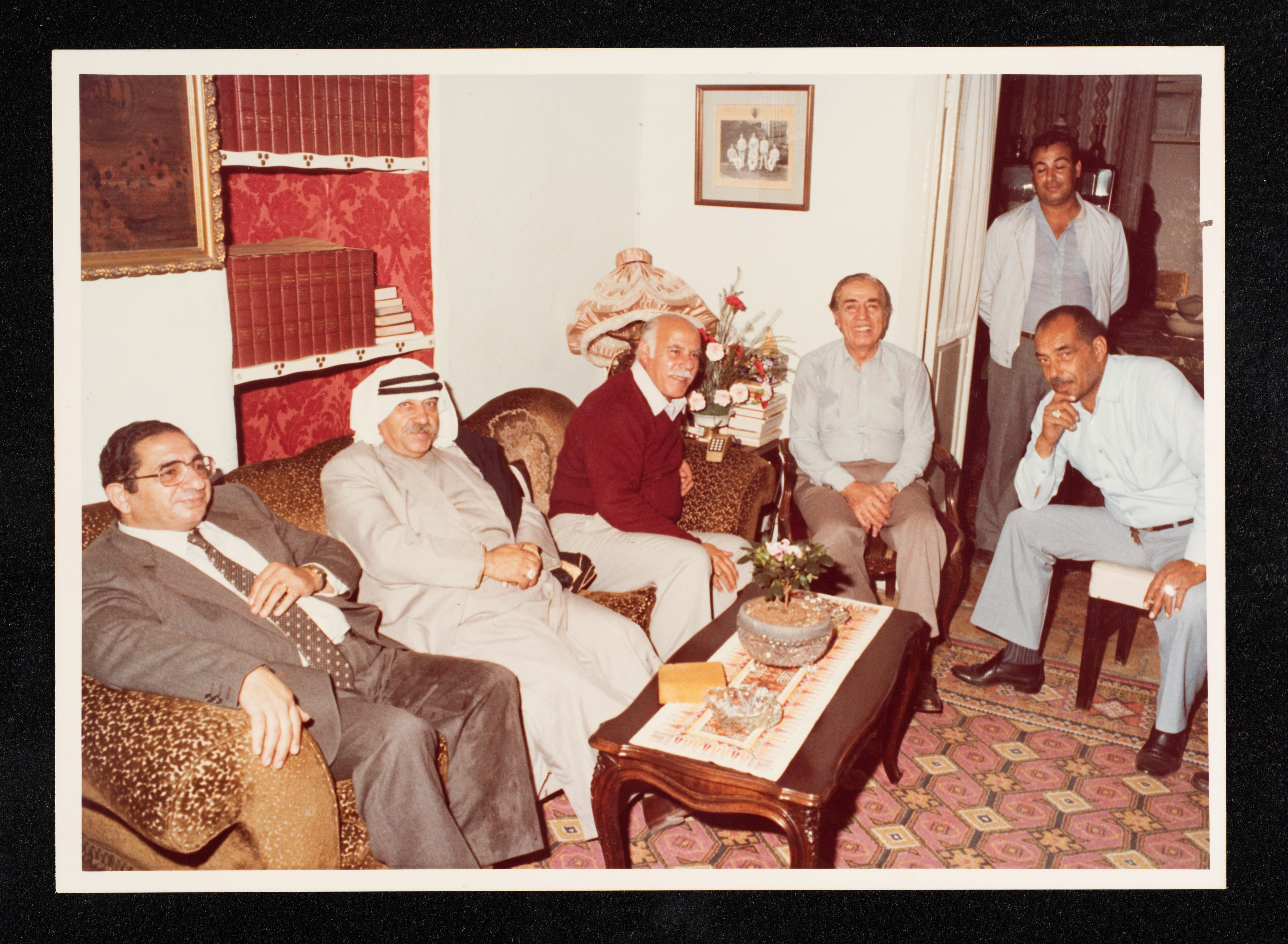 Taken in 1984, this photograph shows Anwar Zaki Nusseibeh during his reception after returning from performing Hajj. Second to the right, he is seen with his friends at his house; at the end of Nablus Street near the Sheikh Jarrah Neighbourhood in Jerusalem.