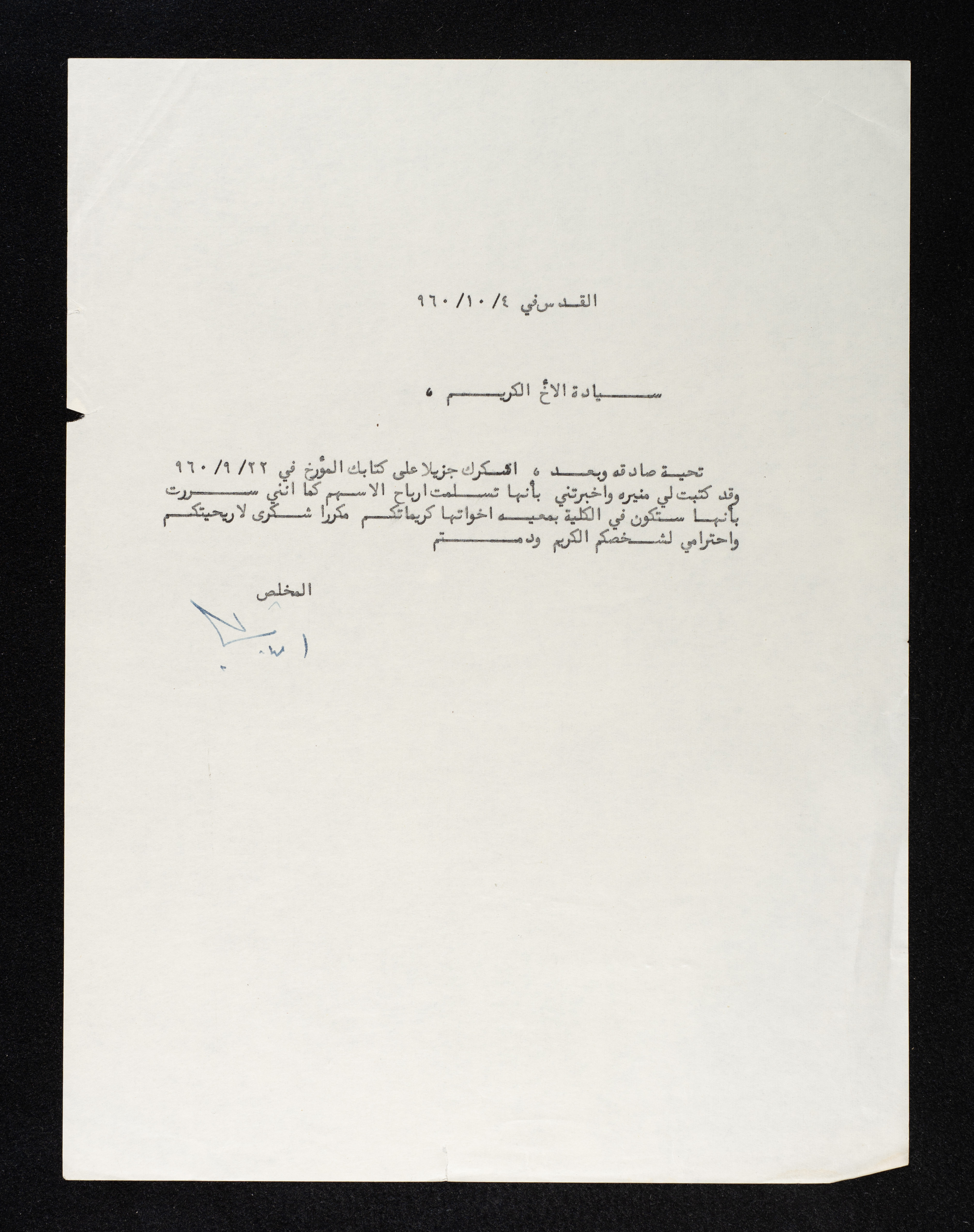 رسالة من أنور نسيبة بتاريخ 4 تشرين أول 1960، يشكر فيها نسيبة الشخص الذي يراسله على كتابه المؤرخ في 22 أيلول من نفس العام، ويخبره أن منيرة كتبت له أنها استلمت أرباح الأسهم، وعبر عن سروره أنها ستكون في الكلية بمعية بنات مستقبل الرسالة، وينهيها بتكرار شكره وامتنانه.