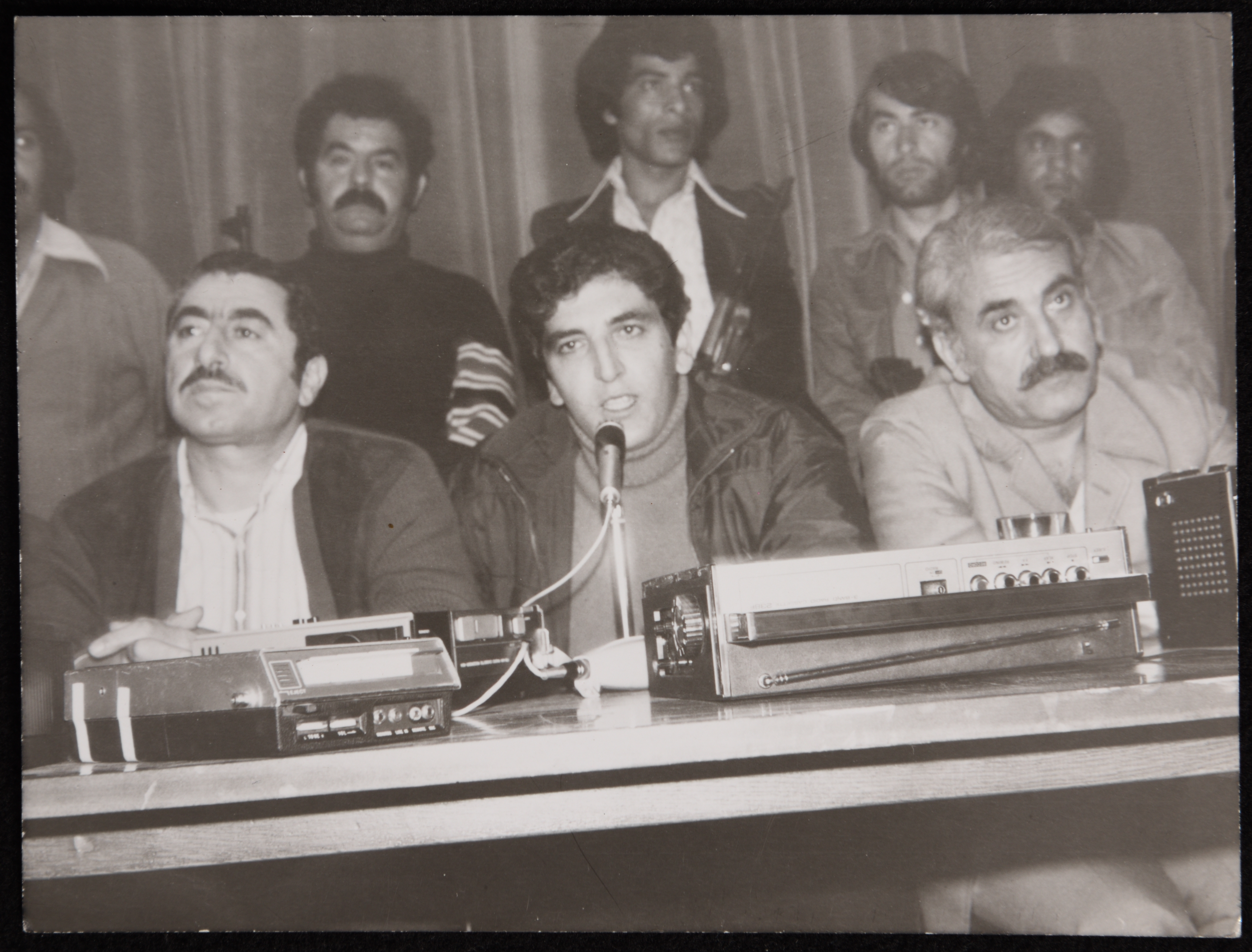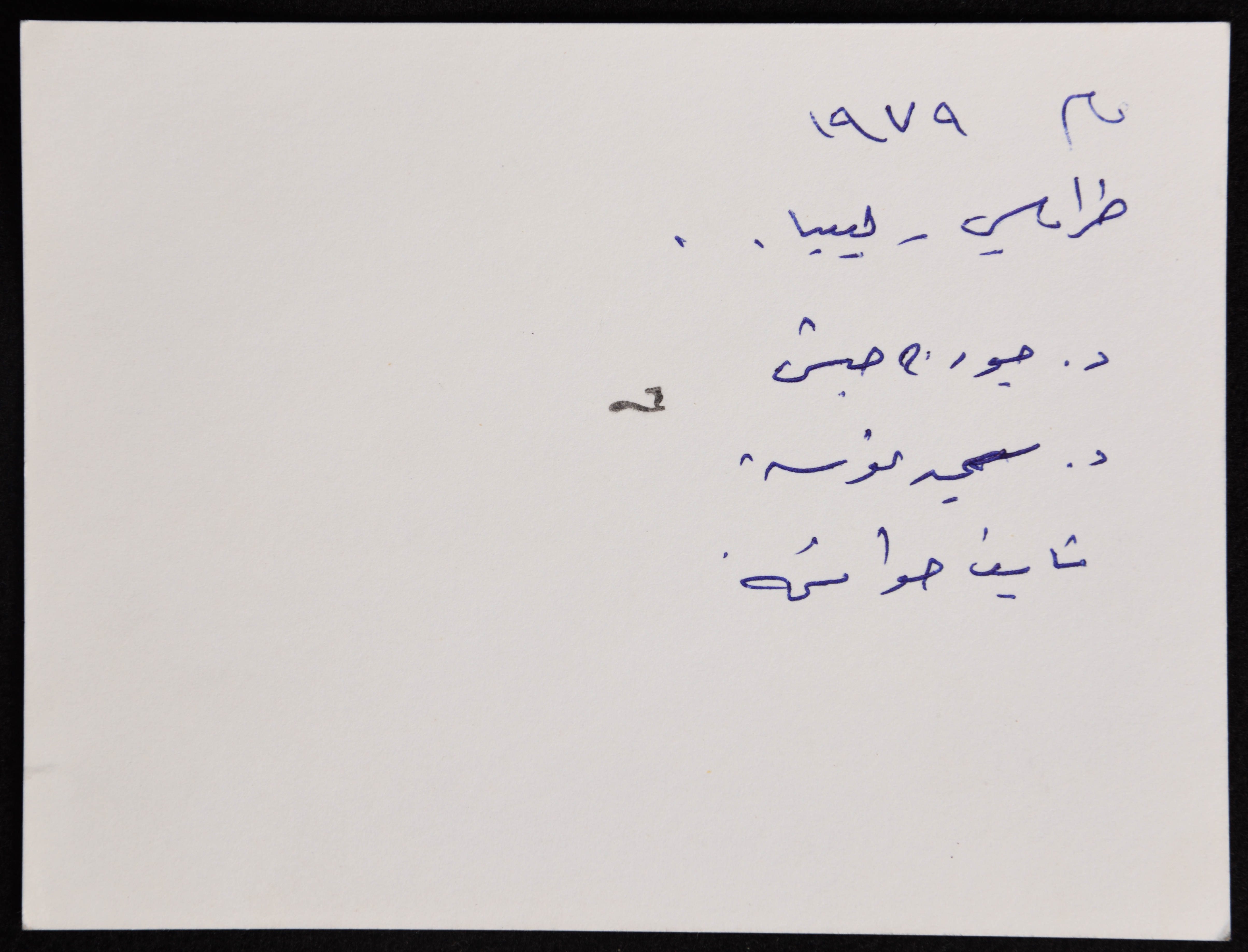A black-and-white photograph of Dr. Samir Ghaushe with Dr. George Habash and Nayef Hawatmeh in Tripoli, Libya in 1979.