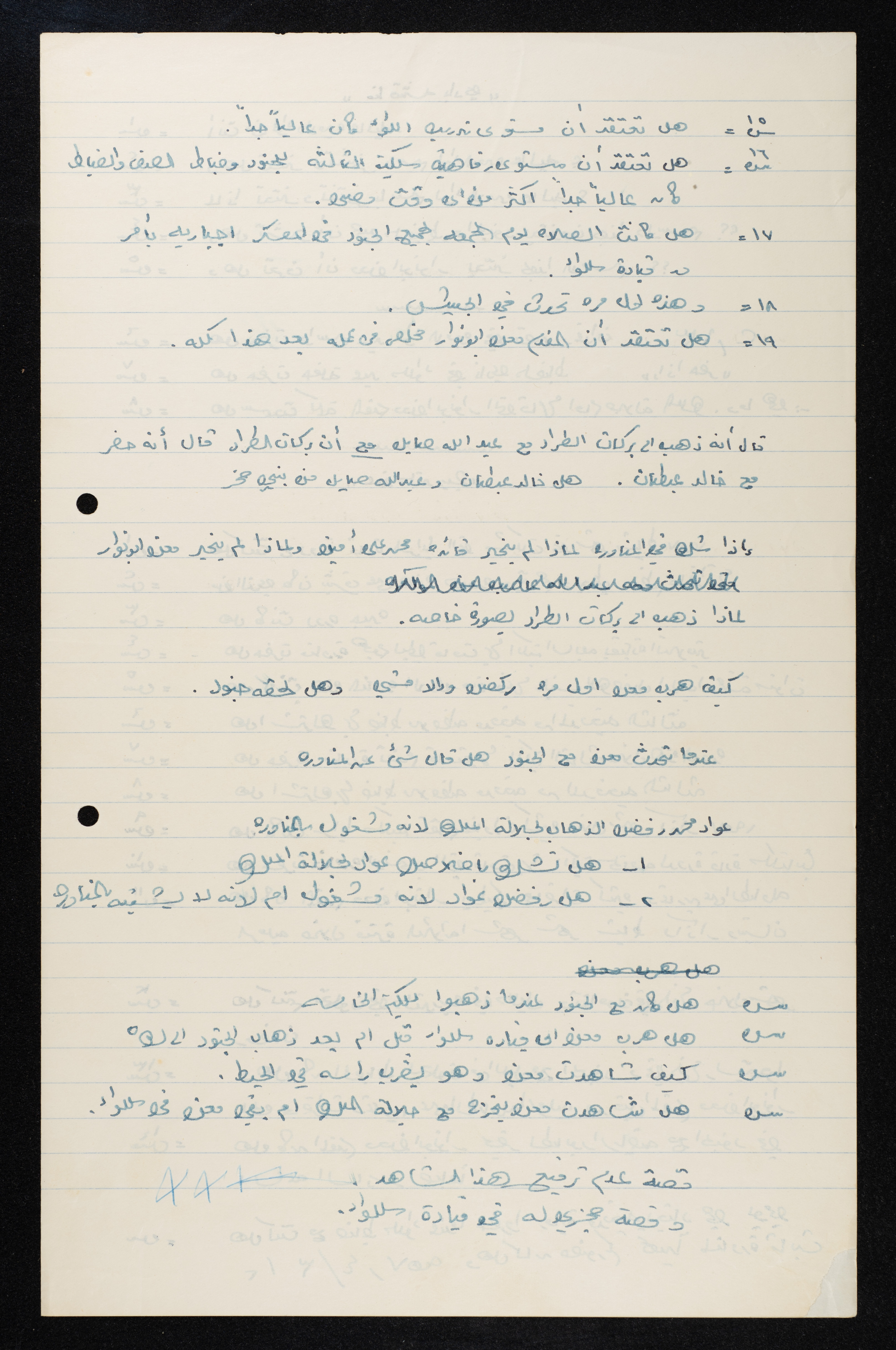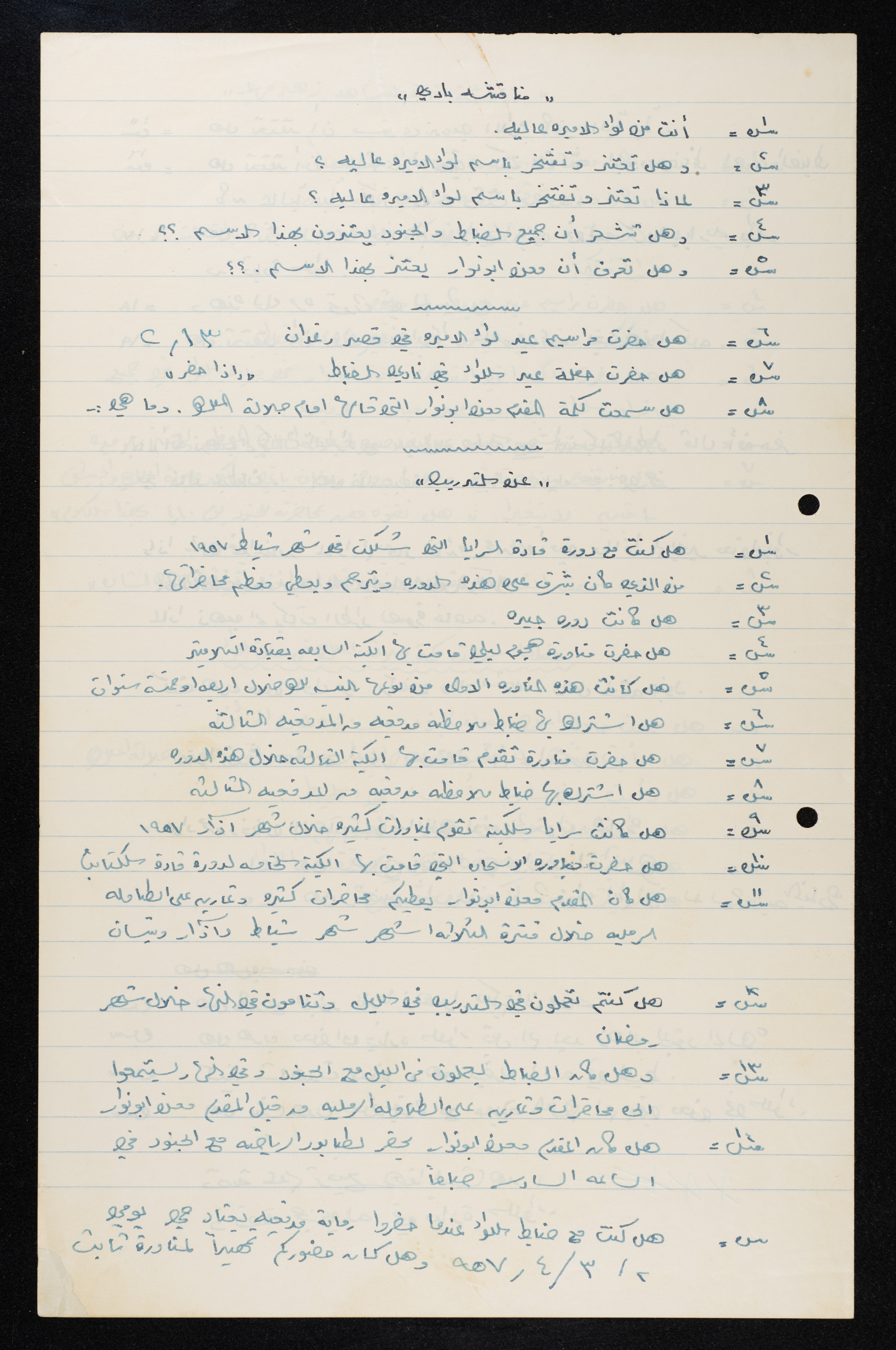Handwritten in Arabic and found in the archive of Sari Nusseibeh, originally for his father Anwar Nusseibeh, this archival item documents the discussion of "Badi" featuring a collection of questions on the "Brigade of Princess Alia", and how much he is proud and honoured by this name, and so does lieutenant "Maen Abu Nuwar", it also includes details on the birthday of Princess Alia at the Raghadan Palace and the speech of lieutenant of which he delivered before the prince, in addition to a collection of questions on his participation in the "Leaders of Brigades" training which was found in February 1957 and the manoeuvres he did during the past five years and the same goes to the ones he carried out during Ramadan.