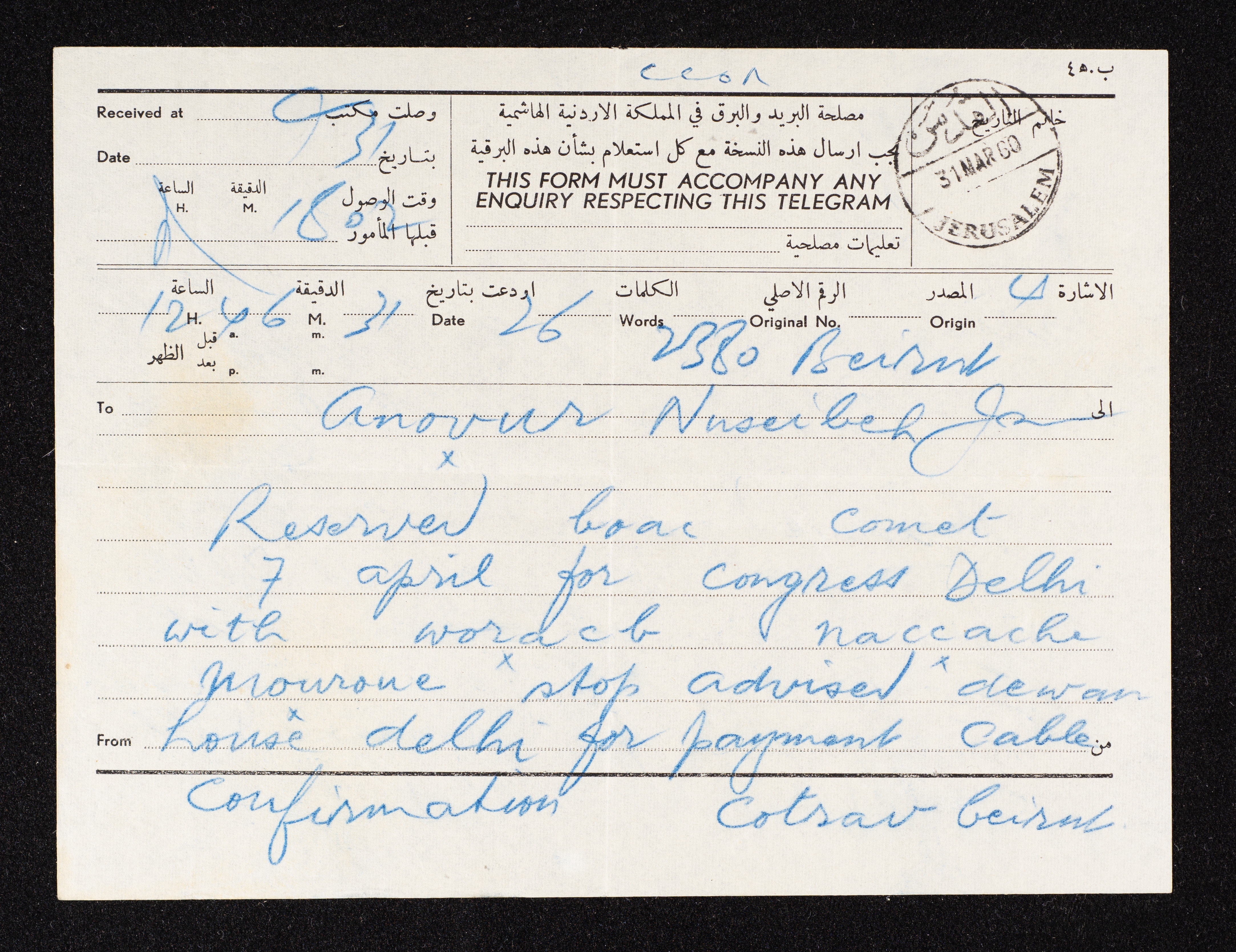 A Telegram by the Jordanian Department of Posts and Telegraphs for Anwar Nusseibeh, 31 March 1960