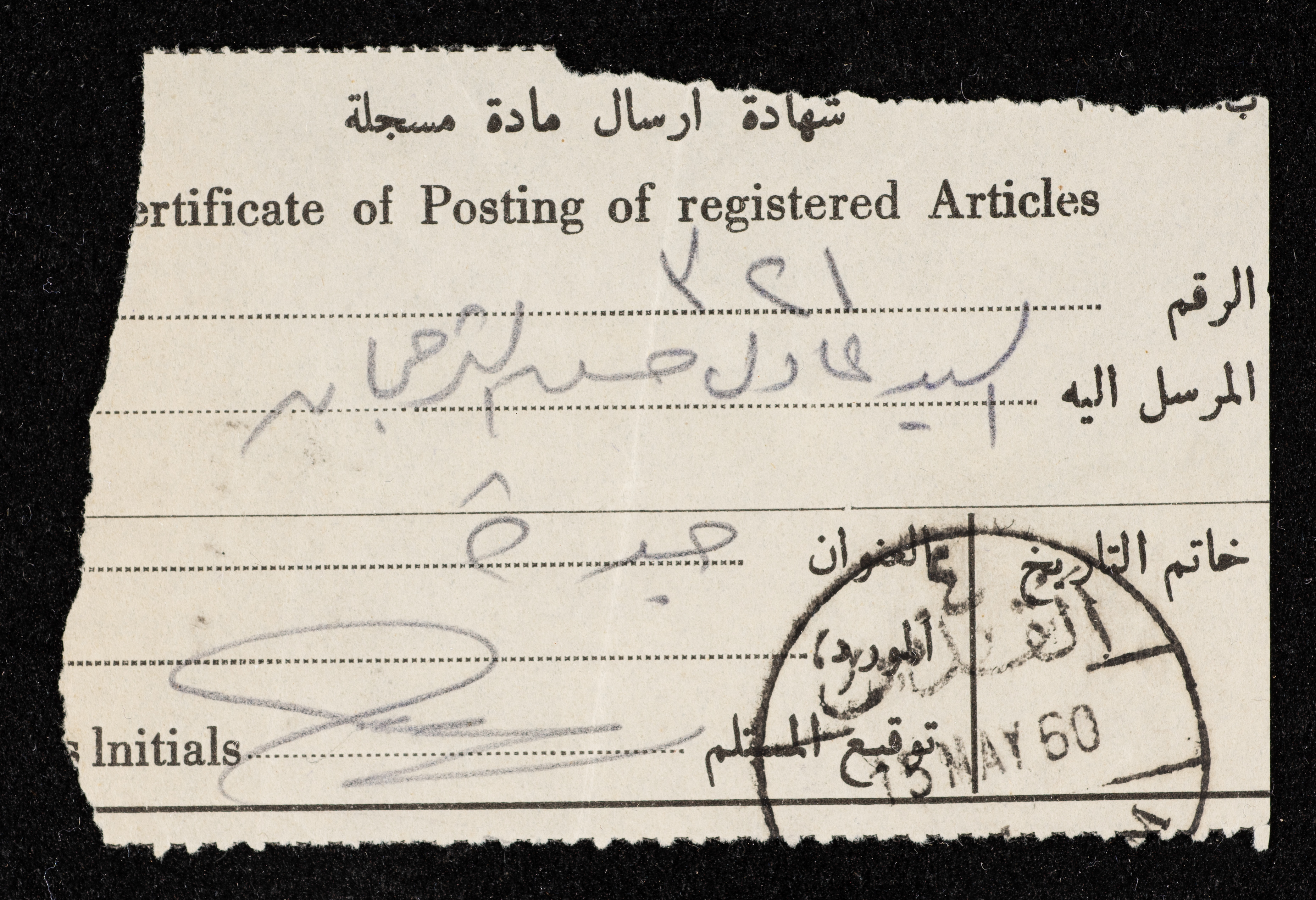 Found in the Sari Nusseibeh Collection, this document shows a certificate of posting of registered articles sent to Adel Attorjouman, residing in Jeddah, on 15 May 1960.