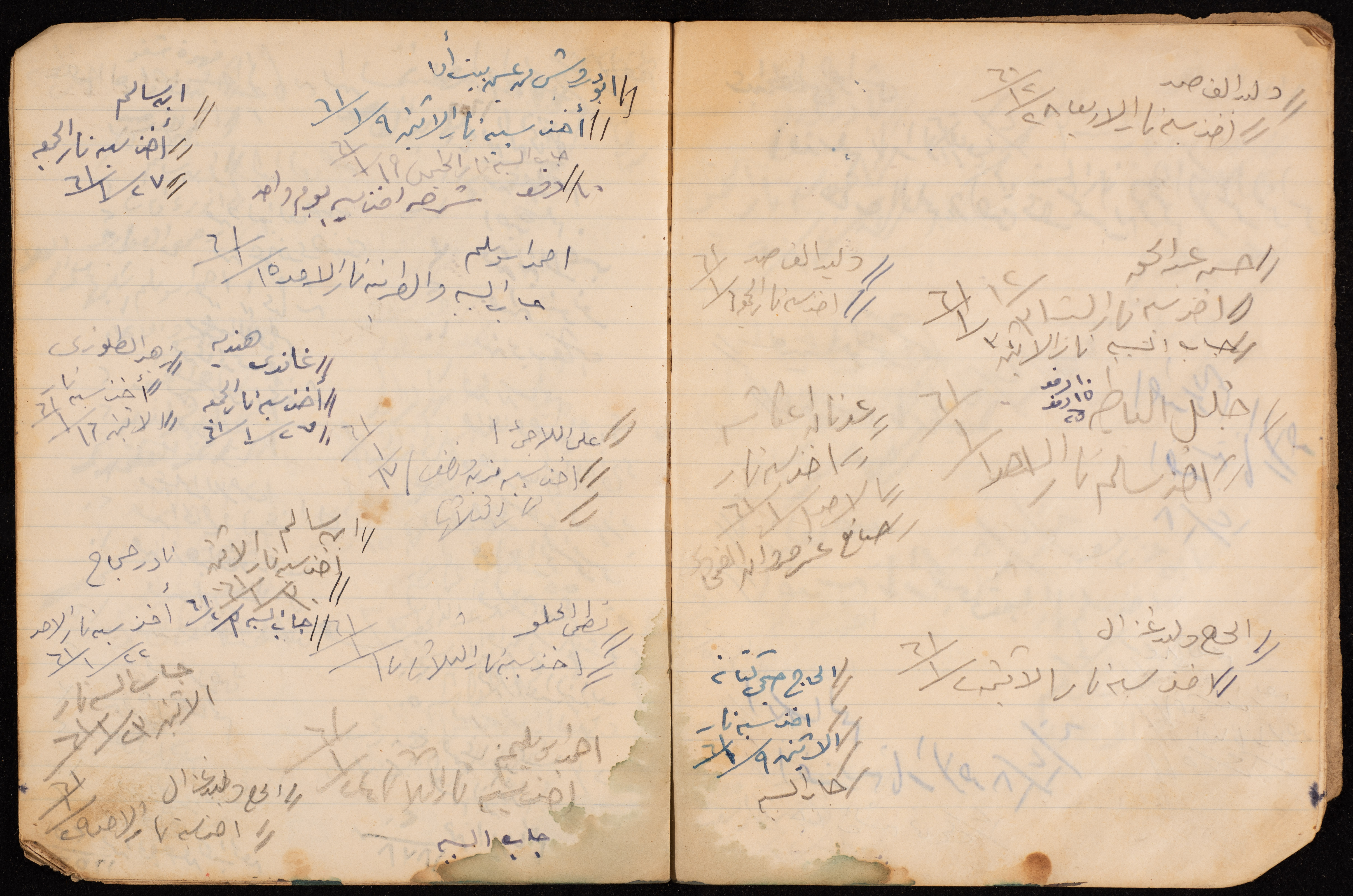 وثيقة مكتوبة بالعربية وبخط اليد على كراسة مدرسية، من مجموعة باسل ابريك الأرشيفية، وهي عبارة عن دفتر حسابات وديون لبقالة عبد الفتاح ابريك في مدينة نابلس لعام 1960 - 1961.