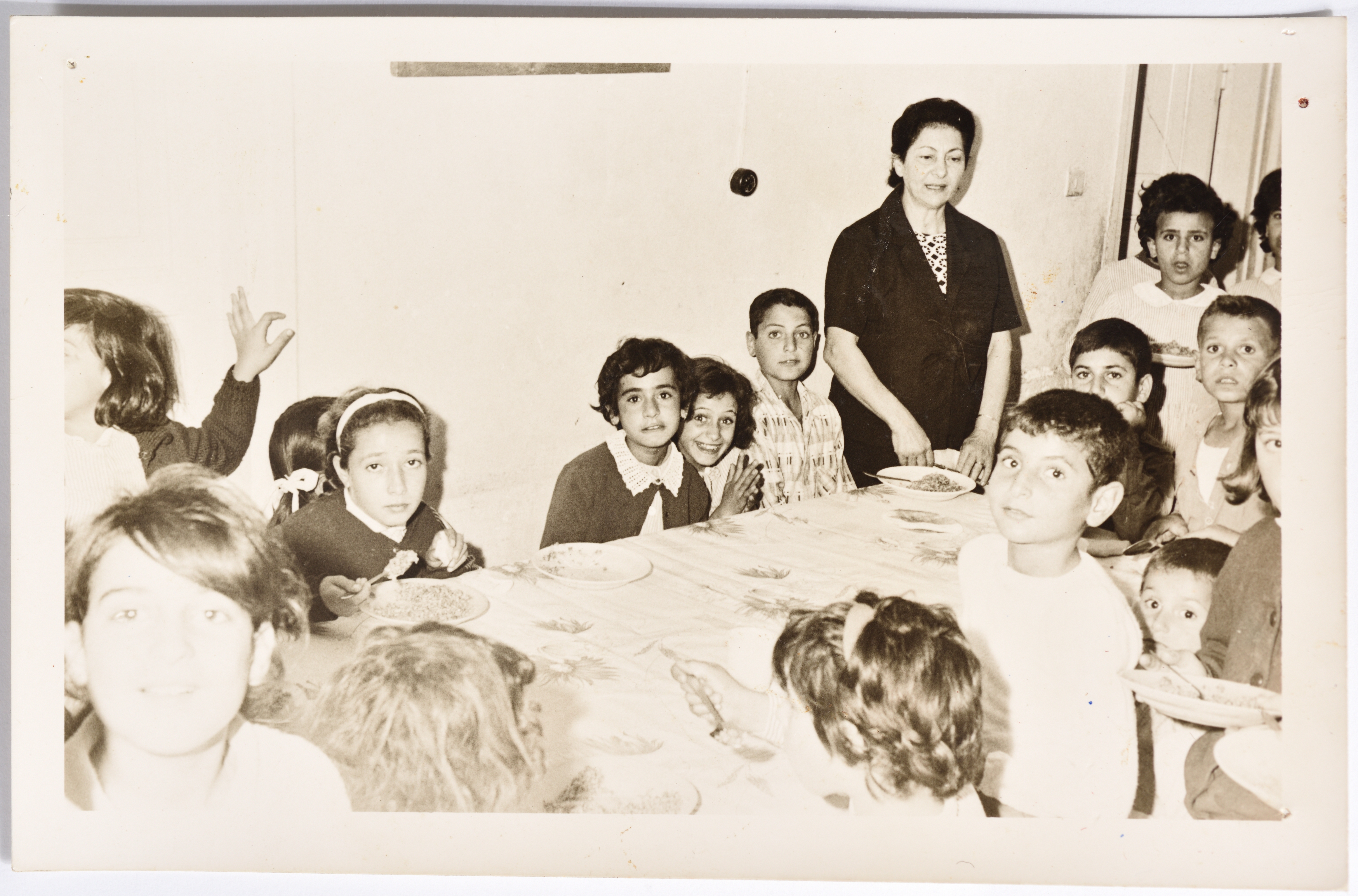 صورة لنشاط لطلاب المدارس من ذوي الاحتياجات الخاصة في جمعية النهضة النسائية في رام الله، في ستينيات القرن العشرين. تظهر في الصورة جوليا الأنقر ابنة بديعة سلامة.