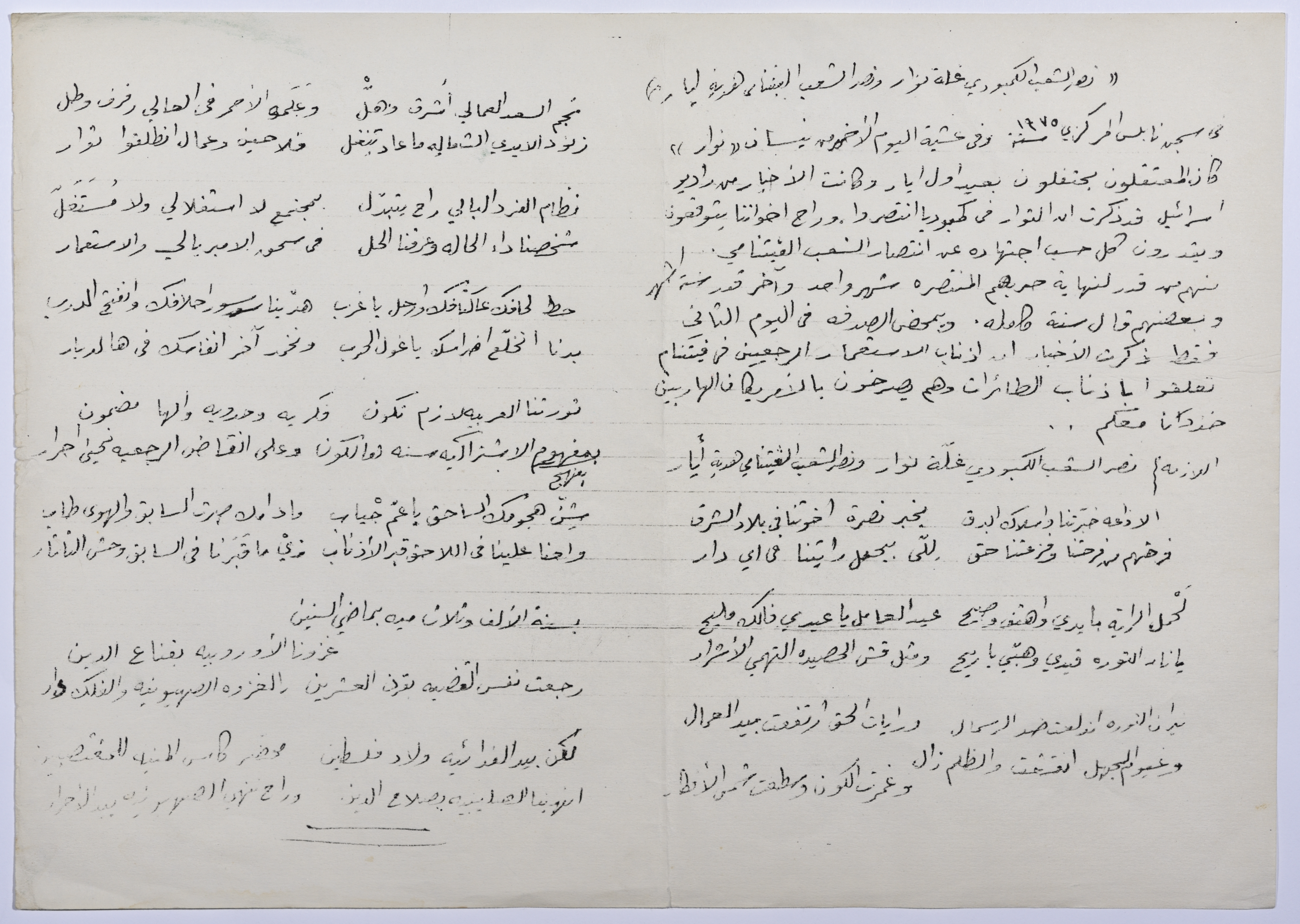 A document that contains a text and a poem written by Rajih al Salfeety, where Rajeh wrote them while he was in Nablus Central Prison in 1975 when the victory of the Vietnamese and Cambodian people was announced. The text describes how al Salfeety came to write this poem as an incident, and the poem shows the happiness that he and other Palestinian prisoners felt when the rebels achieved victory in Cambodia and Vietnam.