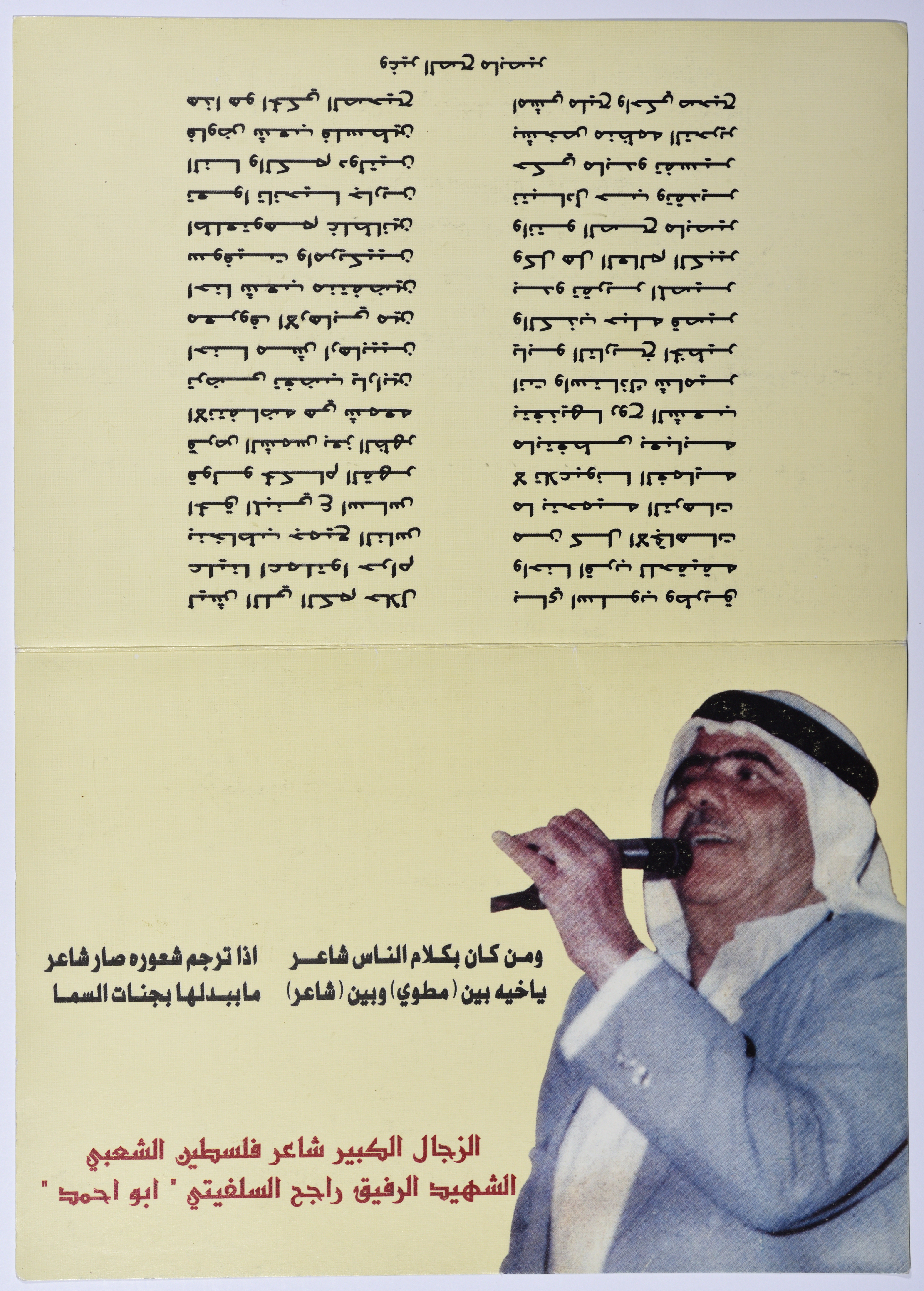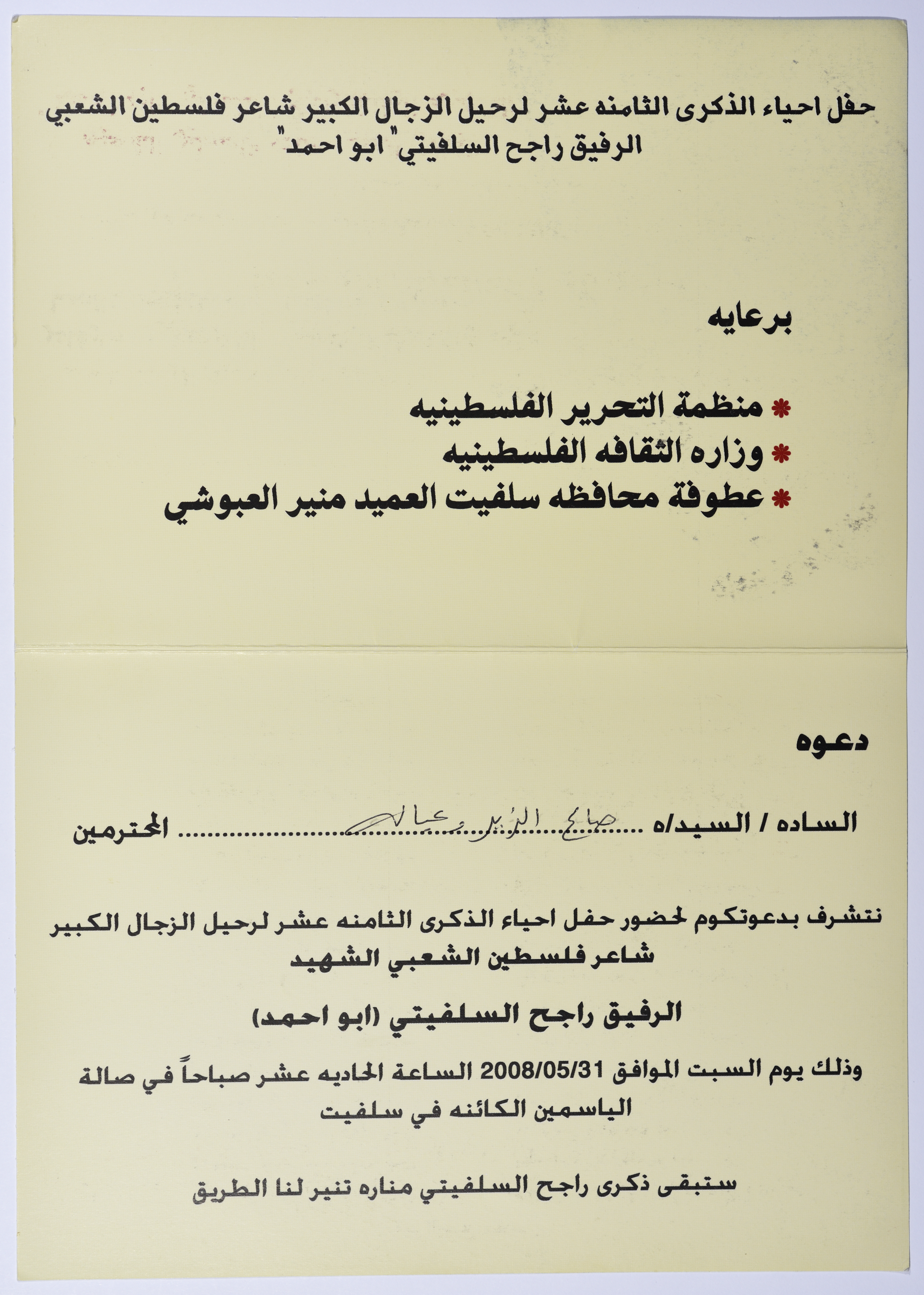 وثيقة مكونة من صفحتين، تتضمن بطاقة دعوة لحضور حفل احياء ذكرى راجح السلفيتي، الدعوة مكتوبة باسم صالح الزير، أقيم حفل احياء الذكرى في سلفيت في تمام الساحة الحادية عشر صباحا