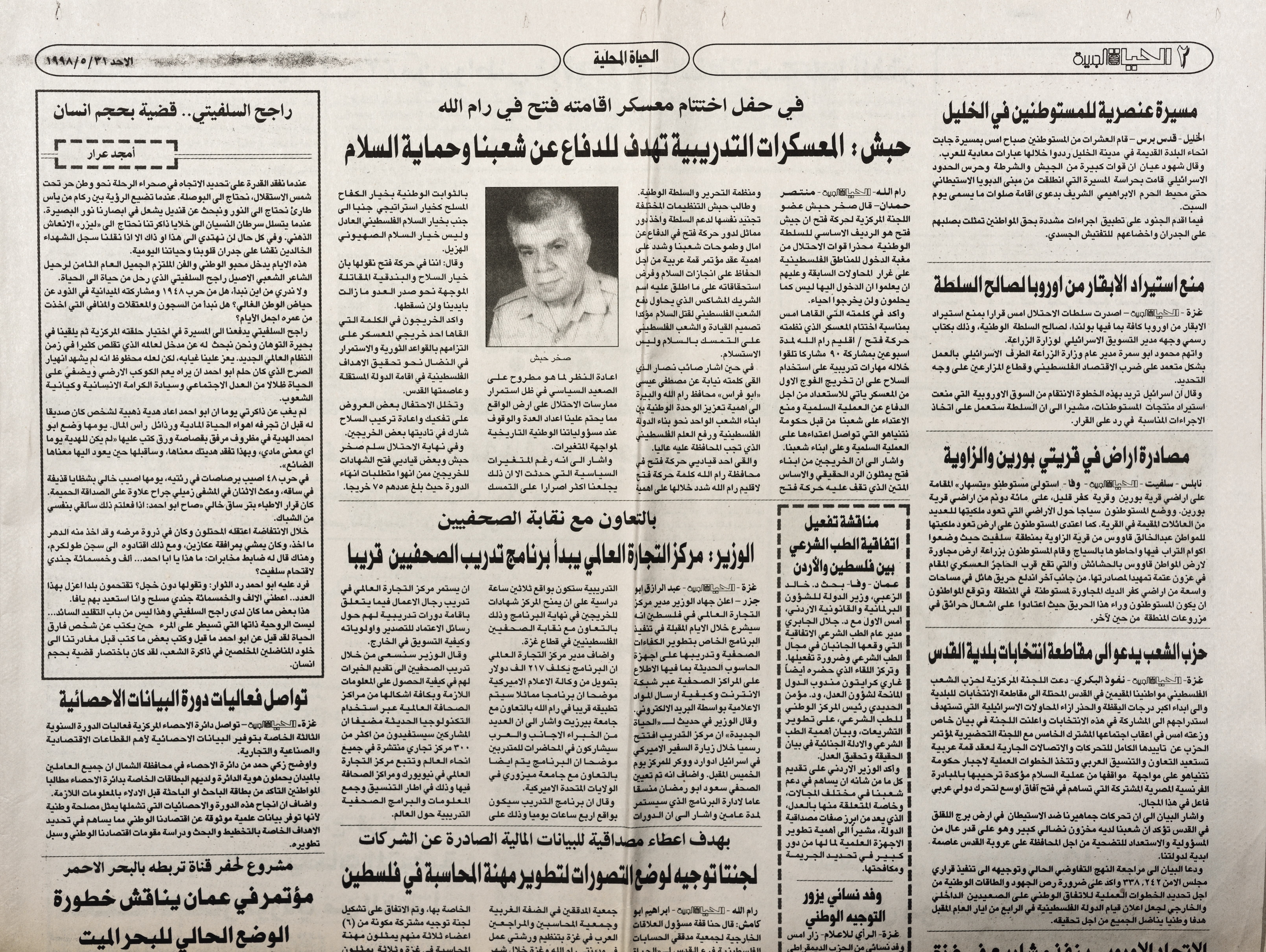 A document containing a bunch of pages from the Al-Hayat local newspaper, in which an article was published by Amjad Arar about Rajih al Salfeety. It describes the struggles of al Salfeety from 1948 until the date of his death.