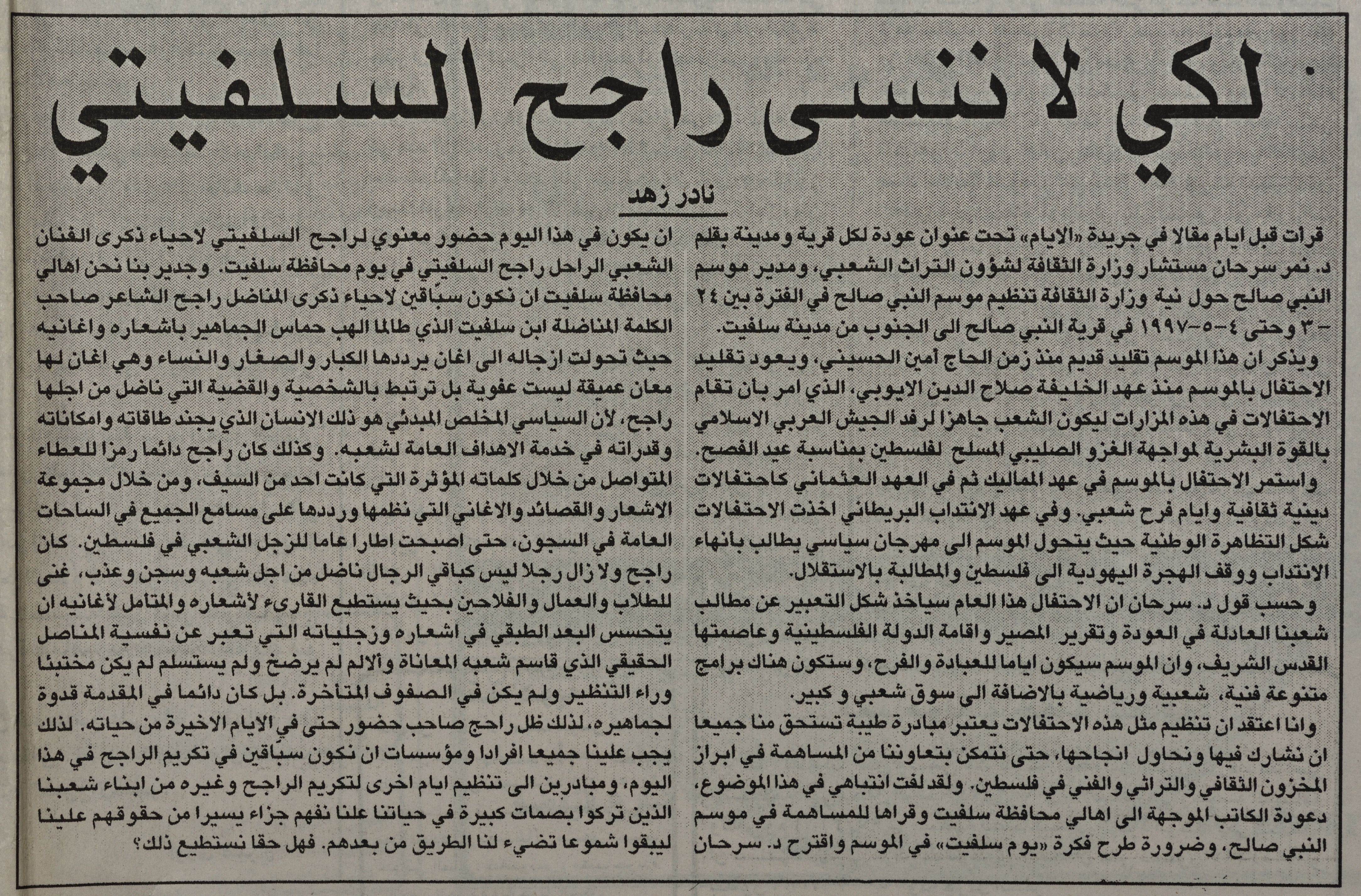 A document consisting of a bunch of pages from Al-Hayat Al-Jadida magazine, which includes an article on Rajih al Salfeety, titled "In order to not forget Rajih al Salfeety," written by journalist Nader Zehad, in which he mentioned the most important historical events in the life of Rajih al Salfeety