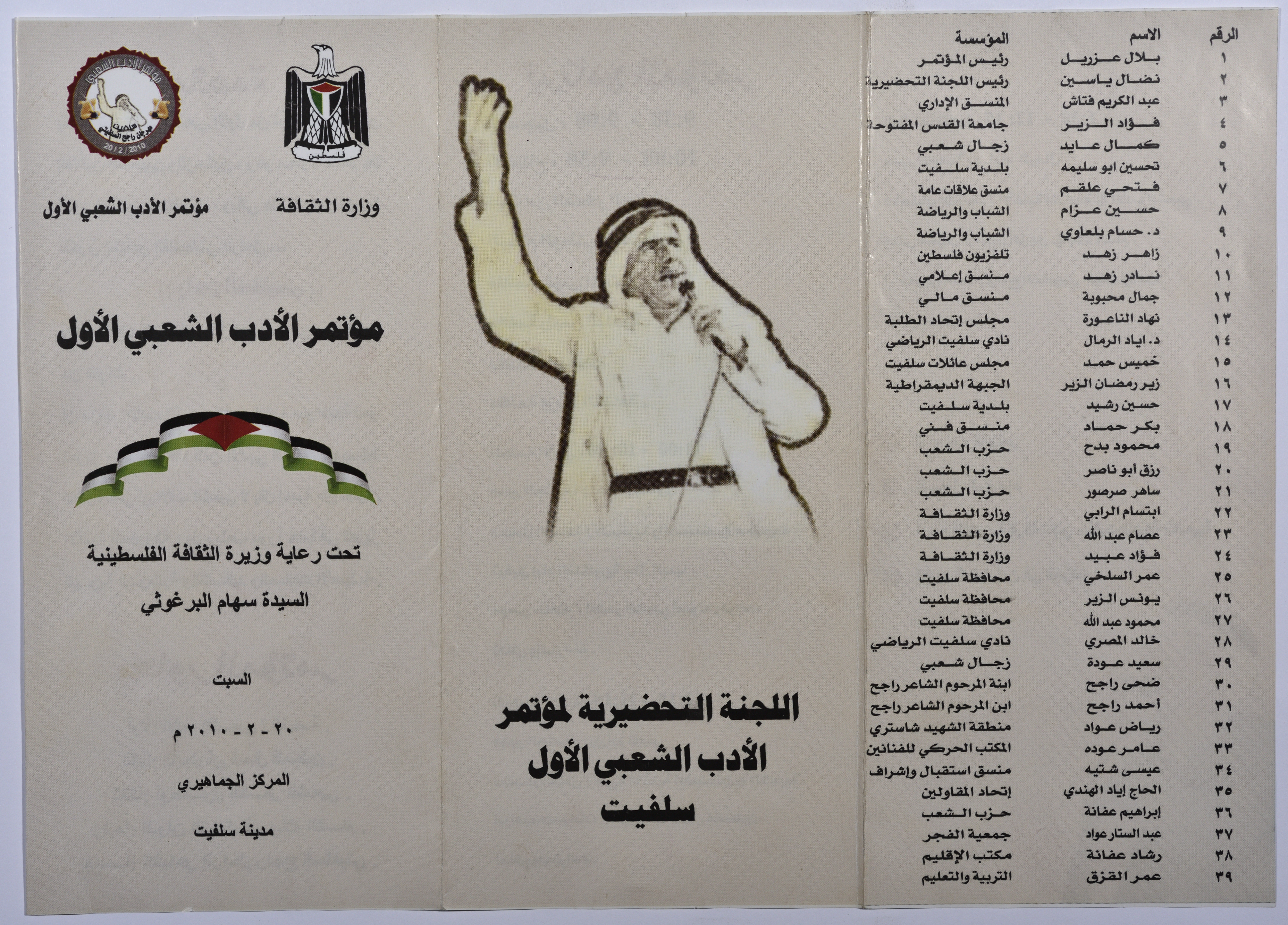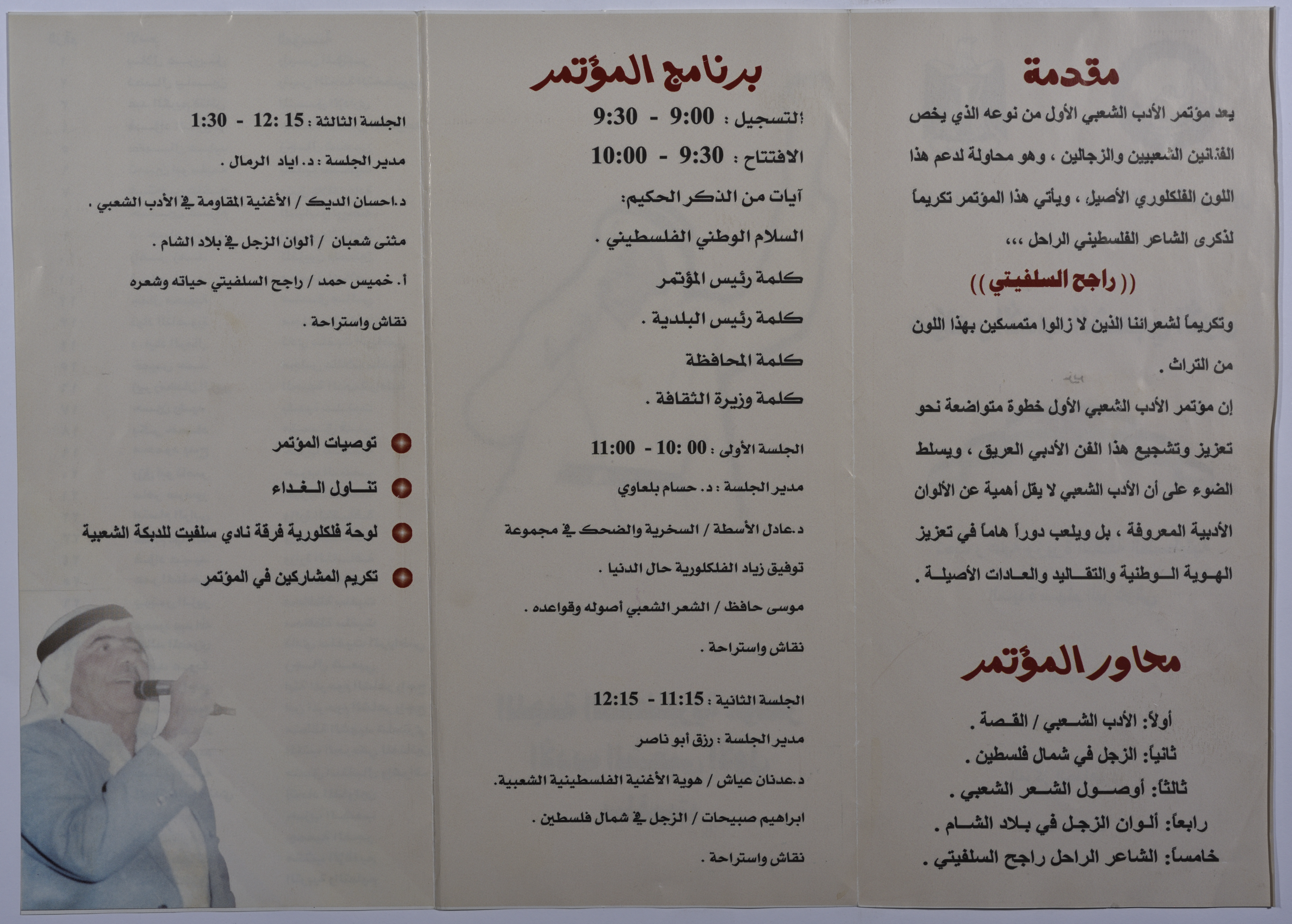 A one-page document containing the program of the First Popular Literature Conference held in Salfit in 20/2/2010, sponsored by the Ministry of Culture. The bulletin includes an overview of the conference, its location, the reason for its convening, the main themes of the conference and the agenda of the conference.