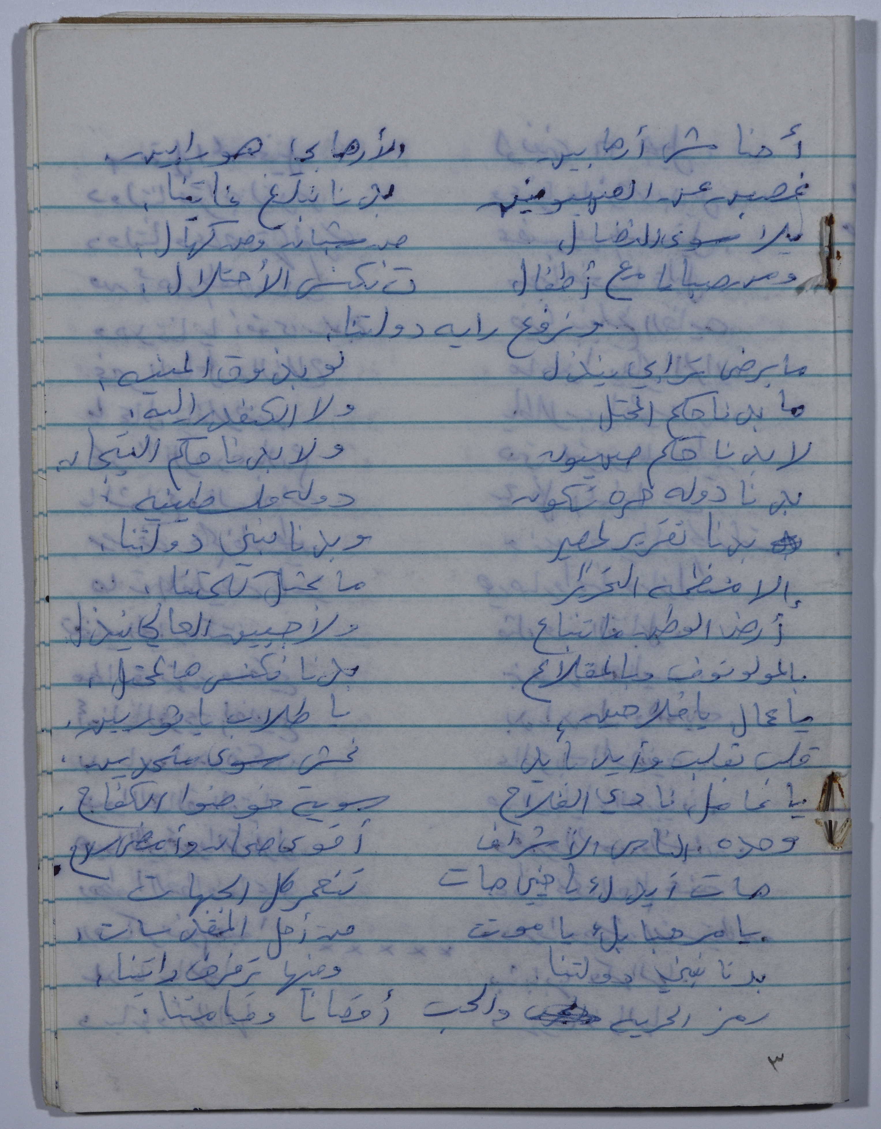 A one-page document containing the poem composed by Rajih al Salfeety, but written by his daughter, Duha, in her handwriting. The poem praises the Palestinian people and describes the struggle and persistence of these people. In addition to the heroic actions that they carried out during the Intifada such as throwing stones, igniting tires and confronting the occupation soldiers