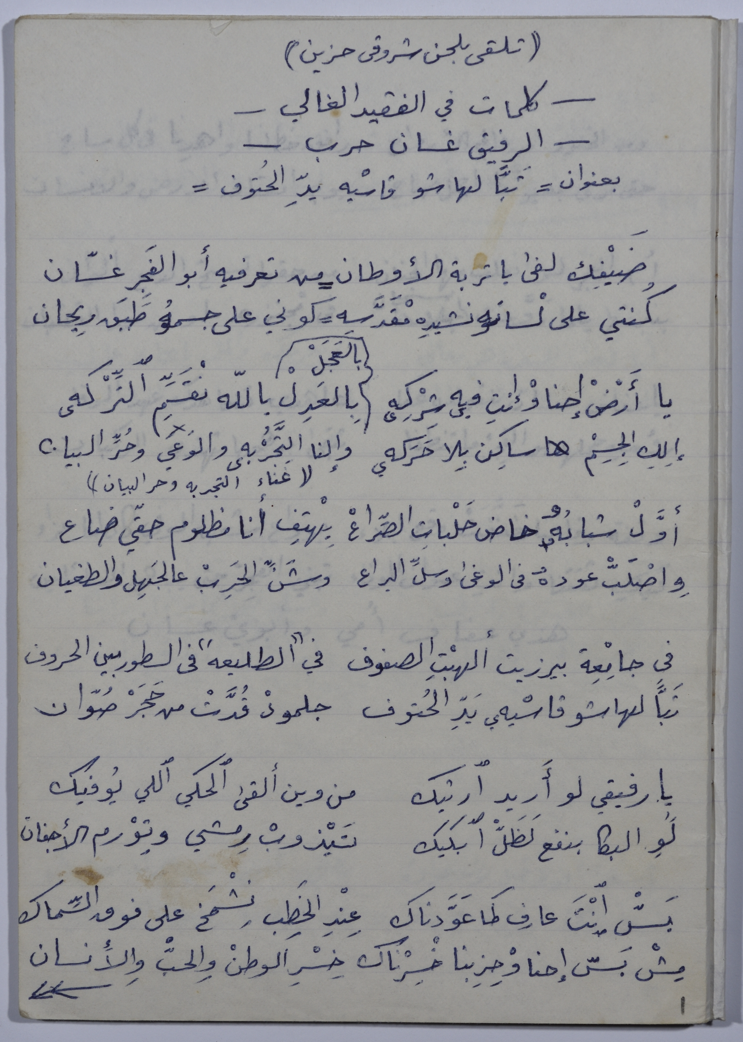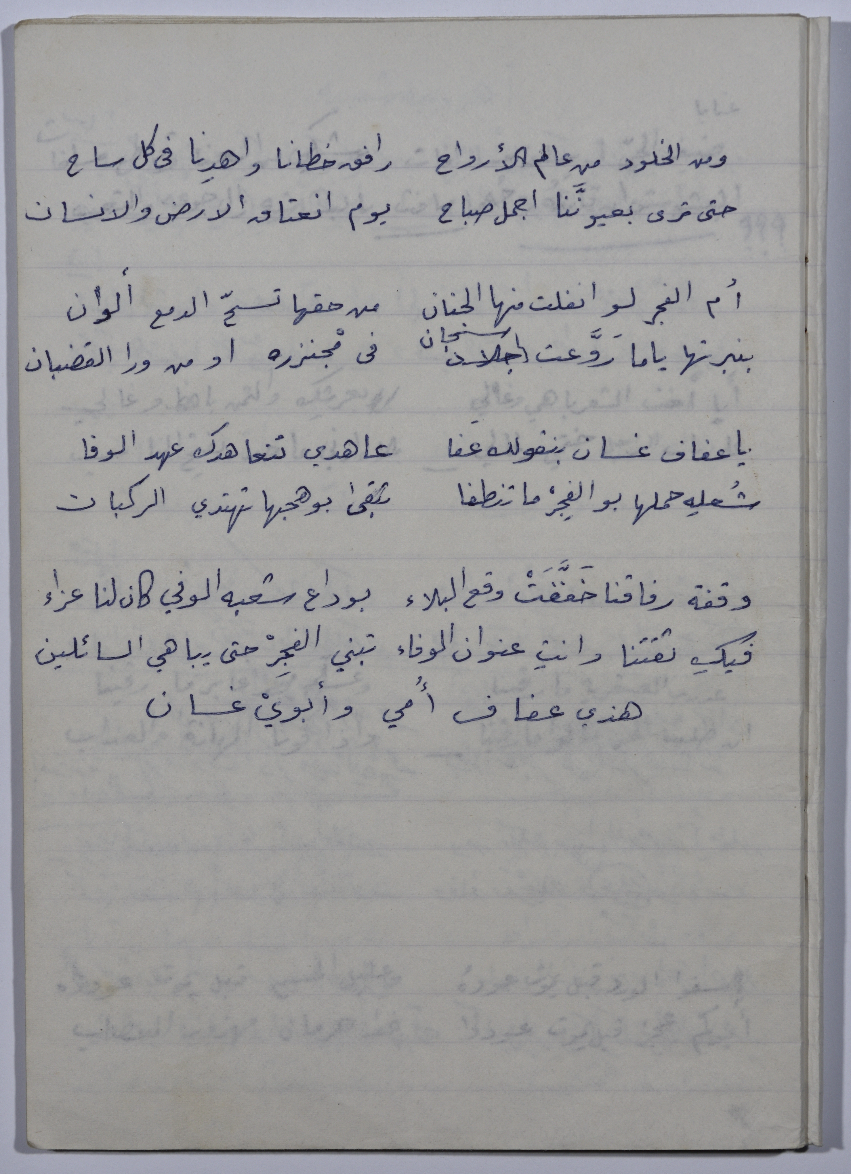 A two-page document, including a poem written by Rajih al Salfeety in his own handwriting, for his companion Ghassan Harb after his death. The document contains a description of the love that Ghassan Harb had for the land and the homeland; as it also explains his characteristics