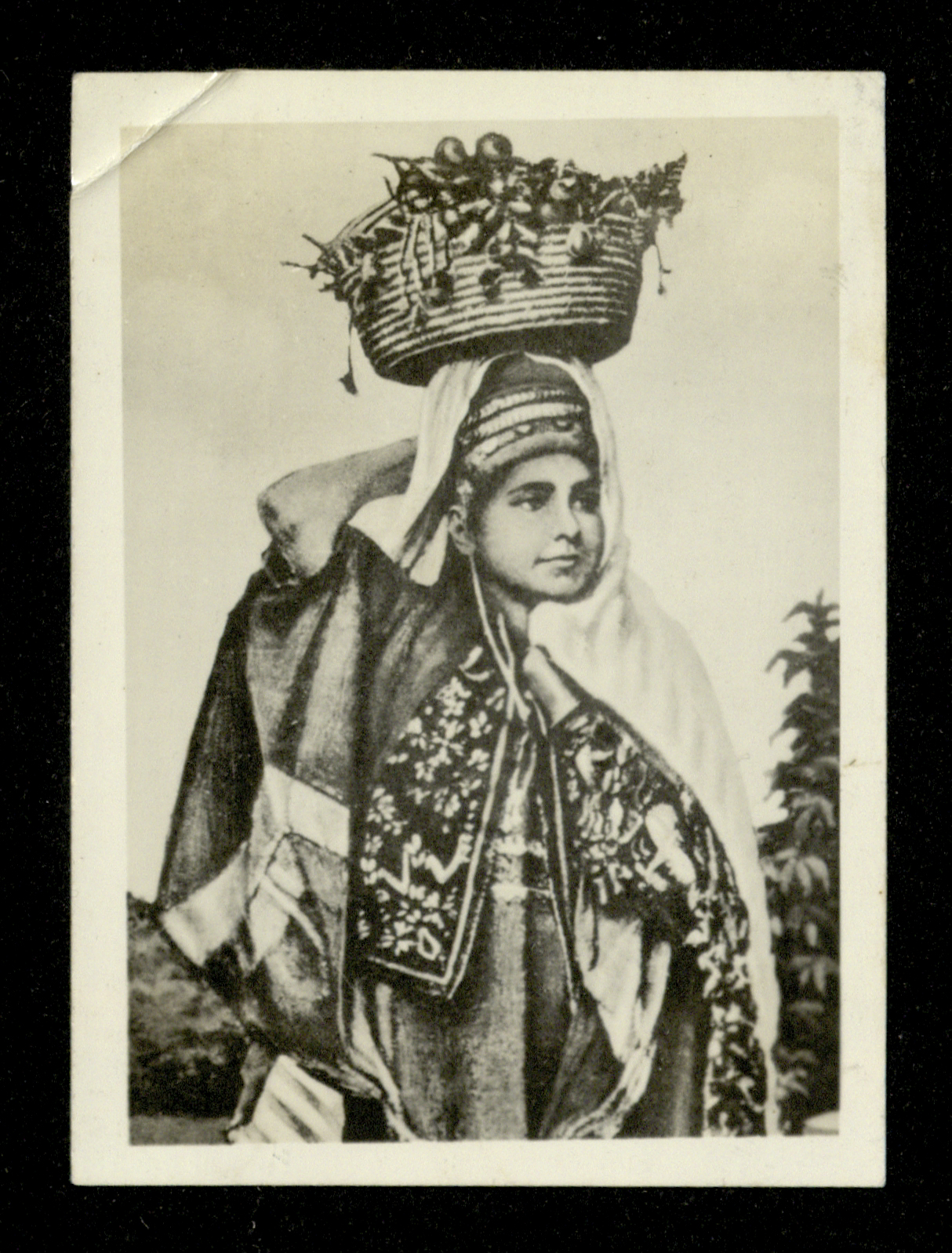 صورة لسيدة فلسطينية بالزي التقليدي للجليل وهي تحمل سلة من القش فيها ثمار خلال عملها في جني المحصول، التقطت في عشرينيات القرن العشرين.