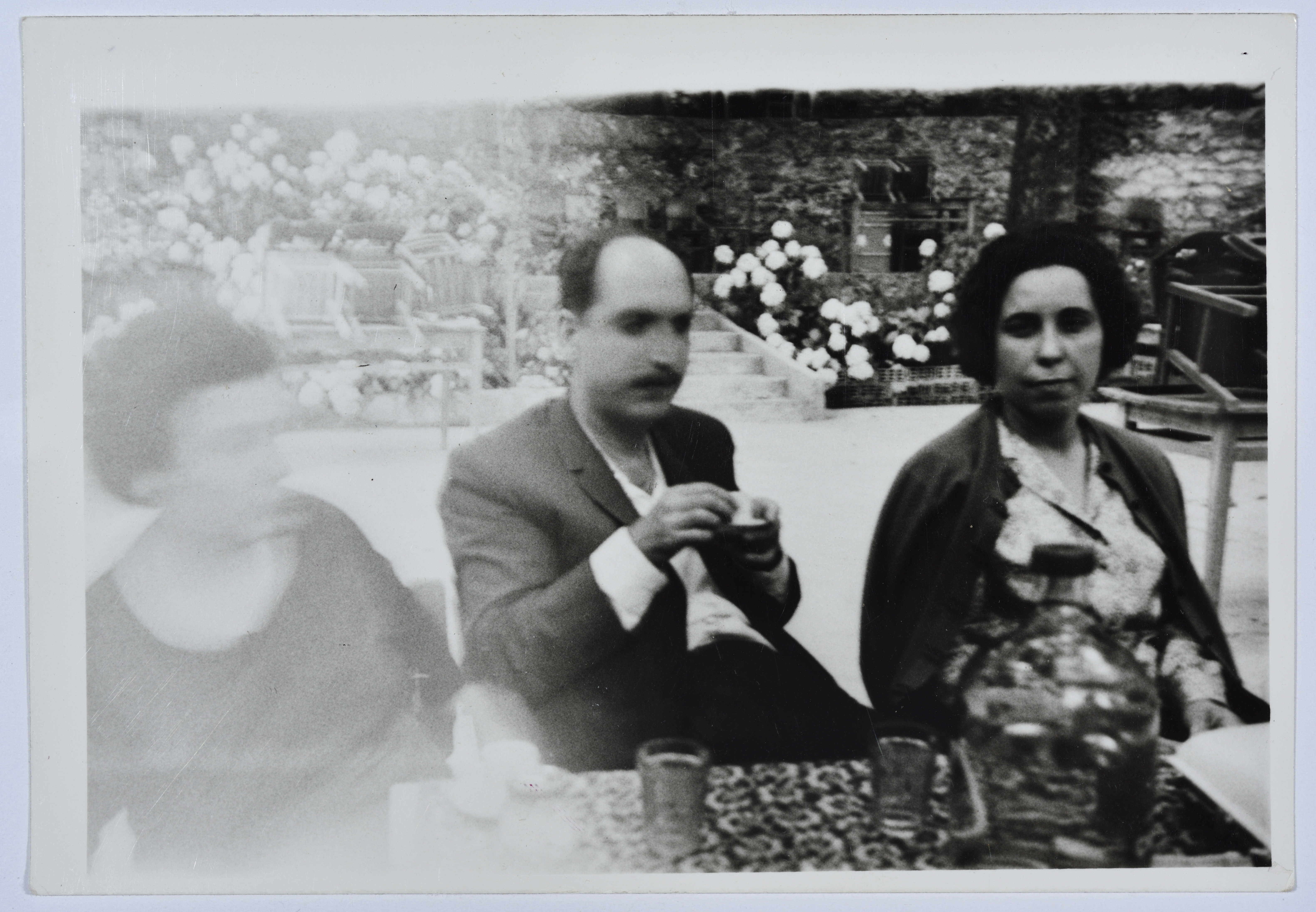 Found in the Mahira Dajani Collection, this photograph shows two girls and a man.
