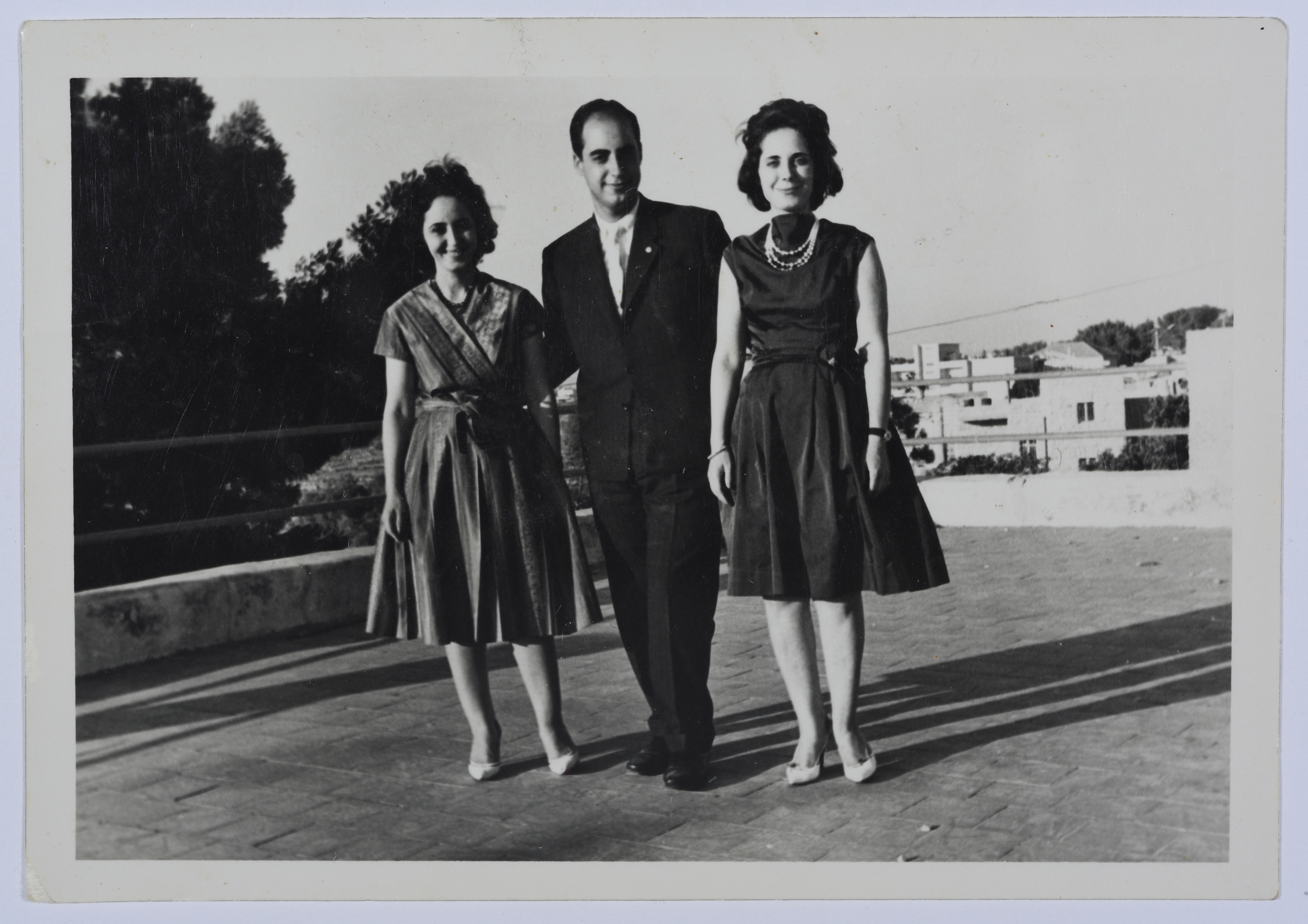 Found in the Mahira Dajani Collection, this photograph shows two girls and a man.