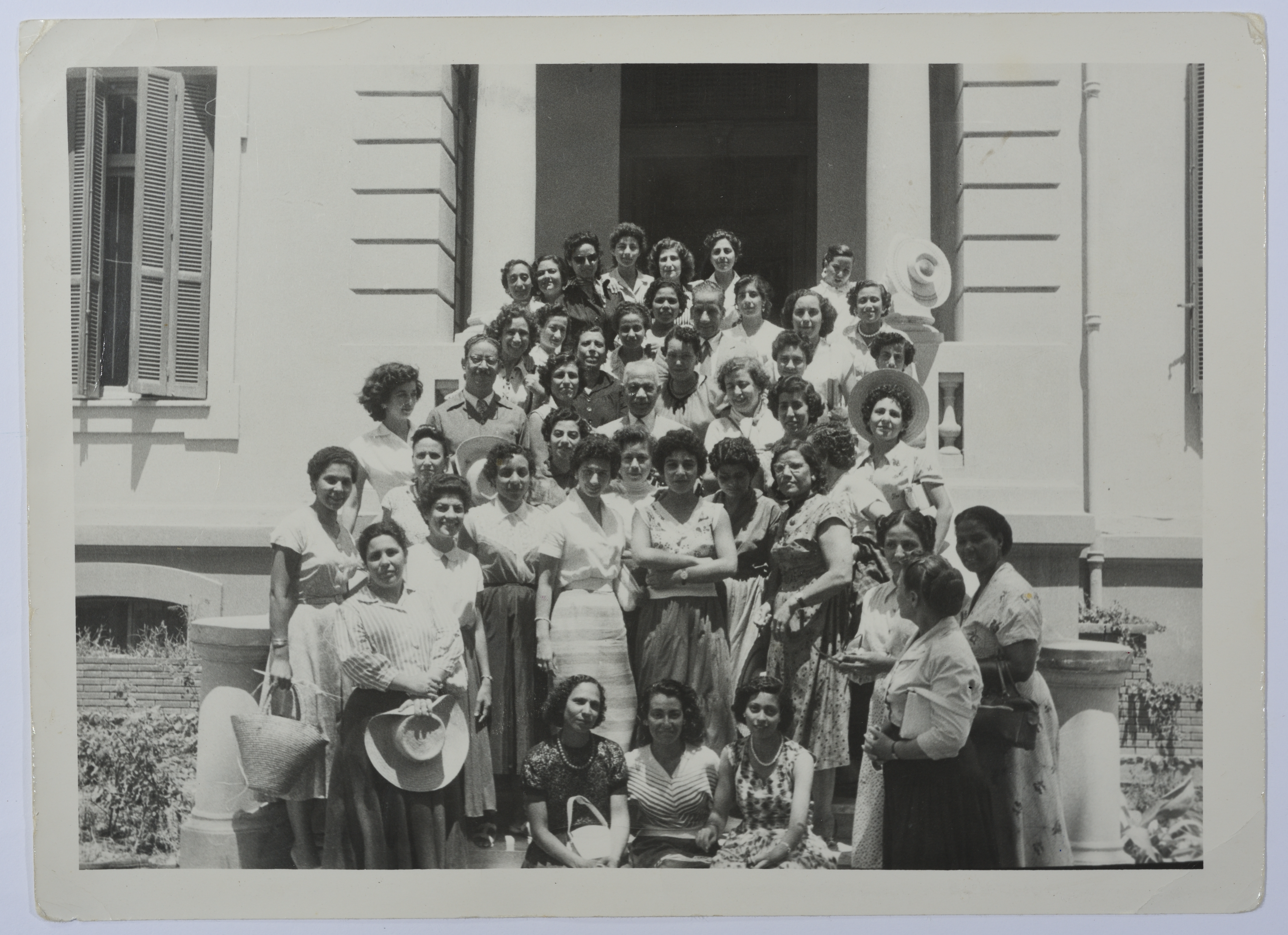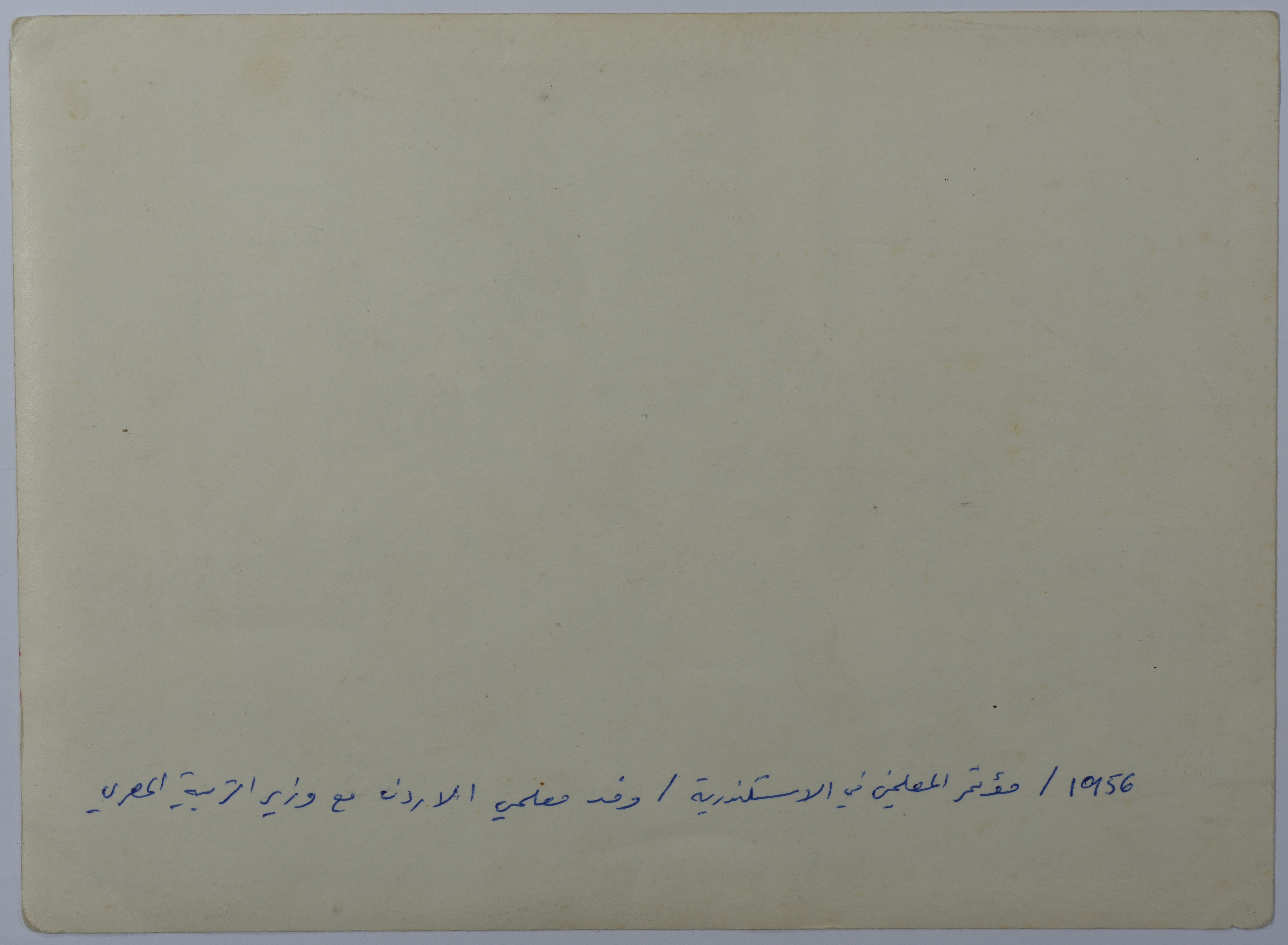 جانب من مؤتمر المعلمين في مدينة الإسكندرية المصرية عام 1956. يظهر في الصورة وفد معلمي الأردن مع وزير التربية المصري، وجدت الصورة في مجموعة ماهرة الدجاني.