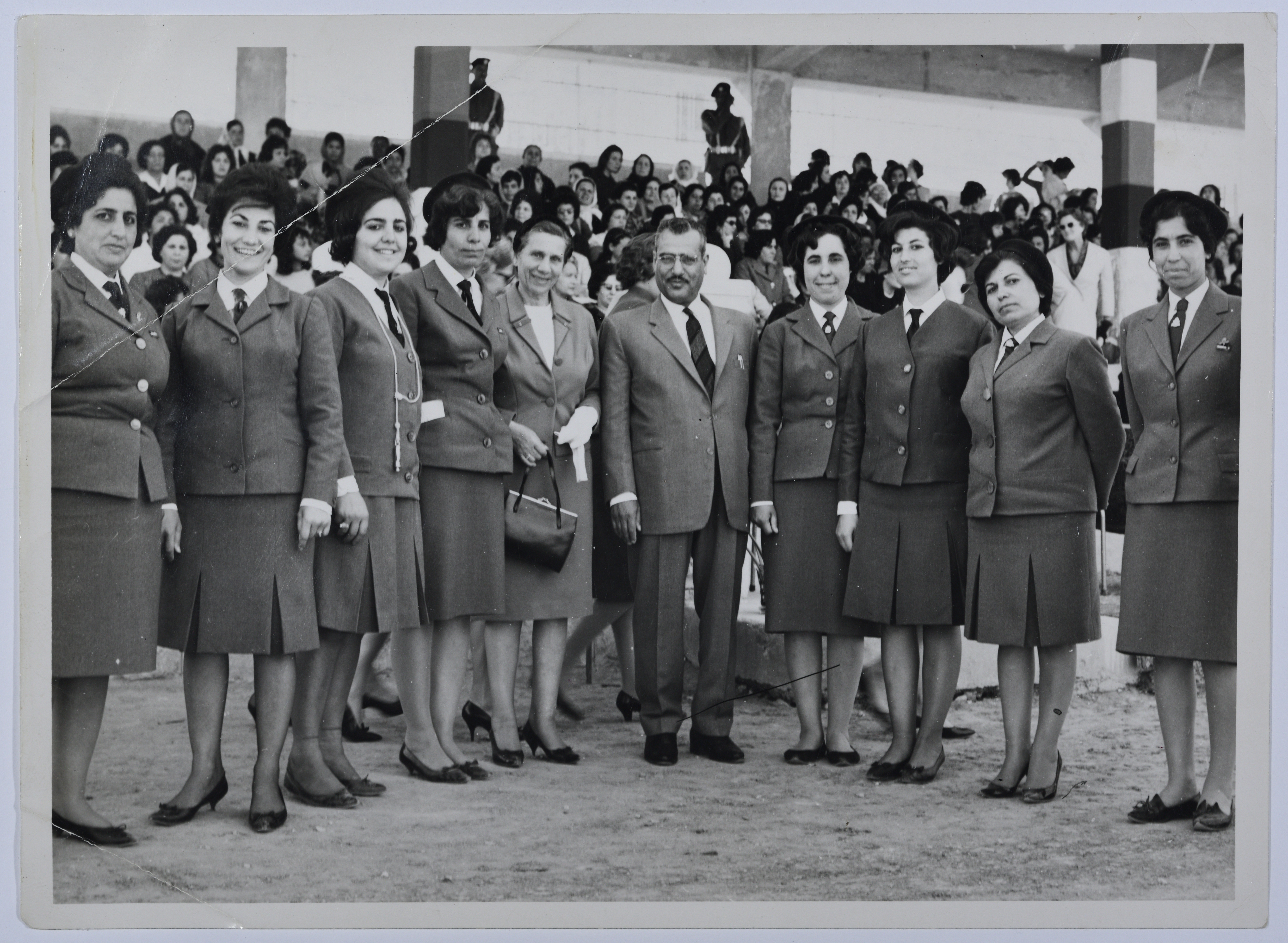 Taken in 1963, this photograph shows part of the Scout Guides' Festival in Jordan, including Hasan al-Kayed, Minister of Education, Mahira, Maisara and Hiba Dajani, Lamia Tbeileh, Mariam al-Bitar, Olga Wahbeh, Fayzeh al-Khatib, Amal Amarin, Sahab Shahin and Amina Du'eibes.
