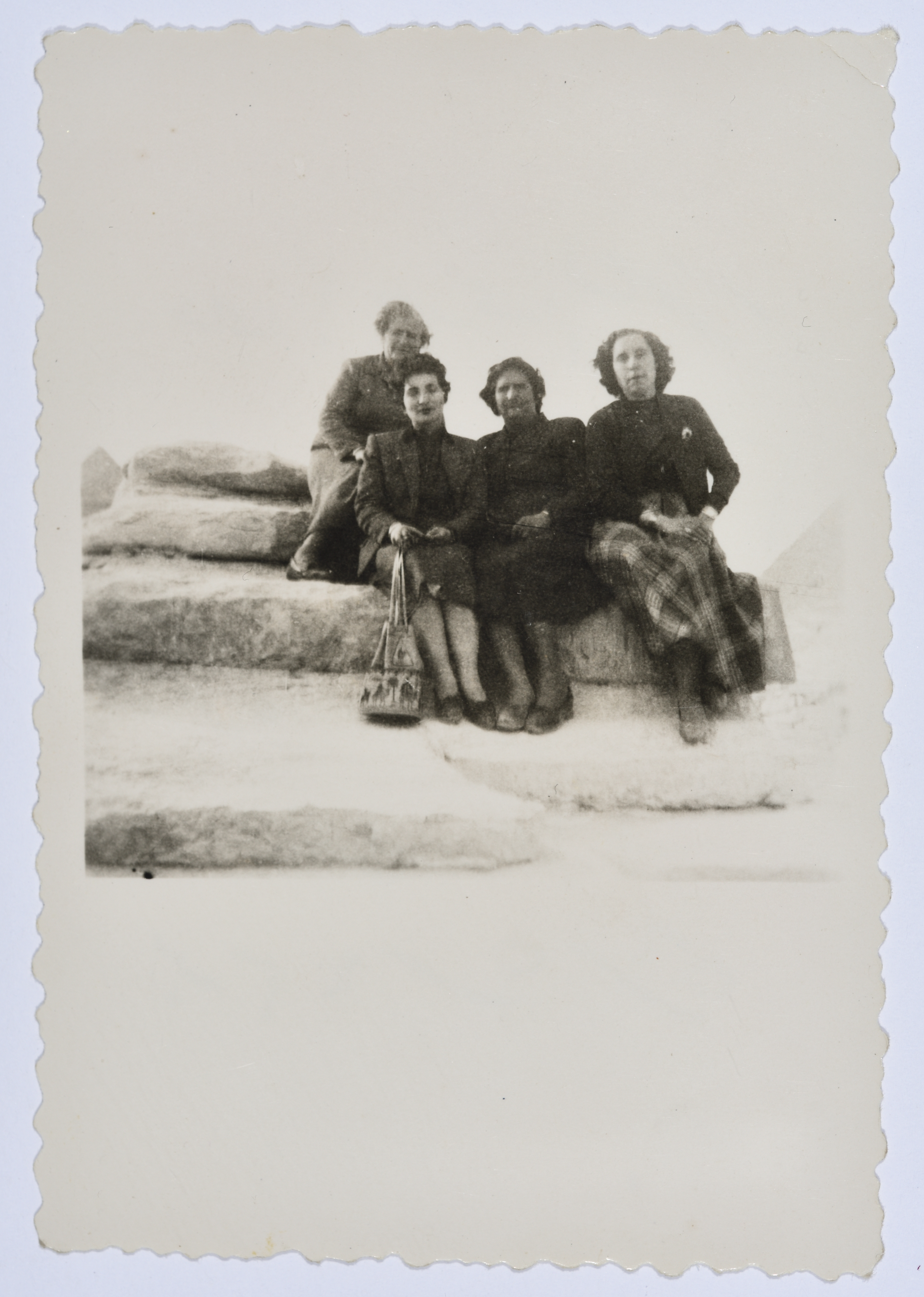Taken on 4 February 1956, this photograph shows Mahira Dajani, Jamileh Hanna, Helweh Qassis and Sylvia Aql in the area of the Giza pyramids near the Egyptian capital of Cairo.