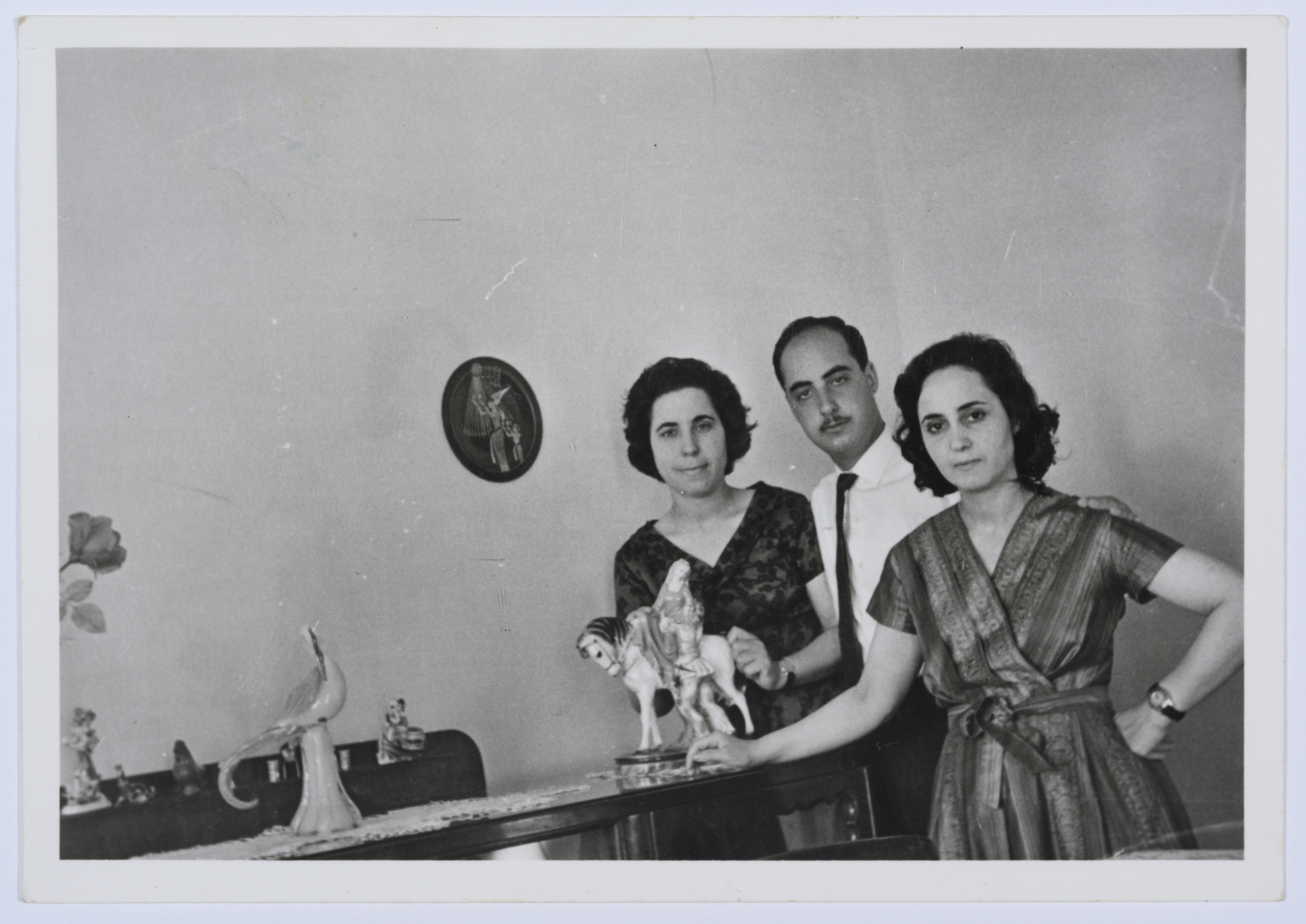 Found in the Mahira Dajani Collection, this photograph shows two girls and a man.