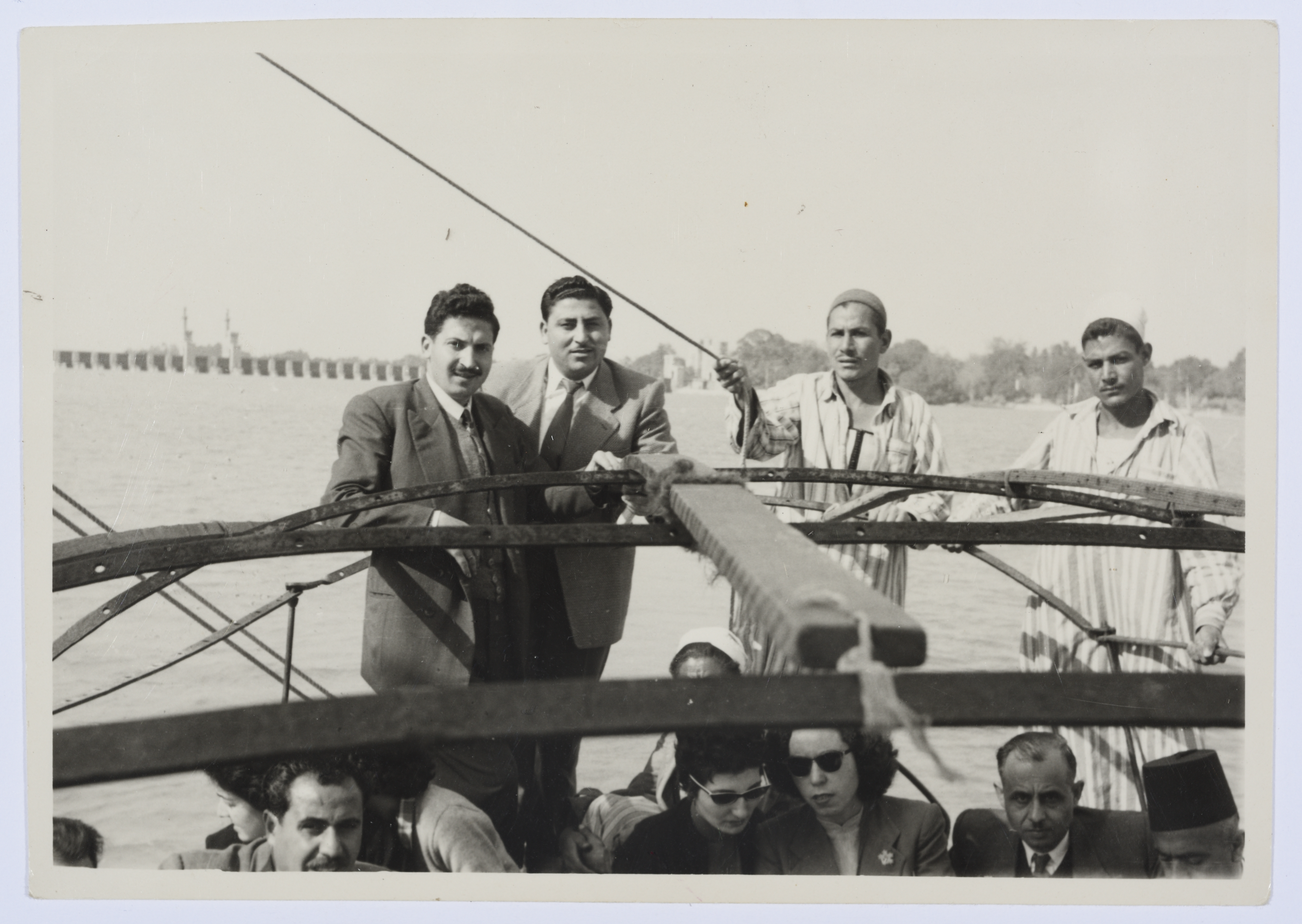 Found in the Mahira Dajani Collection, this photograph shows two girls and several men.