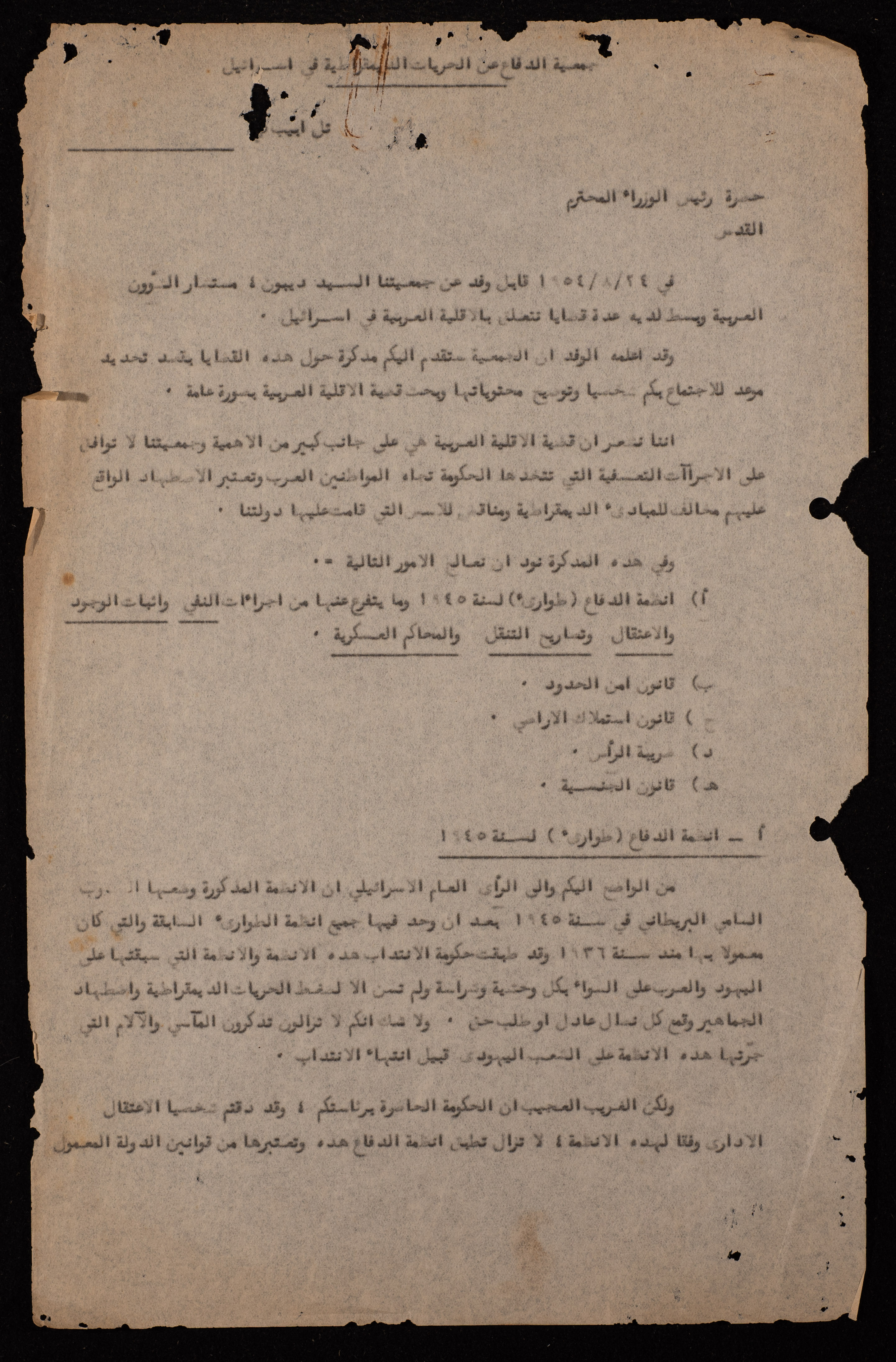 Sent on 24 August 1954, this document shows a letter from the Defense of Liberties and Democracies Association in Israel to the "Israeli" Prime Minister, which discussed the details of a meeting of a delegation from the Association with the Arab Affairs Adviser.
