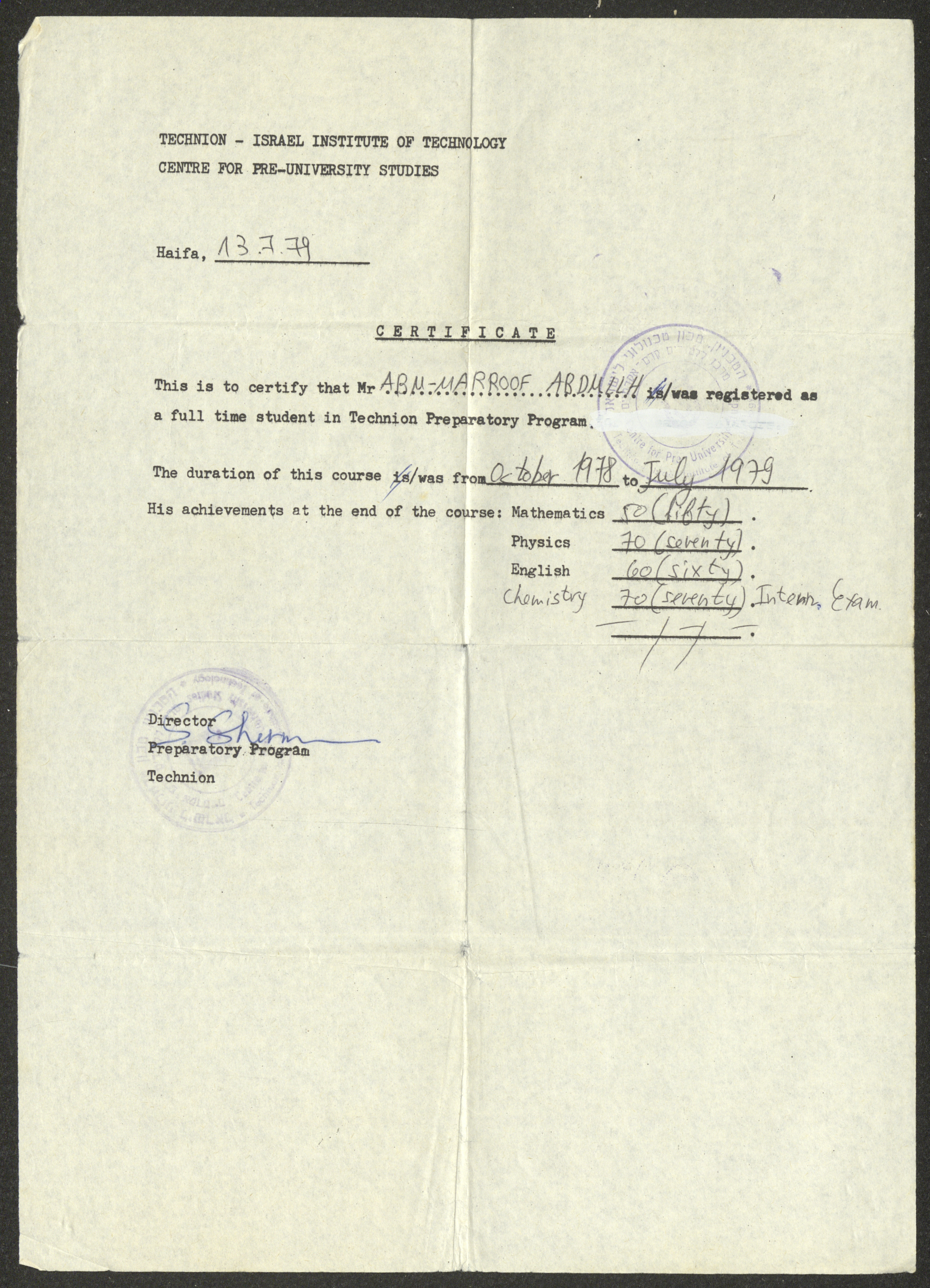 شهادة إثبات طالب باسم أبو معروف عبد الله، صدرت باللغة الإنجليزية عن "معهد إسرائيل للتكنولوجيا" بتاريخ 13 تموز 1979، وتشير إلى أنه سجل كطالب بدوام كامل في برنامج "التخنيون" التحضيري، حيث كانت مدة البرنامج تمتد من تشرين الأول 1978 حتى تموز 1979.