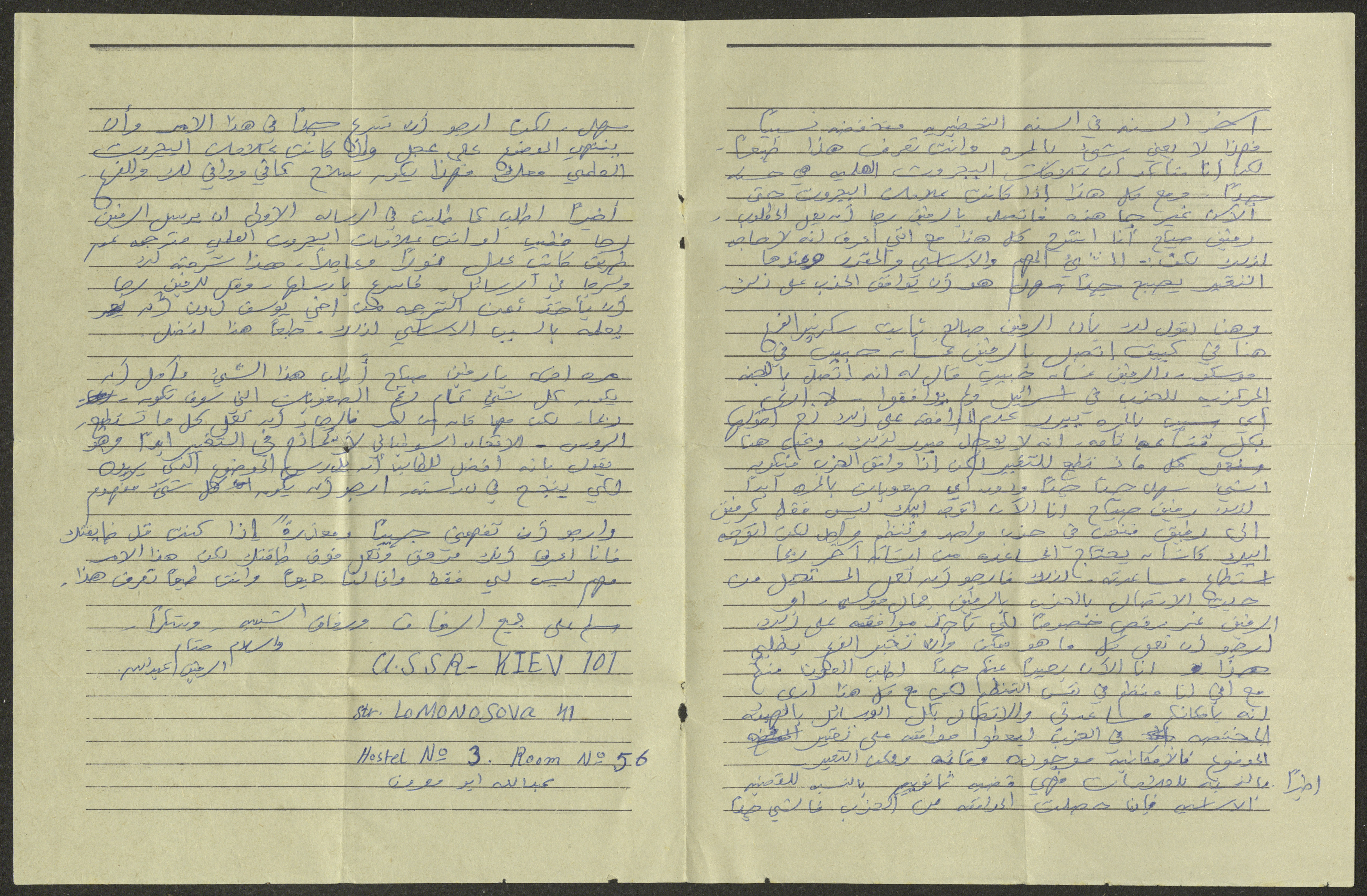رسالة مؤرخة في 18 تشرين الثاني 1979، أرسلها عبد الله أبو معروف المقيم في كييف إلى صيّاح كنعان، يطمئن فيها على أحواله وعائلته، ثم يطلب منه ترجمة علامته البجروت العلمي، حيث إنه اقتنع بتغيير تخصصه إلى الطب، ولكن اللجنة المركيزة للحزب رفضت طلبه، لذا فهو مستغرب ويطلب من الرفاق مساعدته لتحصيل الموافقة، طالبًا الاستعجال بالرد وإرسال العلامات مترجمة عن كاتب عدل.