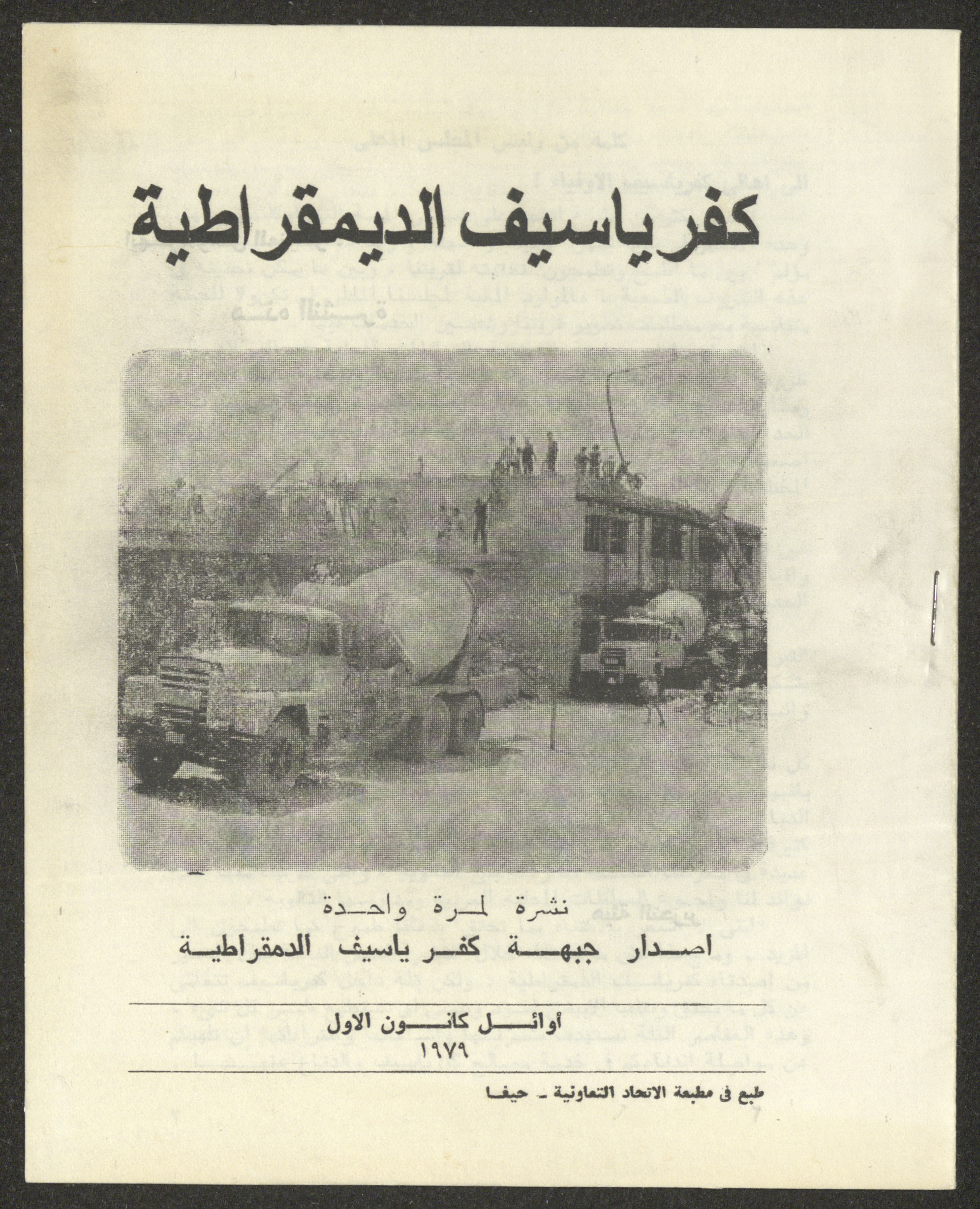 نشرة صادرة عن جبهة كفر ياسيف الديموقراطية في شهر كانون الأول عام 1979، بعنوان "كفر ياسيف الديموقراطية" وهي من طباعة مطبعة الاتحاد التعاونية في حيفا.