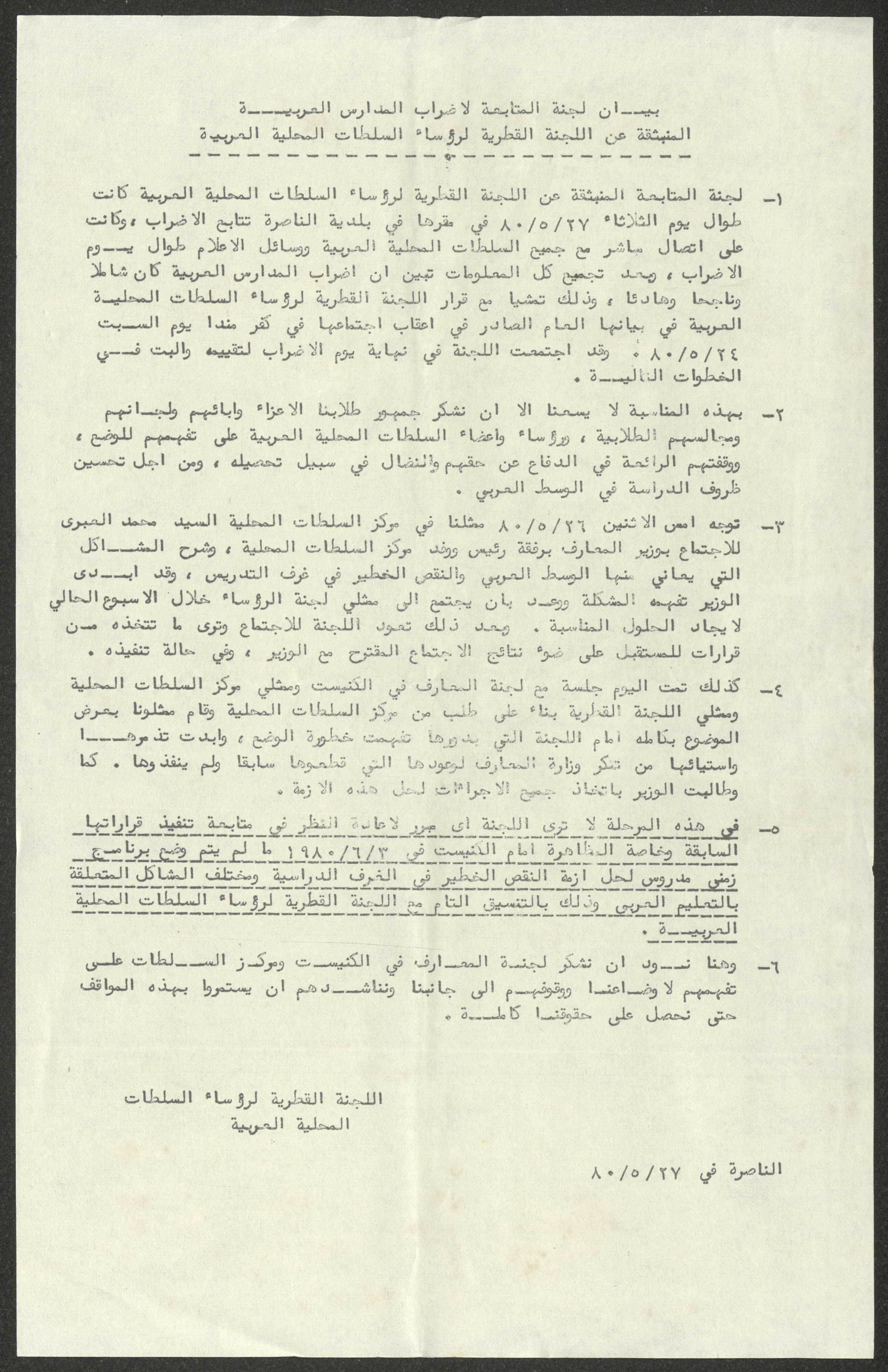 بيان مؤرخ في 27 أيار 1980، أصدرته لجنة المتابعة لإضراب المدارس العربية المنبثقة عن اللجنة القطرية لرؤساء السلطات المحلية العربية، جاء فيه أن الإضراب كان شاملًا وناجحًا وهادئًا، معبرين عن شكرهم للطلاب وآبائهم ولجانهم ومجالسهم الطلابية، ورؤساء أعضاء السلطات المحلية العربية، مشيرين إلى أن ممثلهم محمد العبري قد توجه في 26 أيار للاجتماع بوزير المعارف برفقة رئيس ووفد مركز السلطات المحلية، لشرح المشاكل التي يعاني منها قطاع التعليم العربي.