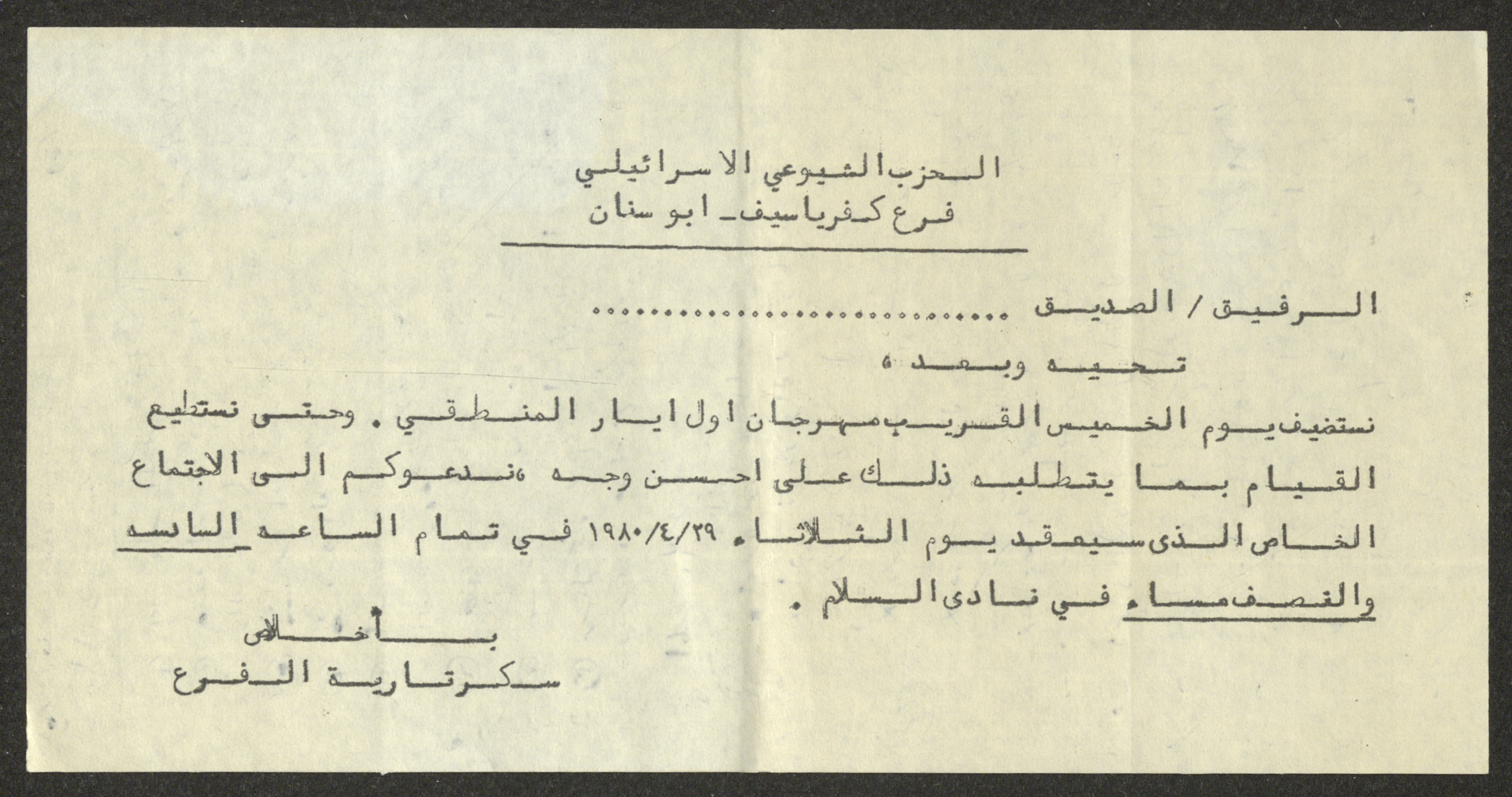 دعوة لحضور اجتماع التحضير لمهرجان أول أيار المنطقي بتاريخ 29 نيسان 1980 في نادي السلام، صدرت عن الحزب الشيوعي الإسرائيلي.