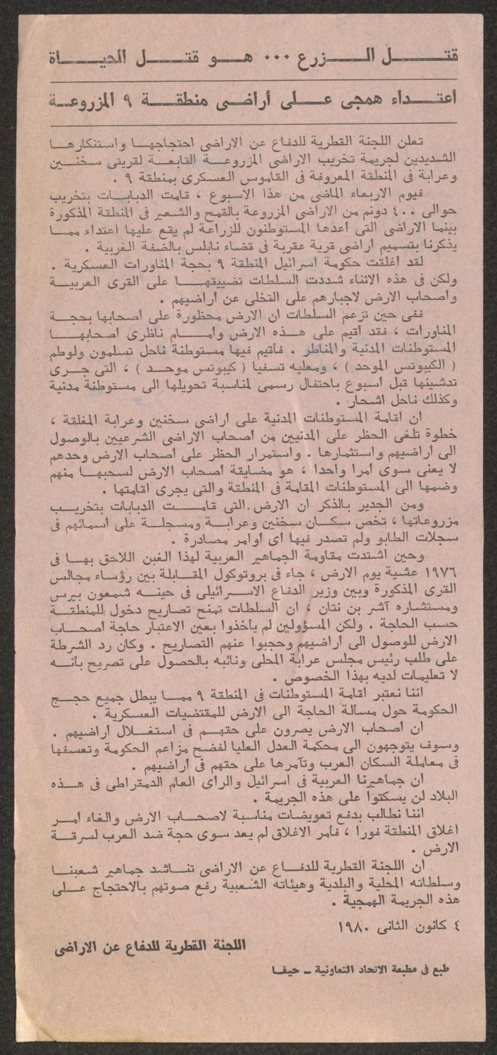 بيان صدر عن اللجنة القطرية للدفاع عن الأرض بتاريخ 4 كانون الثاني 1980، عنوانه "قتل الزرع هو قتل الحياة، اعتداء همجي على أراضي منطقة 9 المزروعة"، أعلنت فيه اللجنة استنكارها الشديد لجريمة تخريب الأراضي المزروعة التابعة لقريتي سخنين وعرابة، حيث خرَّبت الدبابات حوال 400 دونم من الأراضي المزروعة بالقمح والشعير، بينما الأراضي التي أعدّها المستوطنون لم يقع عليها أي اعتداء، وعلى ظهر الإعلان كُتبت بخط اليد قرارات وموضوعات تحت عنوان "مجلس كفر ياسيف يطالب بضم كل أراضي القرية لمنطقة نفوذه".