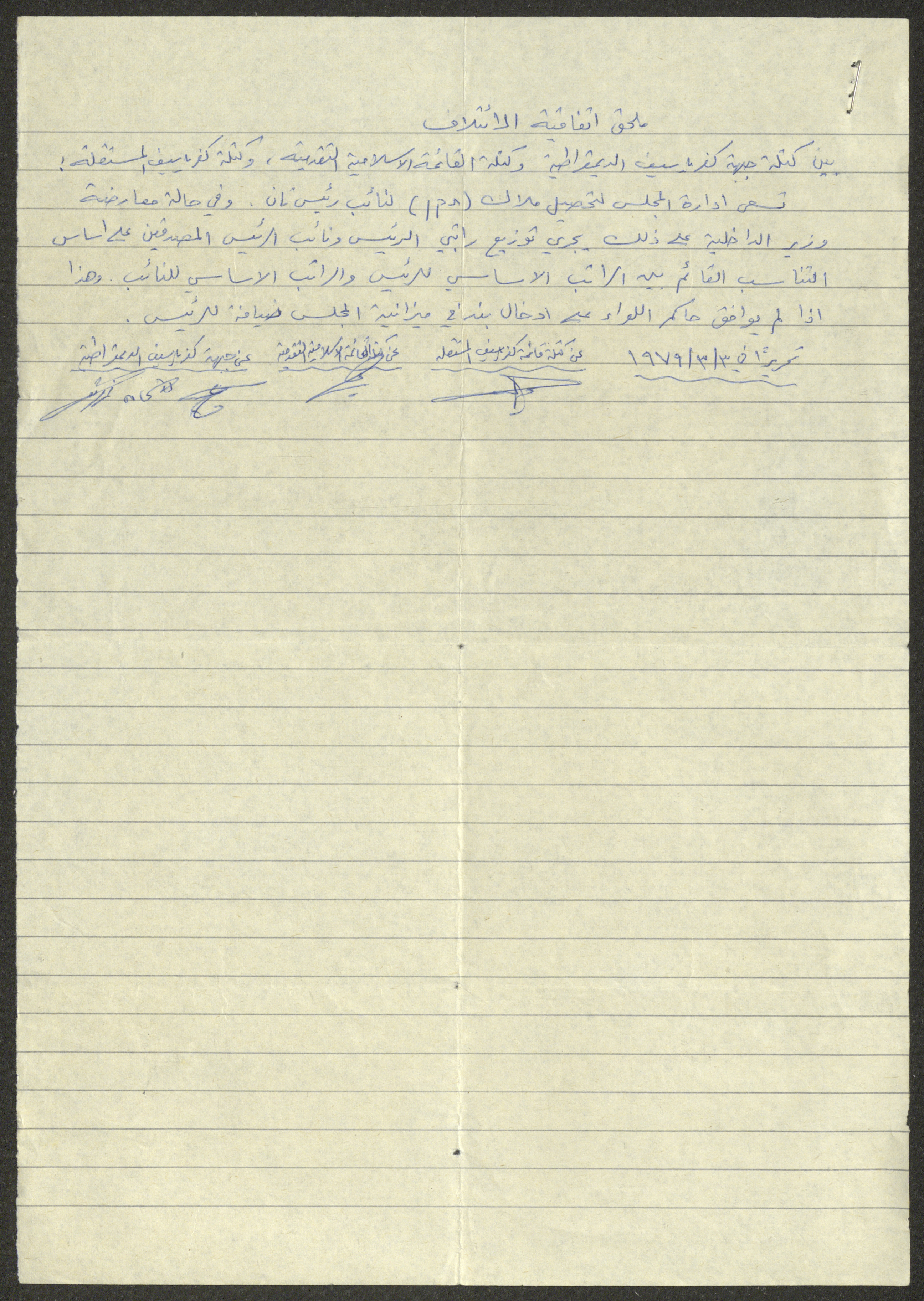 ملحق اتفاقية الائتلاف بين كتلة جبهة كفر ياسيف الديموقراطية وكتلة القائمة الإسلامية التقدمية وكتلة كفر ياسيف المستقلة، صدر بتاريخ 3 أيار 1979، وفيه يطلبون من وزير الداخلية إجراء بعض التعديلات في الوظائف.