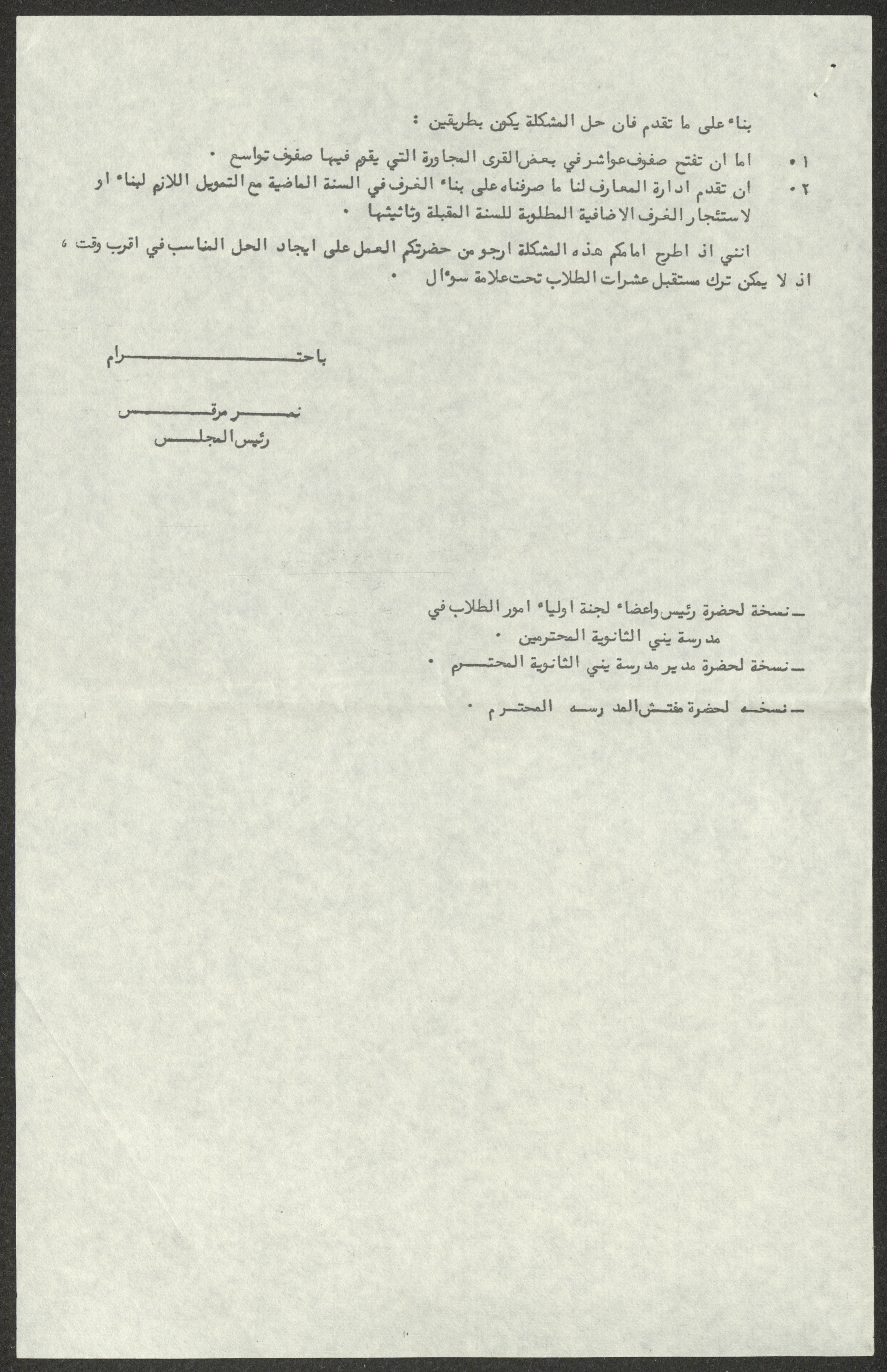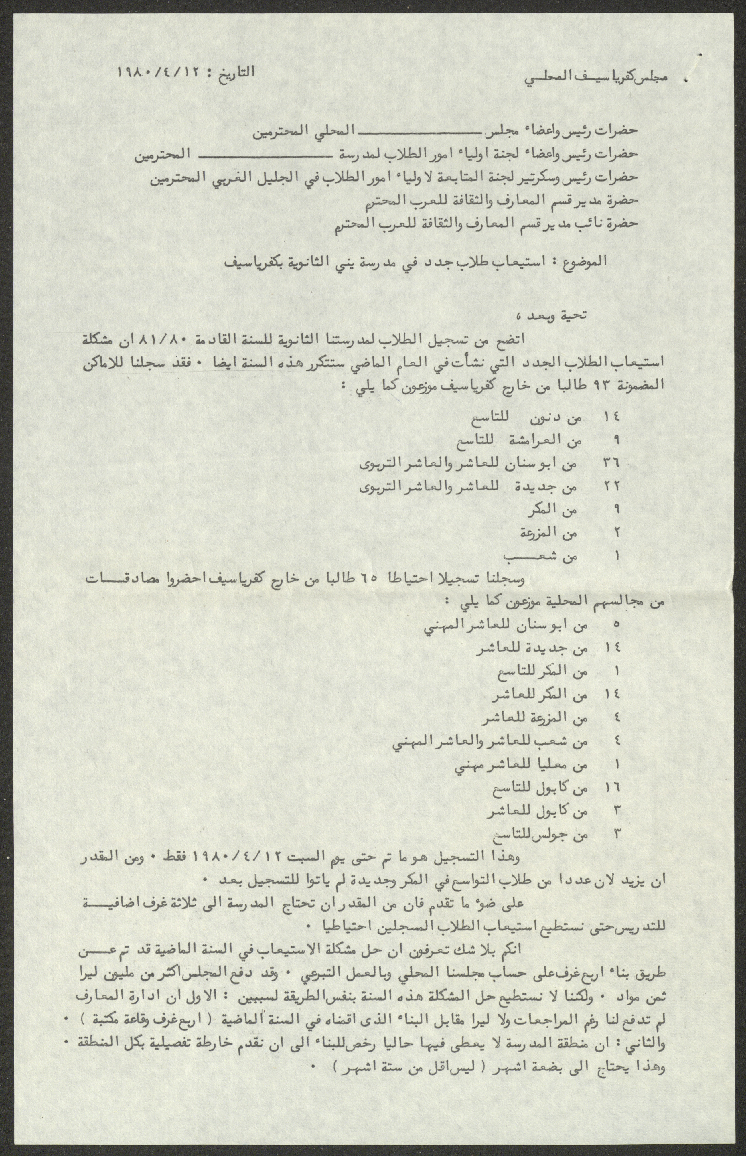 كتاب مؤرخٌ في 12 نيسان 1980، وجهه نمر مرقس رئيس مجلس محلي كفر ياسيف إلى رئيس وأعضاء المجلس وأولياء الأمور ولجنة المتابعة لأولياء أمور الطلاب في الجليل الغربي ومدير قسم المعارف والثقافة للعرب ومدير قسم المعارف والثقافة ونائبه، يتحدث فيه حول مشكلة استيعاب طلاب جدد في مدرسة يني يني الثانوية للسنة الدراسية 1980-1981، مقترحًا بعض الحلول المناسبة لهذه المشكلة، ومضيفًا أنه بانتظار ردهم بخصوص الحل المناسب.