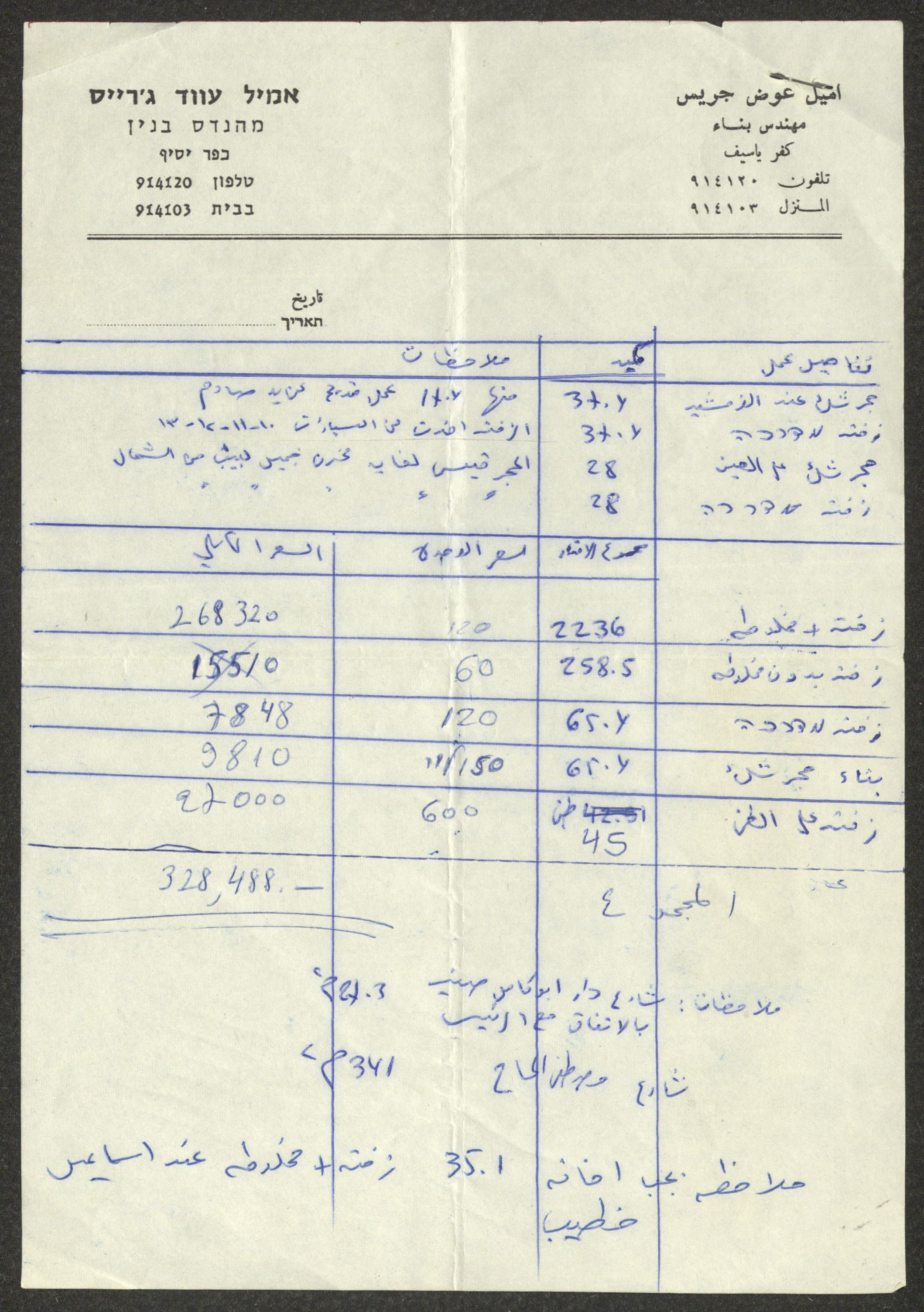 جدول بتفاصيل أعمال البناء في منطقة كفر ياسيف، صدر عن مهندس البناء إميل عوض جريس، يظهر فيه أماكن البناء والمساحة المربعة وتفاصيل حول العمل وتاريخه، وعلى ظهرالورقة جمعت التكاليف الخاصة بهذه الأعمال.