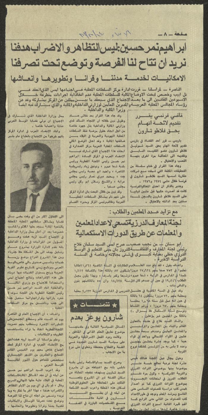 قصاصة من جريدة الأنباء مؤرخة في 14 آب 1981، يظهر فيها مقال بعنوان "إبراهيم نمر حسين: ليس التظاهر والإضراب هدفنا نريد أن تتاح لنا الفرصة وتوضع تحت تصرفنا الإمكانيات لخدمة مدننا وقرانا وتطويرها وإنعاشها"، حيث قررت إدارة مركز السلطات المحلية في اجتماعها، الذي عُقد في مستعمرة "تل أبيب" لبحث الأوضاع المالية للسلطات المحلية، عدم اتخاذ أي إجراءات متطرفة إلى ما بعد الاجتماع الذي سيعقد ما بين ممثلين عن المركز بمشاركة وفد عن رؤساء المجالس المحلية العربية والوزراء والمديرين العامين في وزارتي الداخلية والمالية.